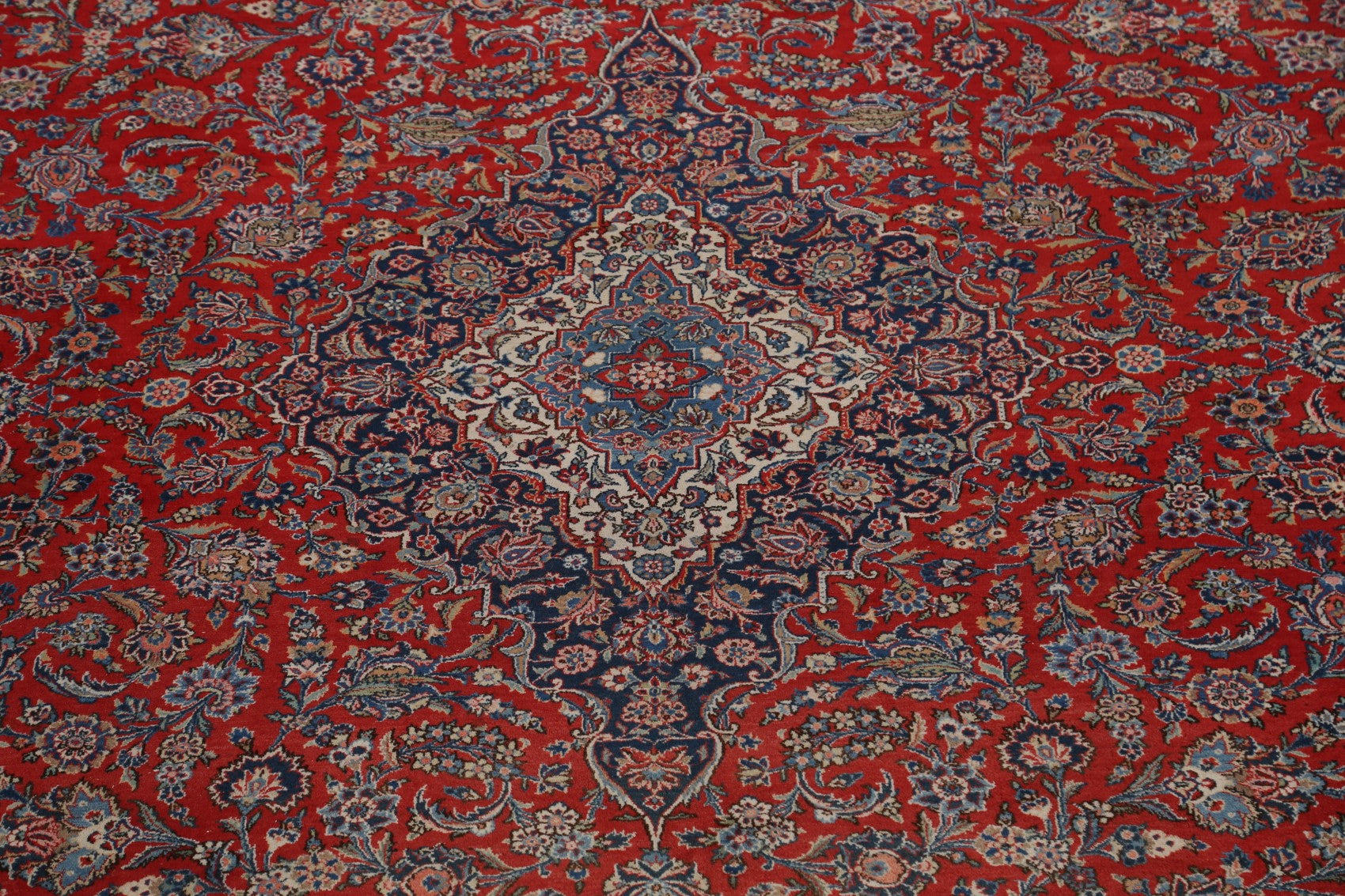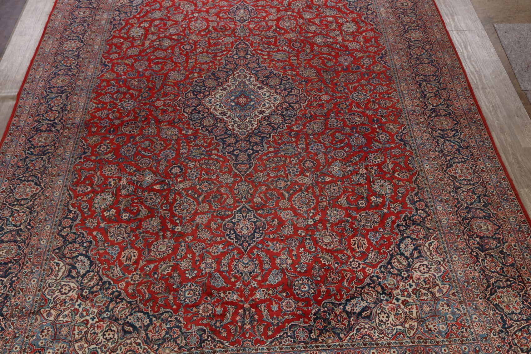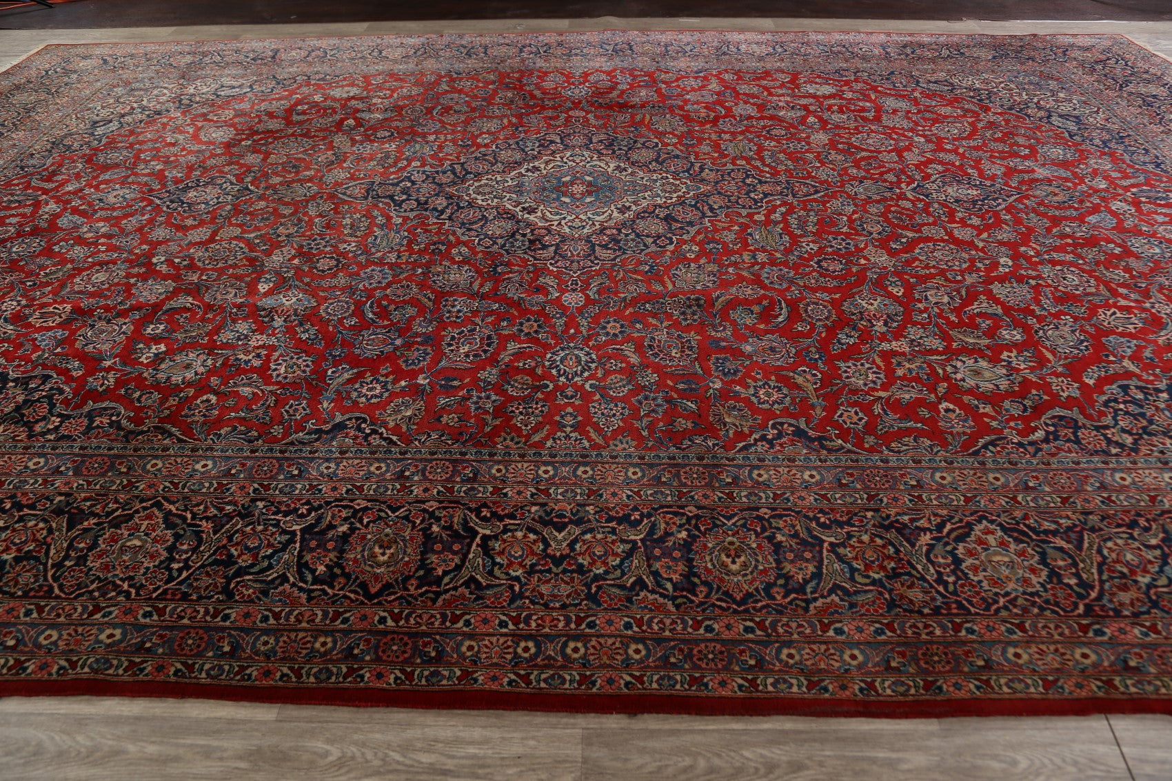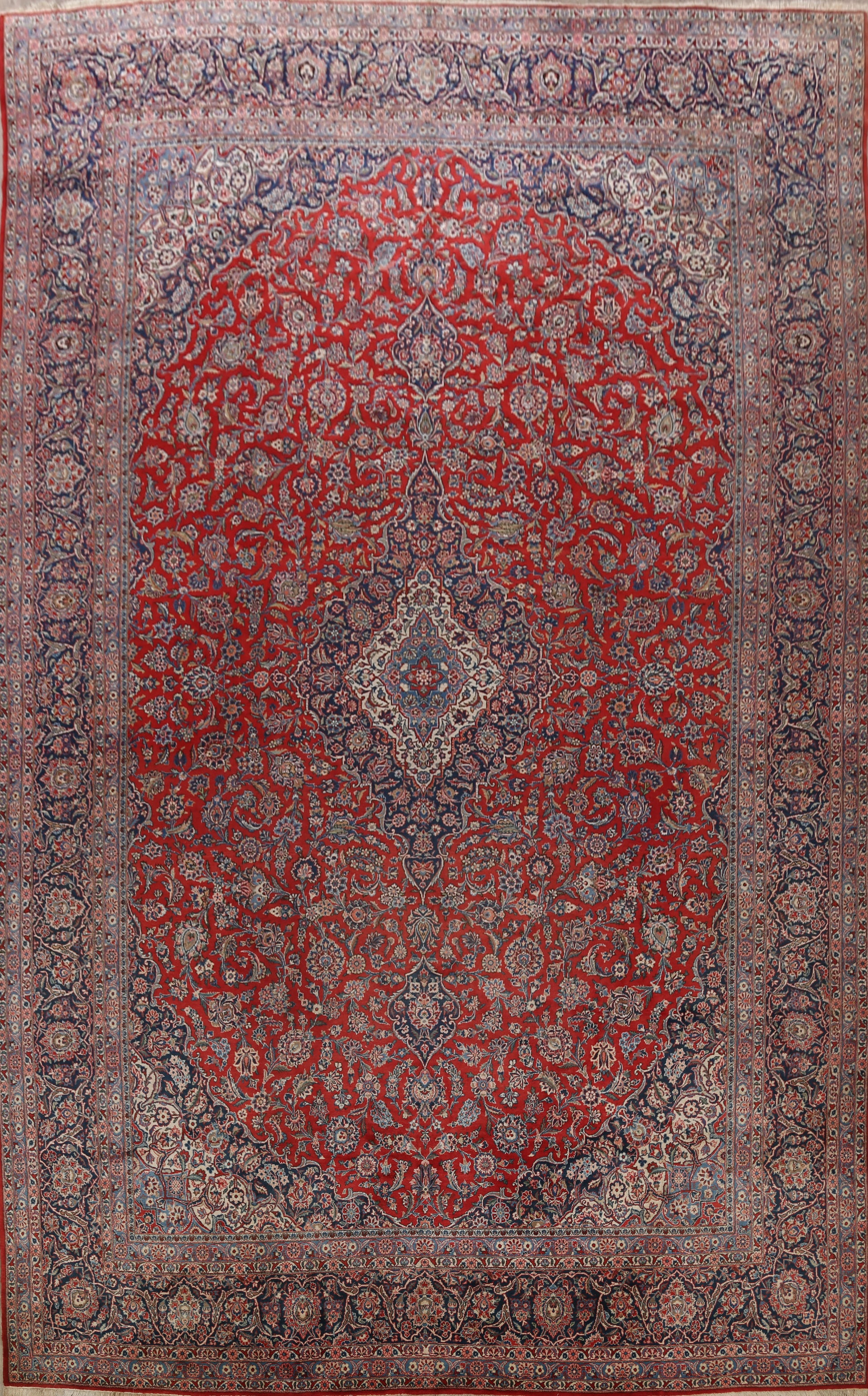 A Beautiful Genuine Persia ( Persia ) Kashan (Dabir) rug is Hand Knotted by skillful weavers in Persia ( Persia ) with Kork Wool Material. This rug is in Very Good condition. dimensions are 16' 10'' X 11' 4'' in foot and 513 X 345 in centimeter. the primary color is Red.