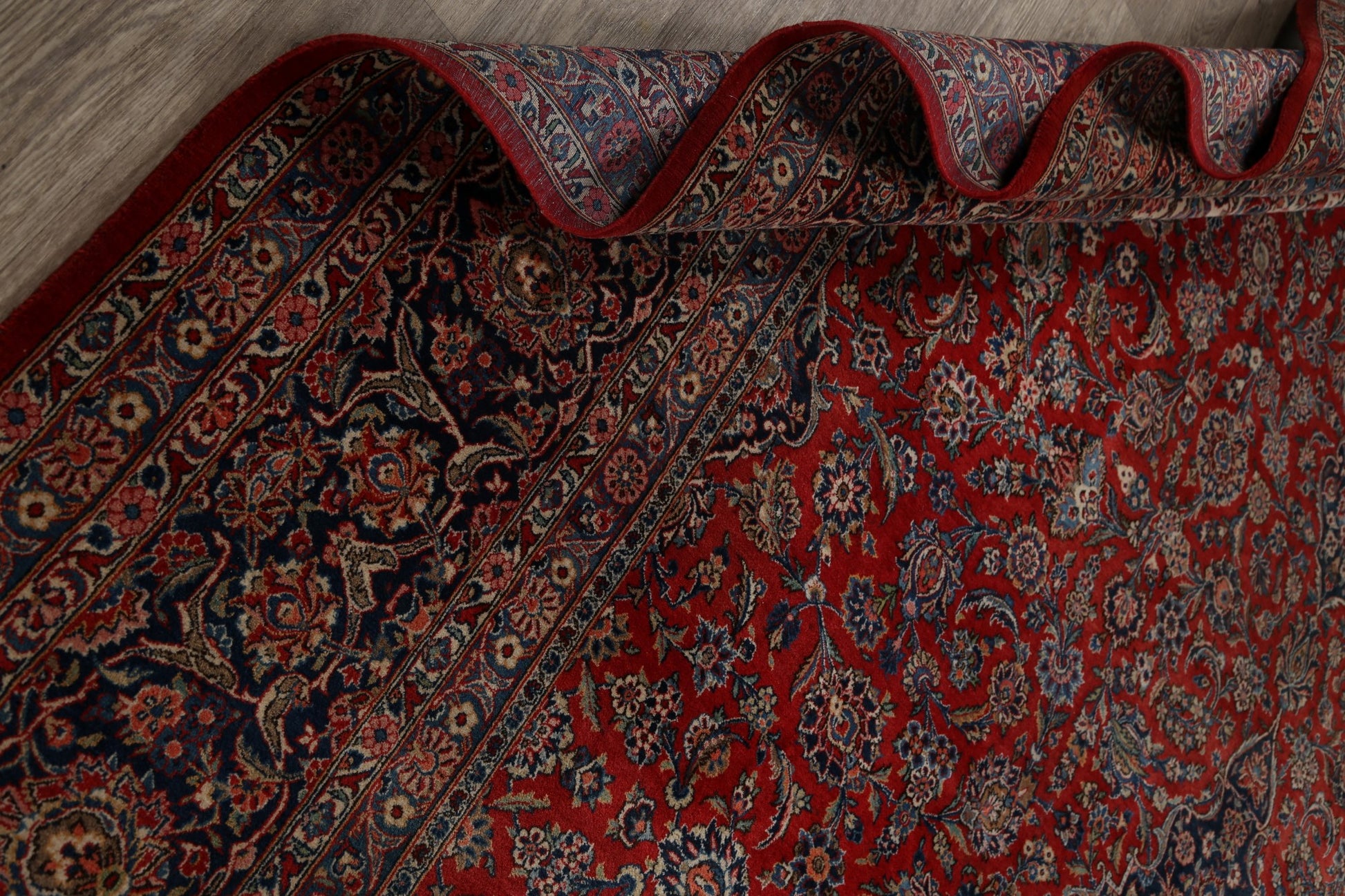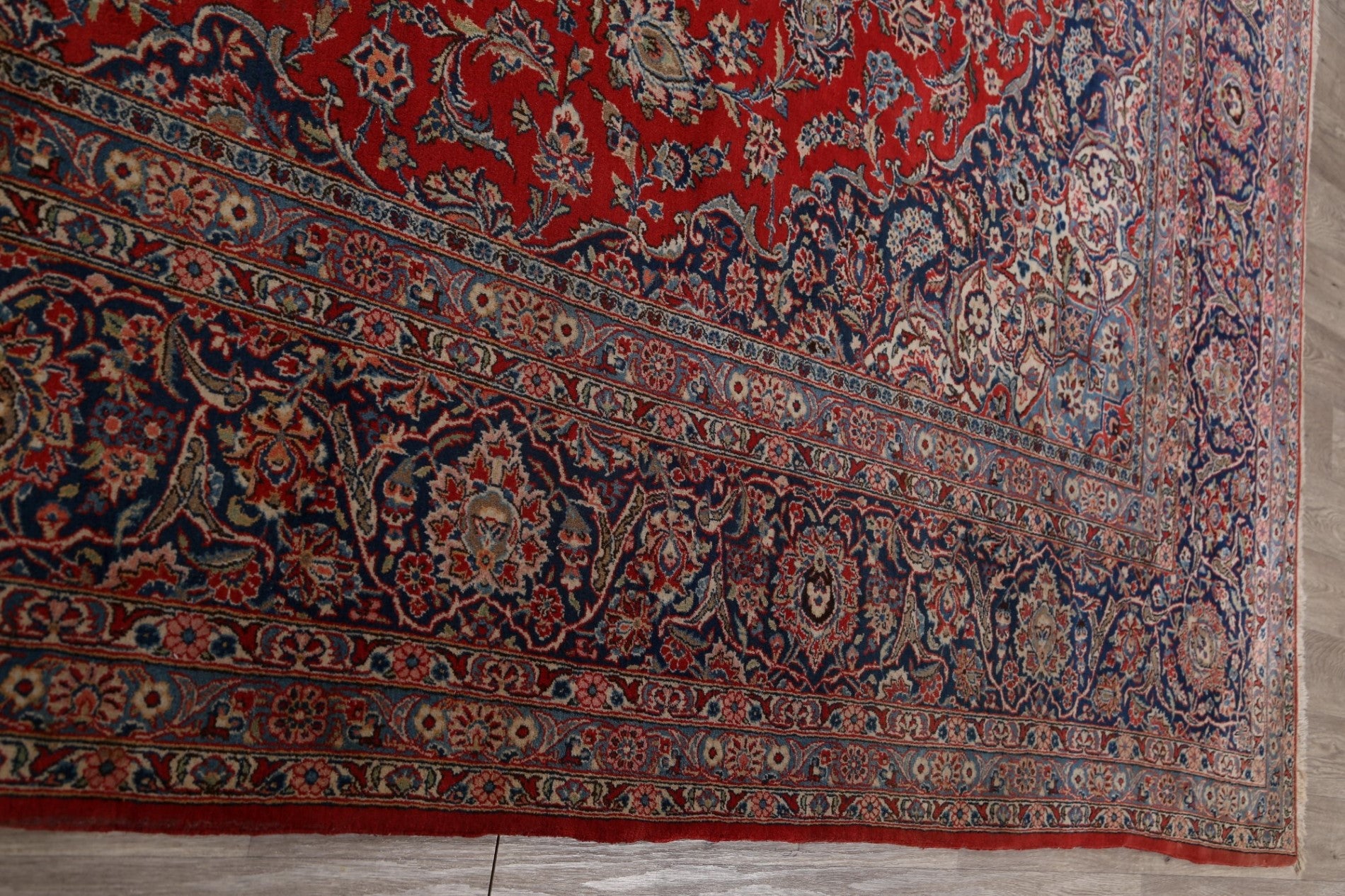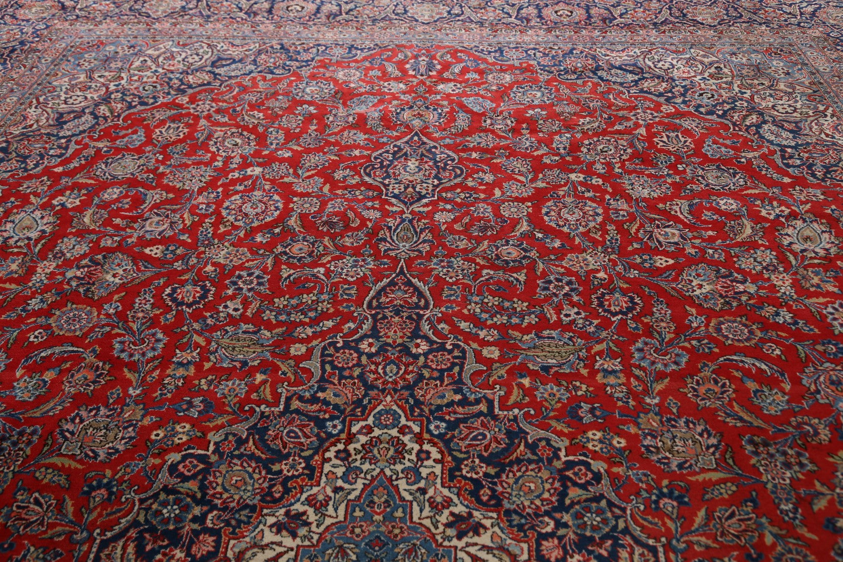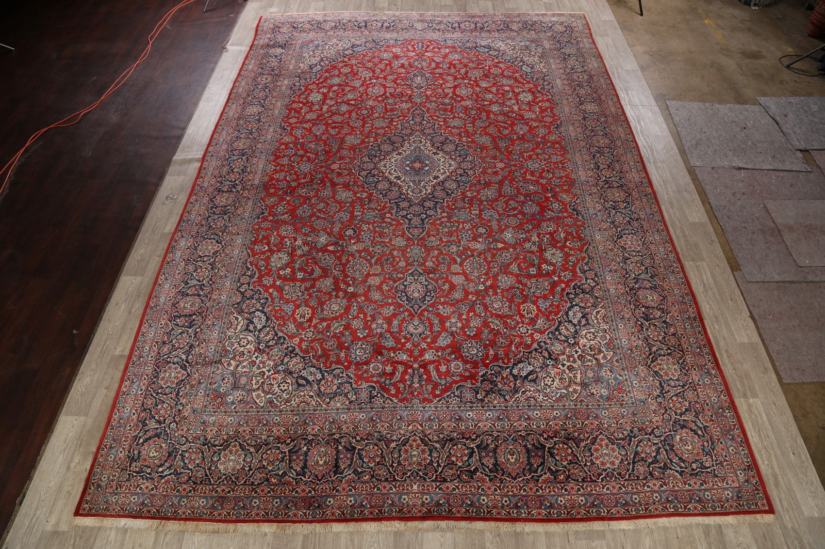 A Beautiful Genuine Persia ( Persia ) Kashan (Dabir) rug is Hand Knotted by skillful weavers in Persia ( Persia ) with Kork Wool Material. This rug is in Very Good condition. dimensions are 16' 10'' X 11' 4'' in foot and 513 X 345 in centimeter. the primary color is Red.