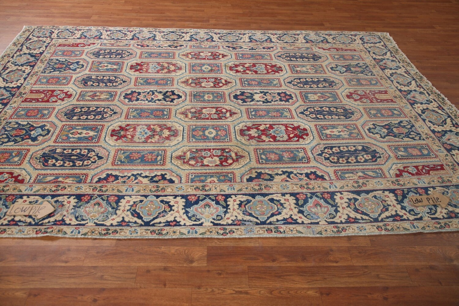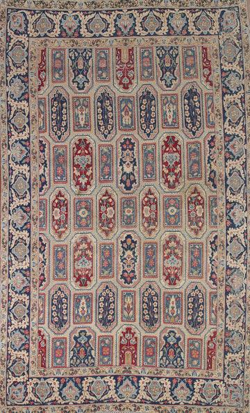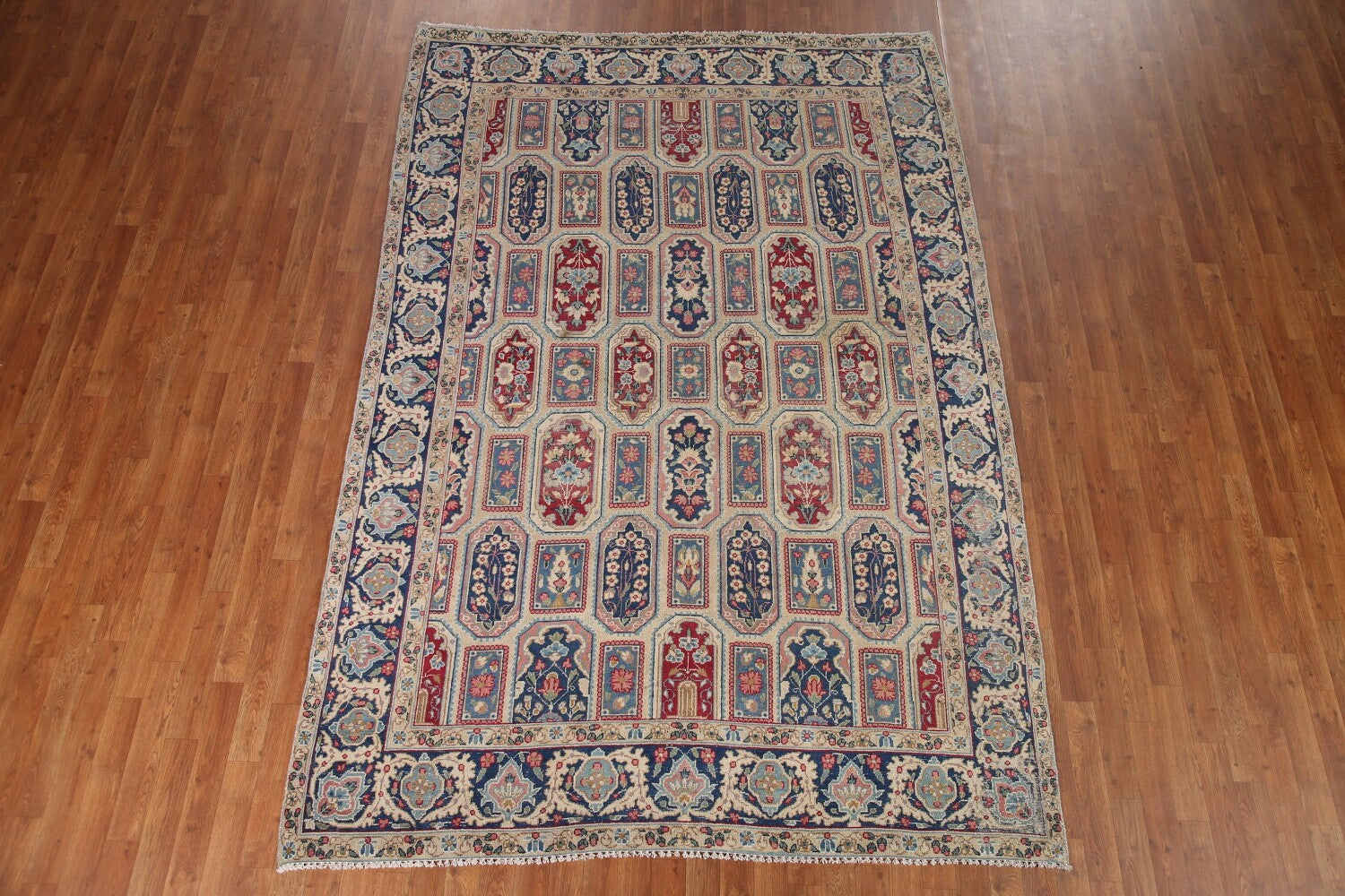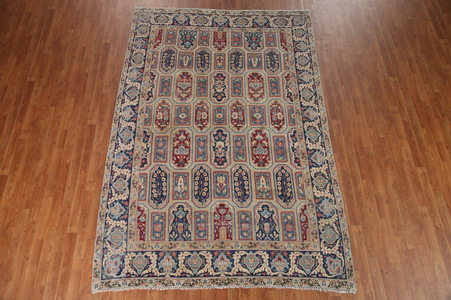 A Beautiful Genuine Persia ( Persia ) Kerman rug is Hand Knotted by skillful weavers in Persia ( Persia ) with 100% Wool Material. This rug is in Very Good (Low Pile) condition. dimensions are 9' 6'' X 6' 6'' in foot and 290 X 198 in centimeter. the primary color is Beige & Ivories.