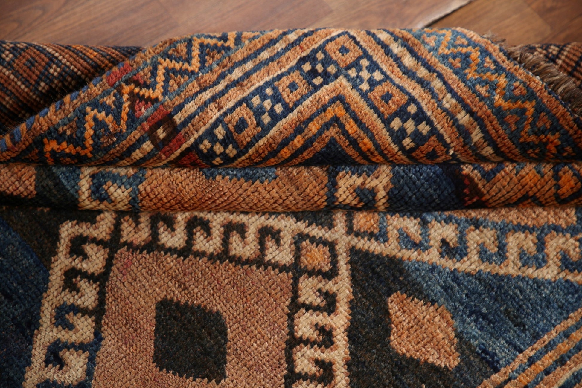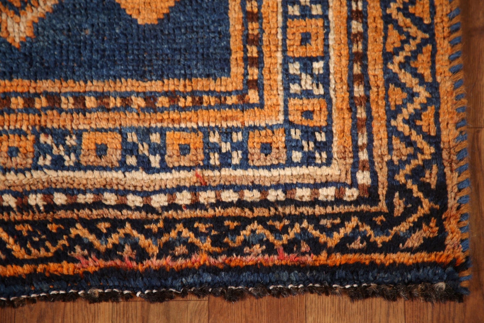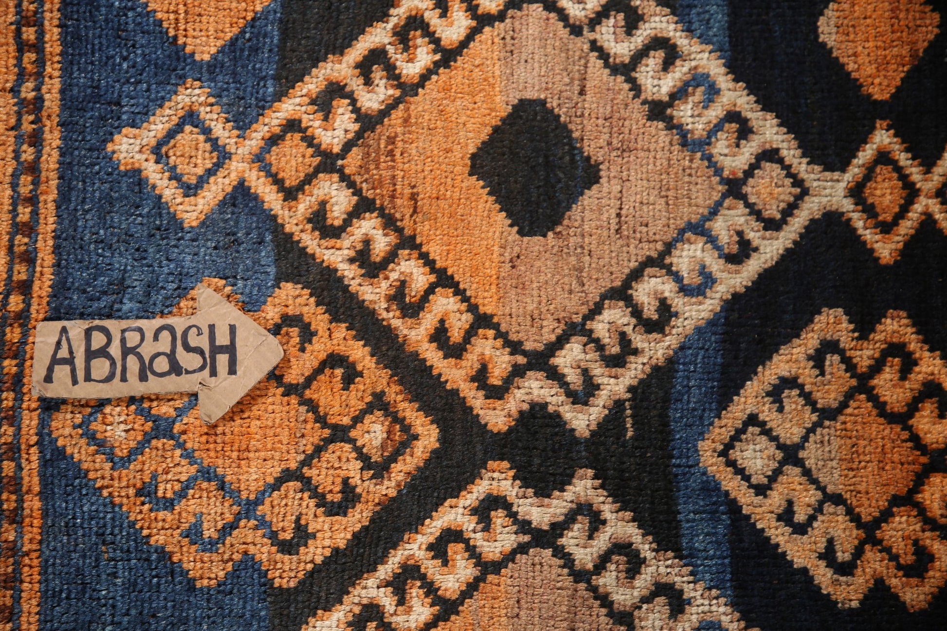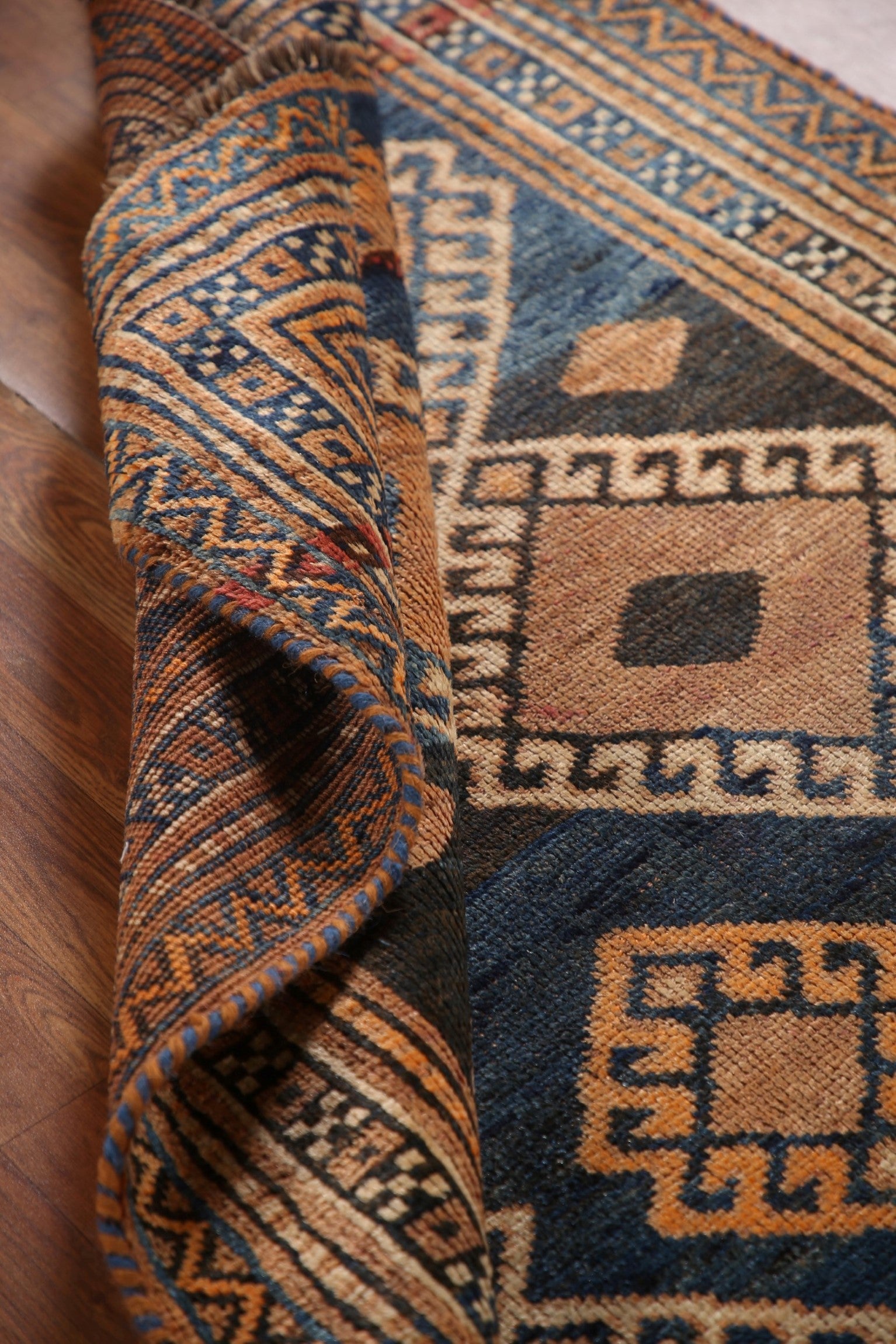A Beautiful Genuine Persia ( Persia ) Qashqai rug is Hand Knotted by skillful weavers in Persia ( Persia ) with 100% Wool Material. This rug is in Very Good (Low Pile-Abrash) condition. dimensions are 7' 6'' X 3' 11'' in foot and 229 X 119 in centimeter. the primary color is Navy Blue & Blues.