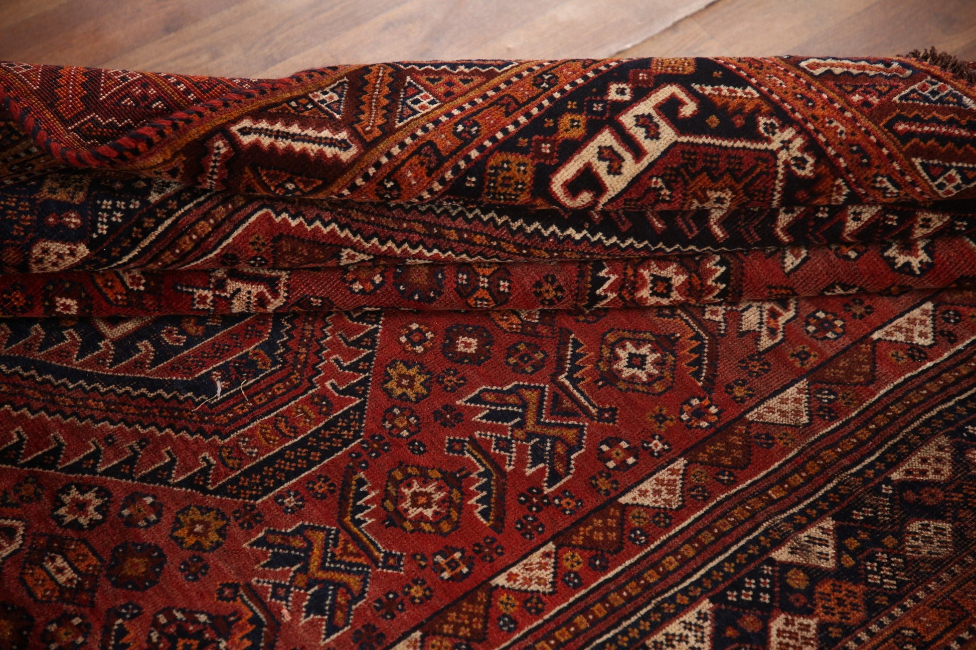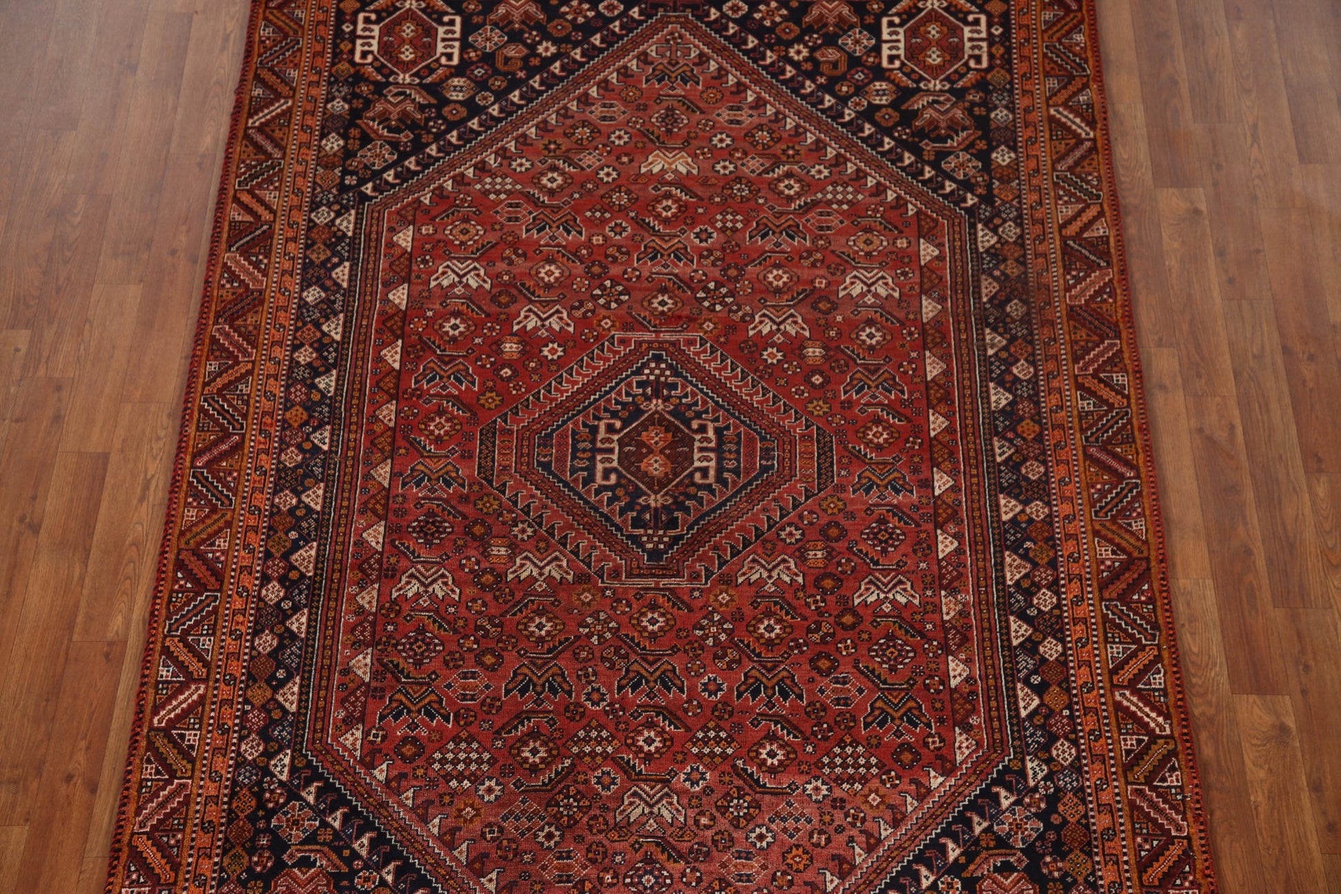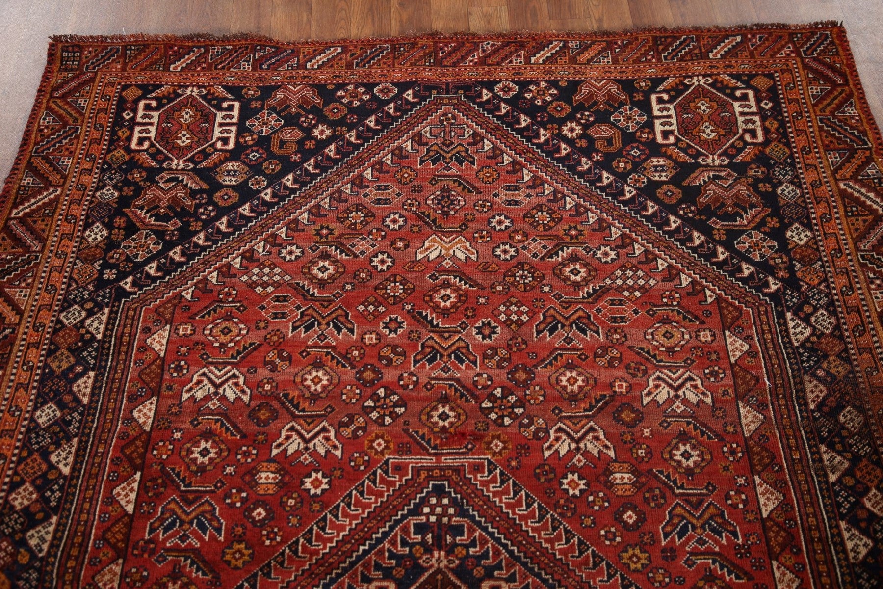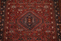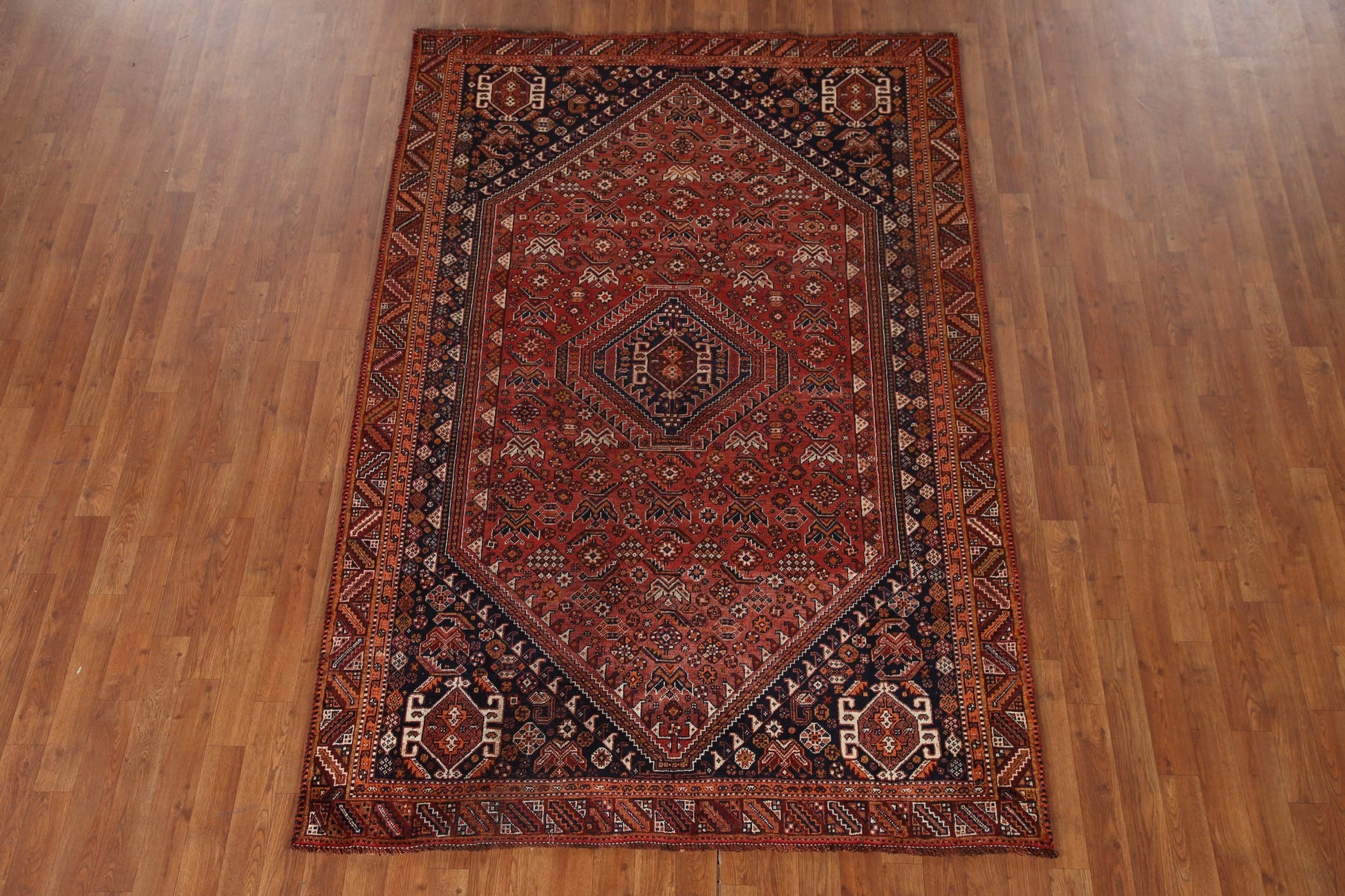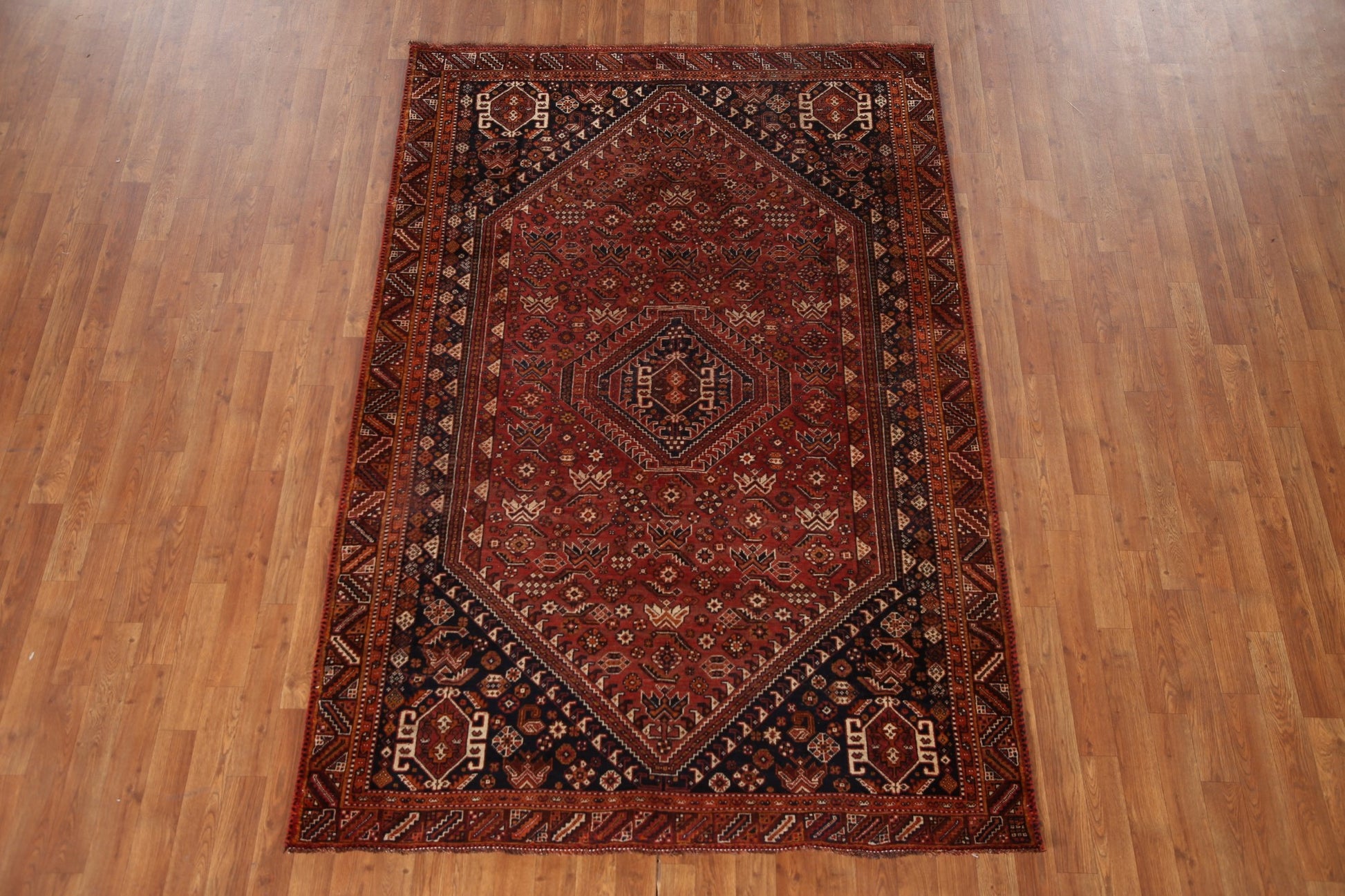 A Beautiful Genuine Persia ( Persia ) Qashqai rug is Hand Knotted by skillful weavers in Persia ( Persia ) with 100% Wool Material. This rug is in Very Good ( Low Pile ) condition. dimensions are 7' 9'' X 5' 2'' in foot and 236 X 157 in centimeter. the primary color is Red.
