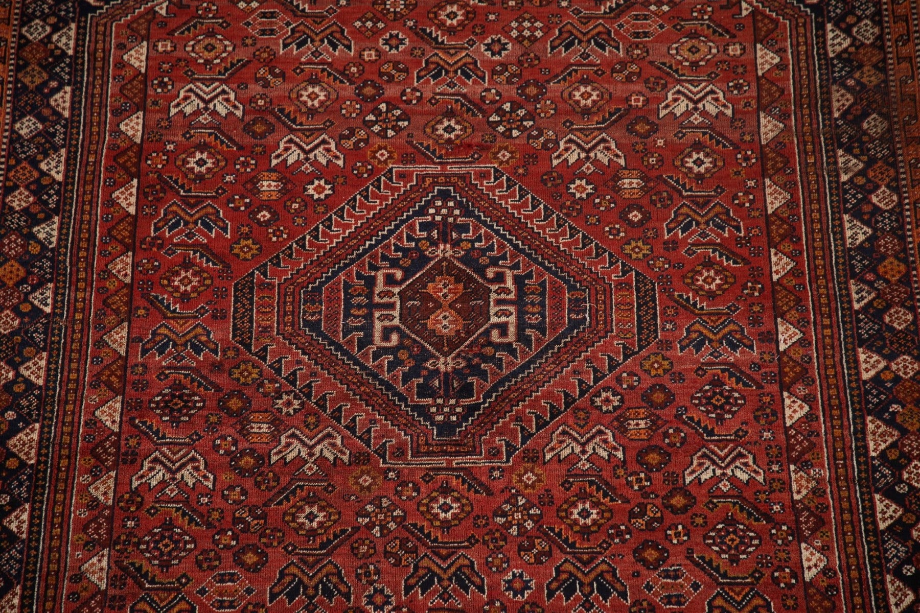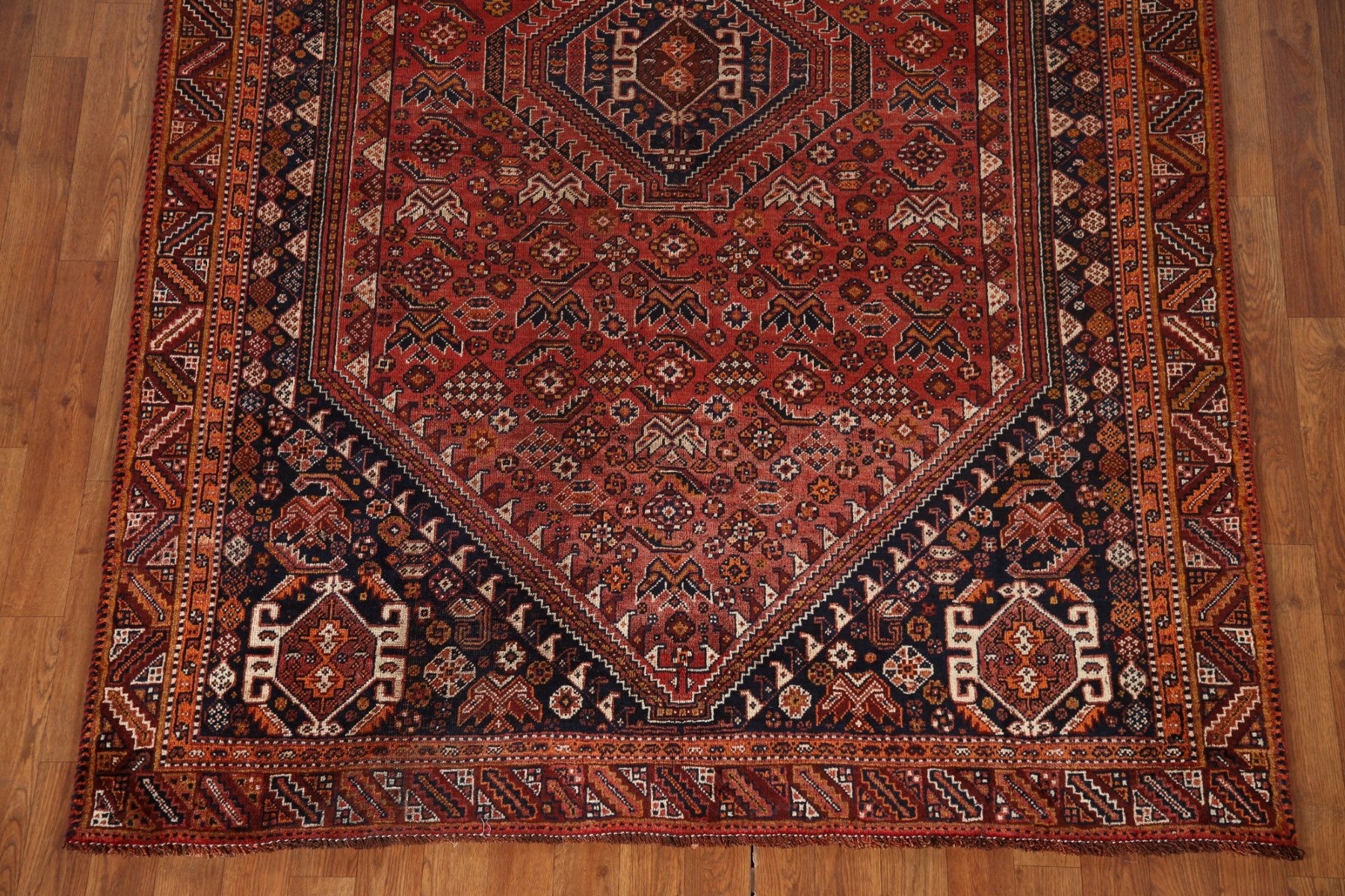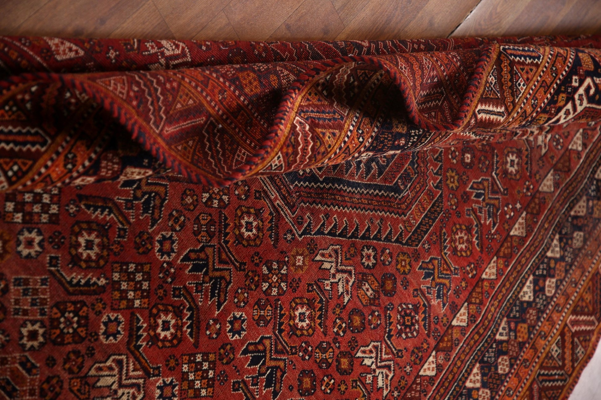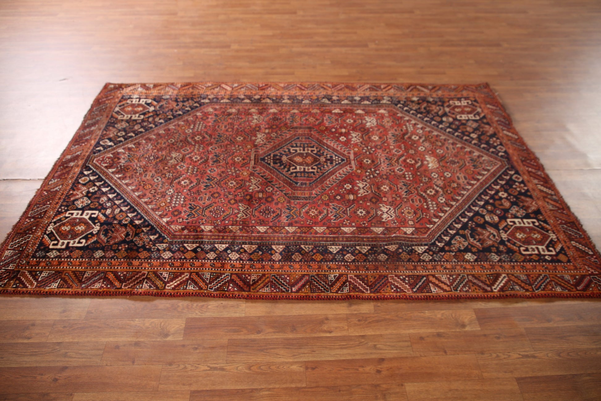 A Beautiful Genuine Persia ( Persia ) Qashqai rug is Hand Knotted by skillful weavers in Persia ( Persia ) with 100% Wool Material. This rug is in Very Good ( Low Pile ) condition. dimensions are 7' 9'' X 5' 2'' in foot and 236 X 157 in centimeter. the primary color is Red.