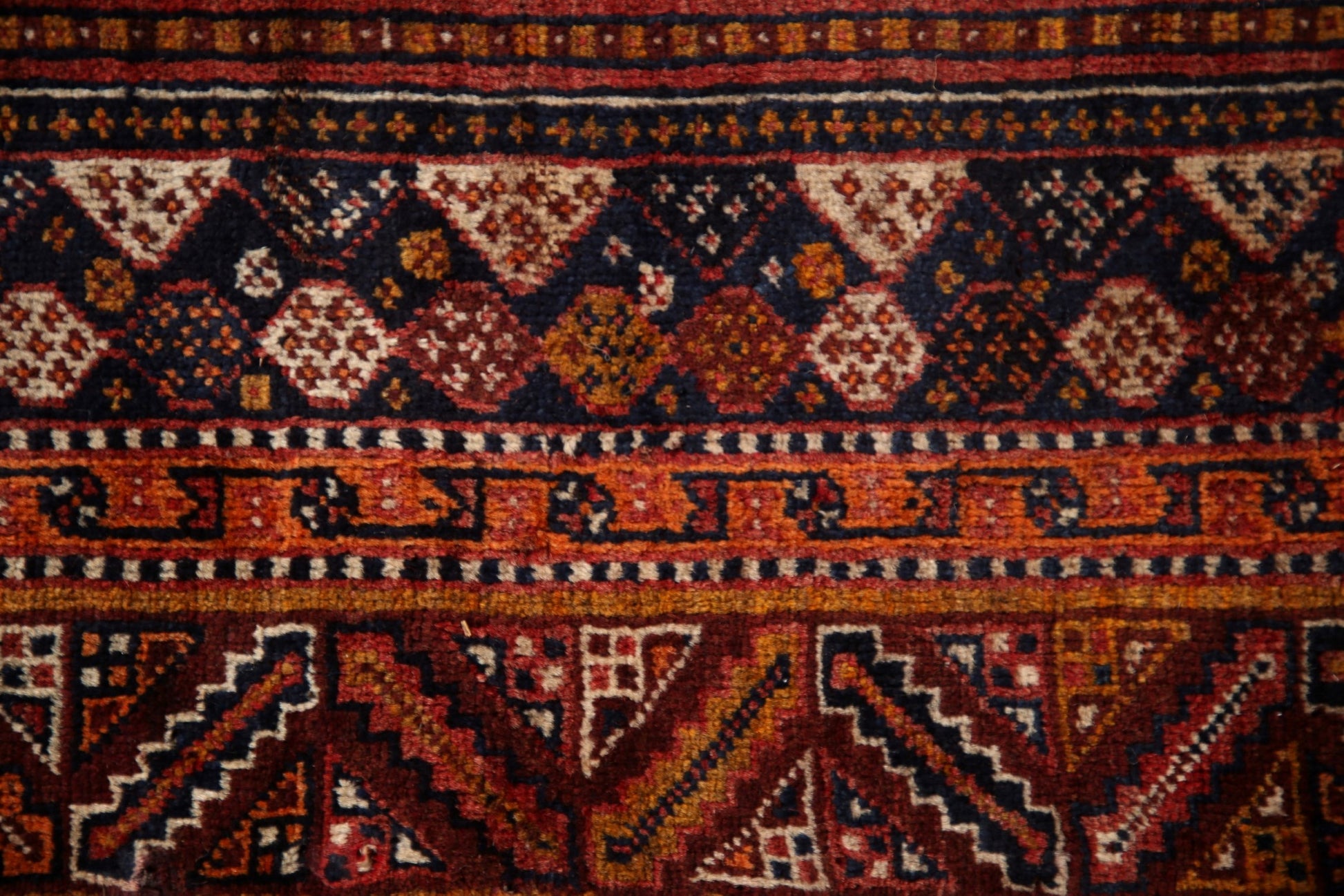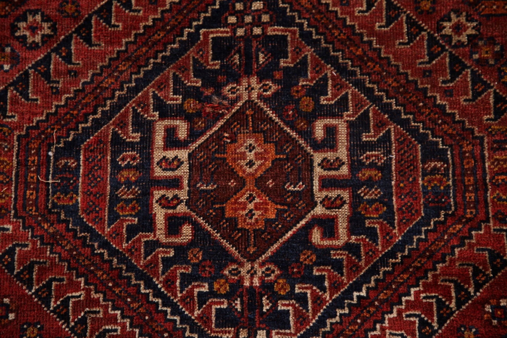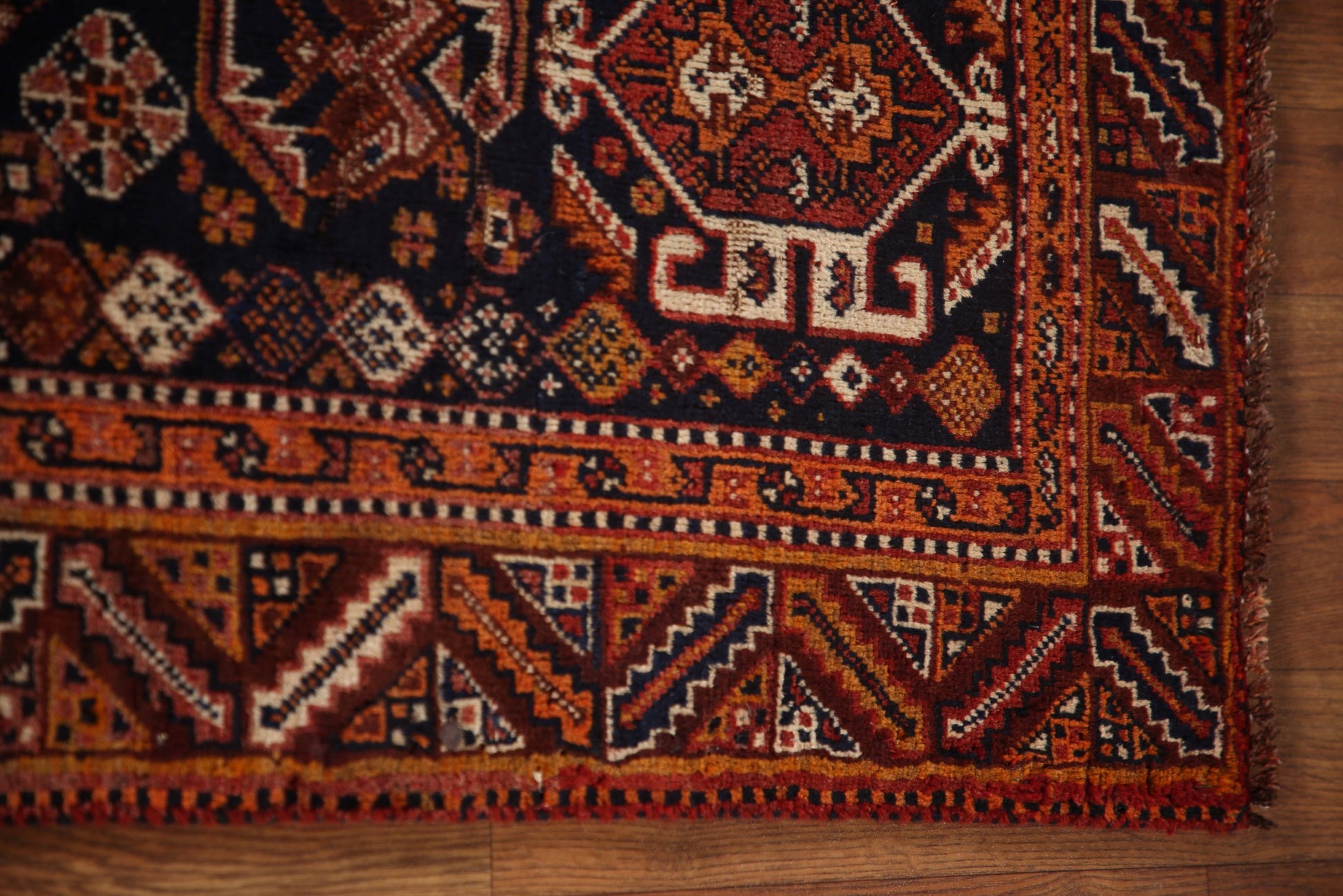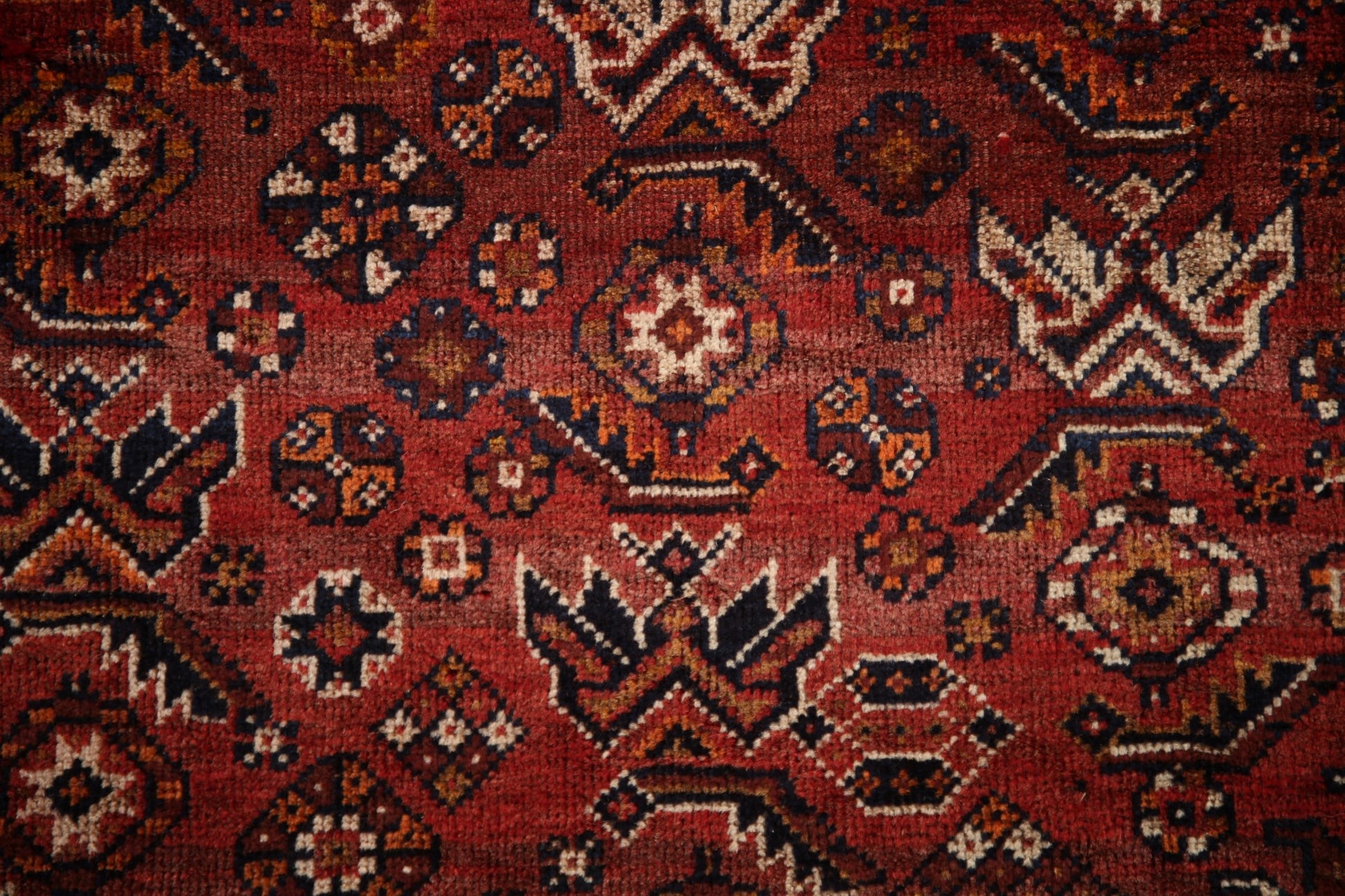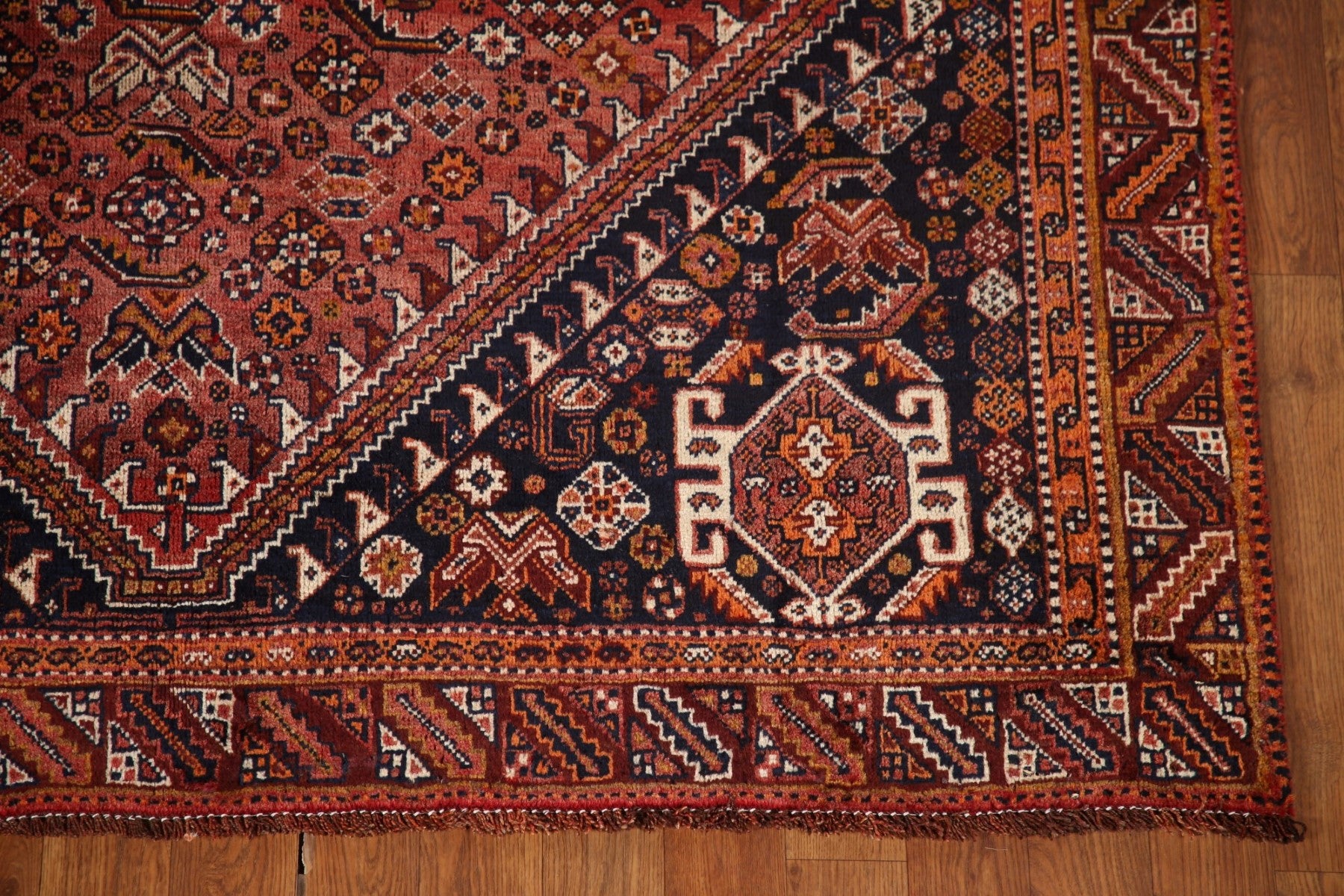 A Beautiful Genuine Persia ( Persia ) Qashqai rug is Hand Knotted by skillful weavers in Persia ( Persia ) with 100% Wool Material. This rug is in Very Good ( Low Pile ) condition. dimensions are 7' 9'' X 5' 2'' in foot and 236 X 157 in centimeter. the primary color is Red.