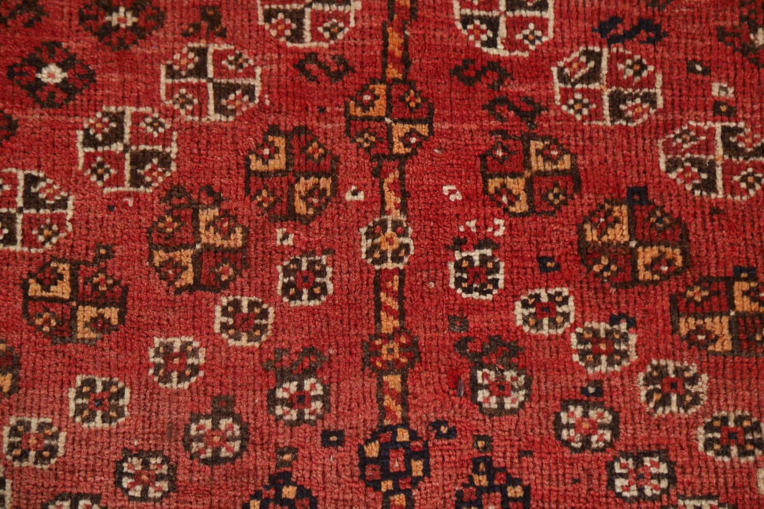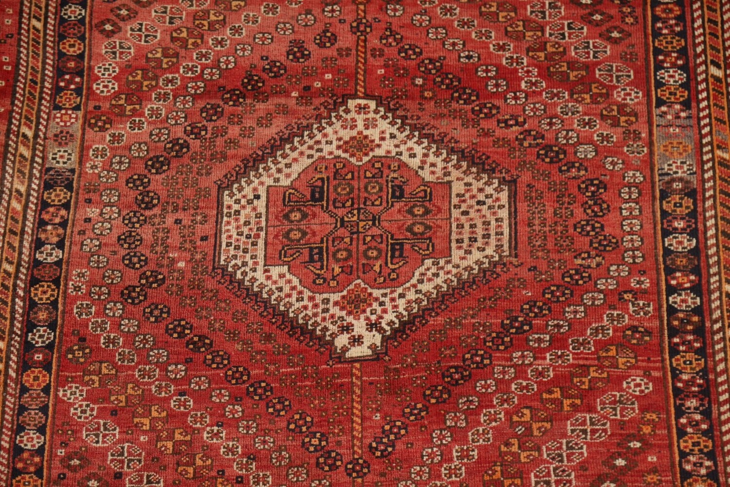 A Beautiful Genuine Persia ( Persia ) Shiraz rug is Hand Knotted by skillful weavers in Persia ( Persia ) with 100% Wool Material. This rug is in Very Good (Low Pile-Abrash-Repair) condition. dimensions are 8' 6'' X 5' 1'' in foot and 259 X 155 in centimeter. the primary color is Red.