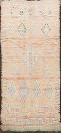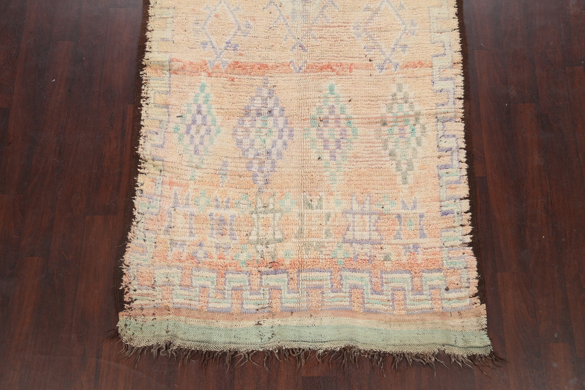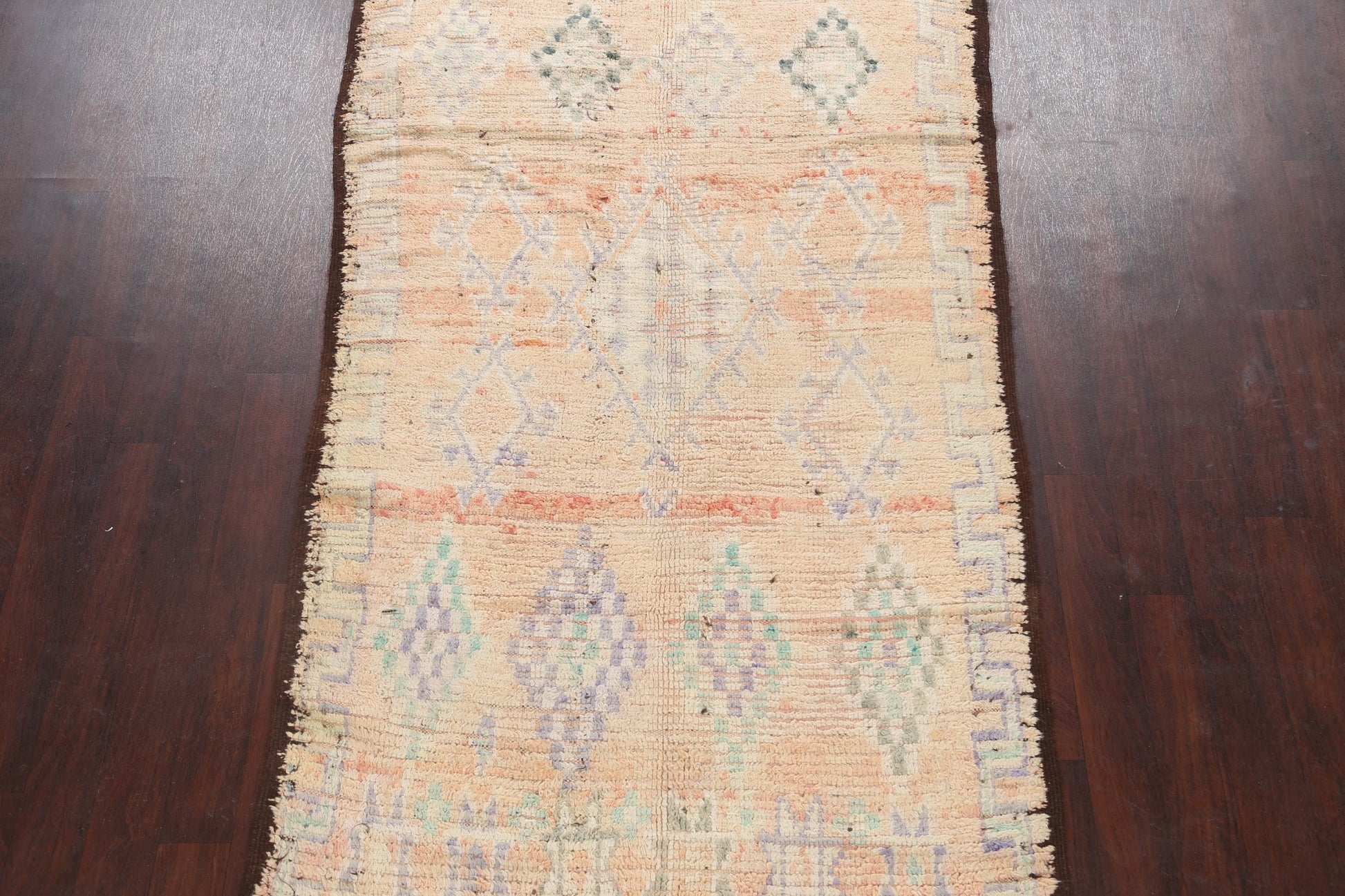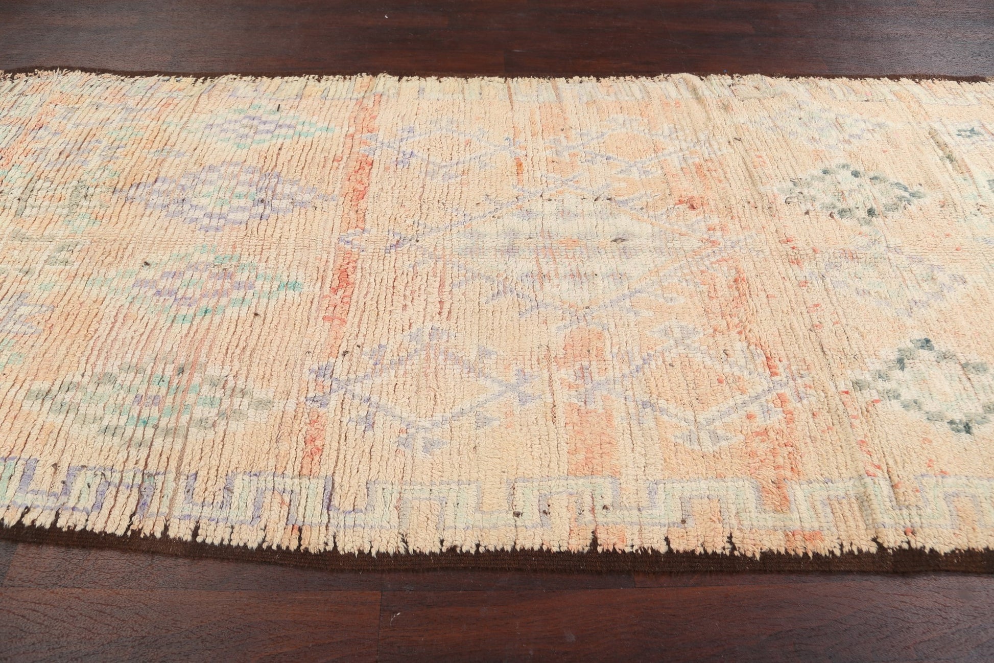 A Beautiful Genuine Morocco Moroccan rug is Hand Knotted by skillful weavers in Morocco with 100% Wool Material. This rug is in Very Good (Low Pile) condition. dimensions are 10' 9'' X 4' 9'' in foot and 328 X 145 in centimeter. the primary color is Peach.