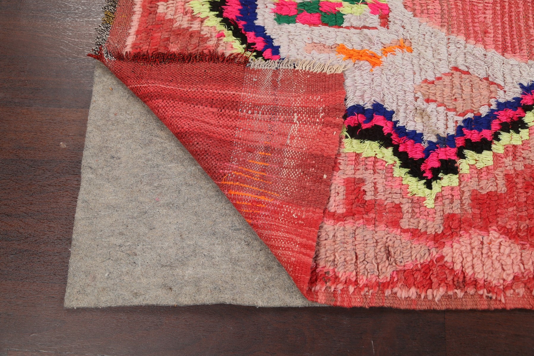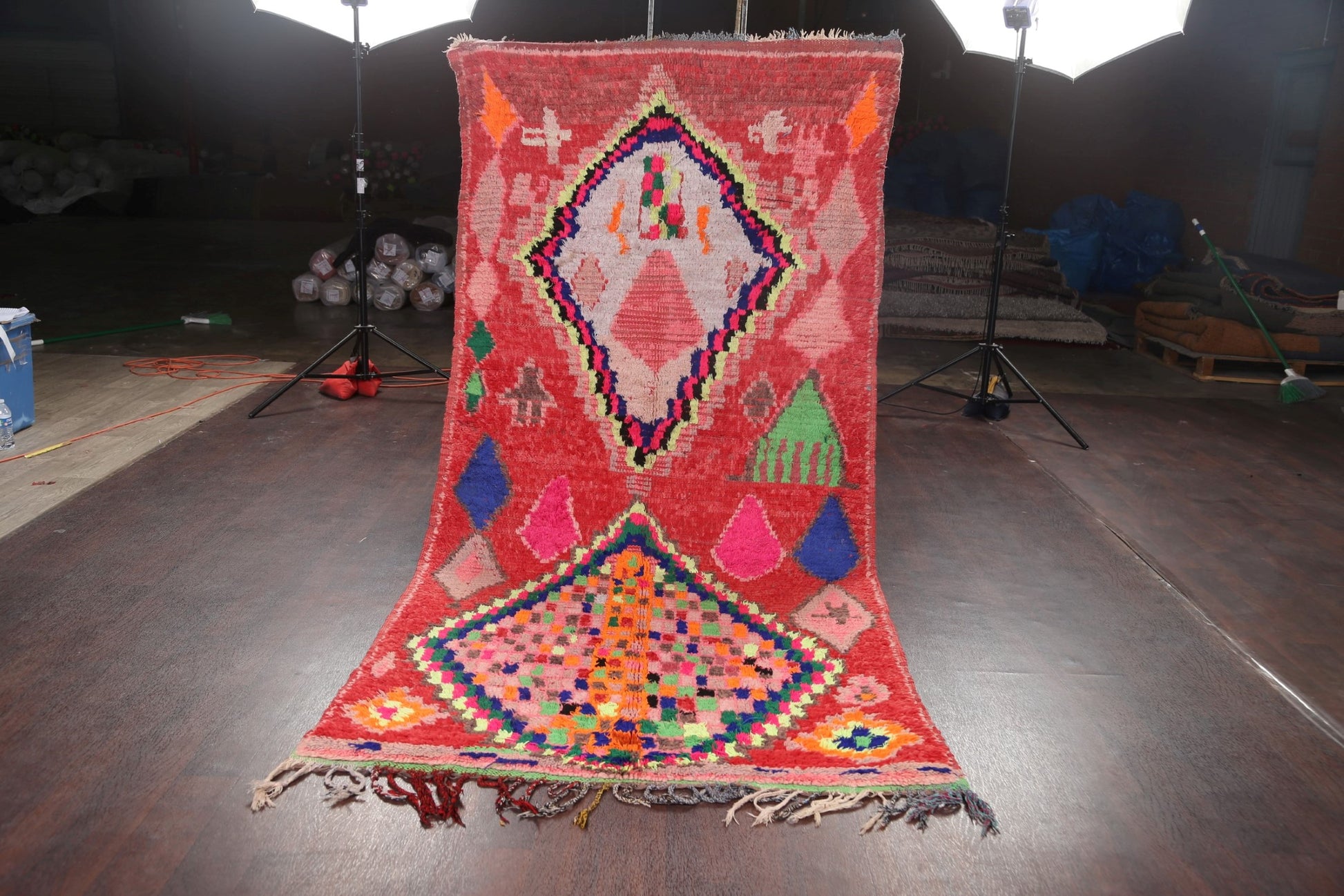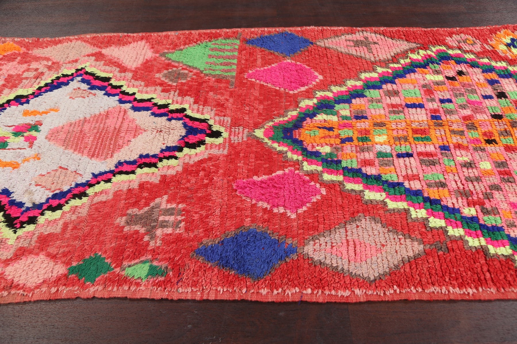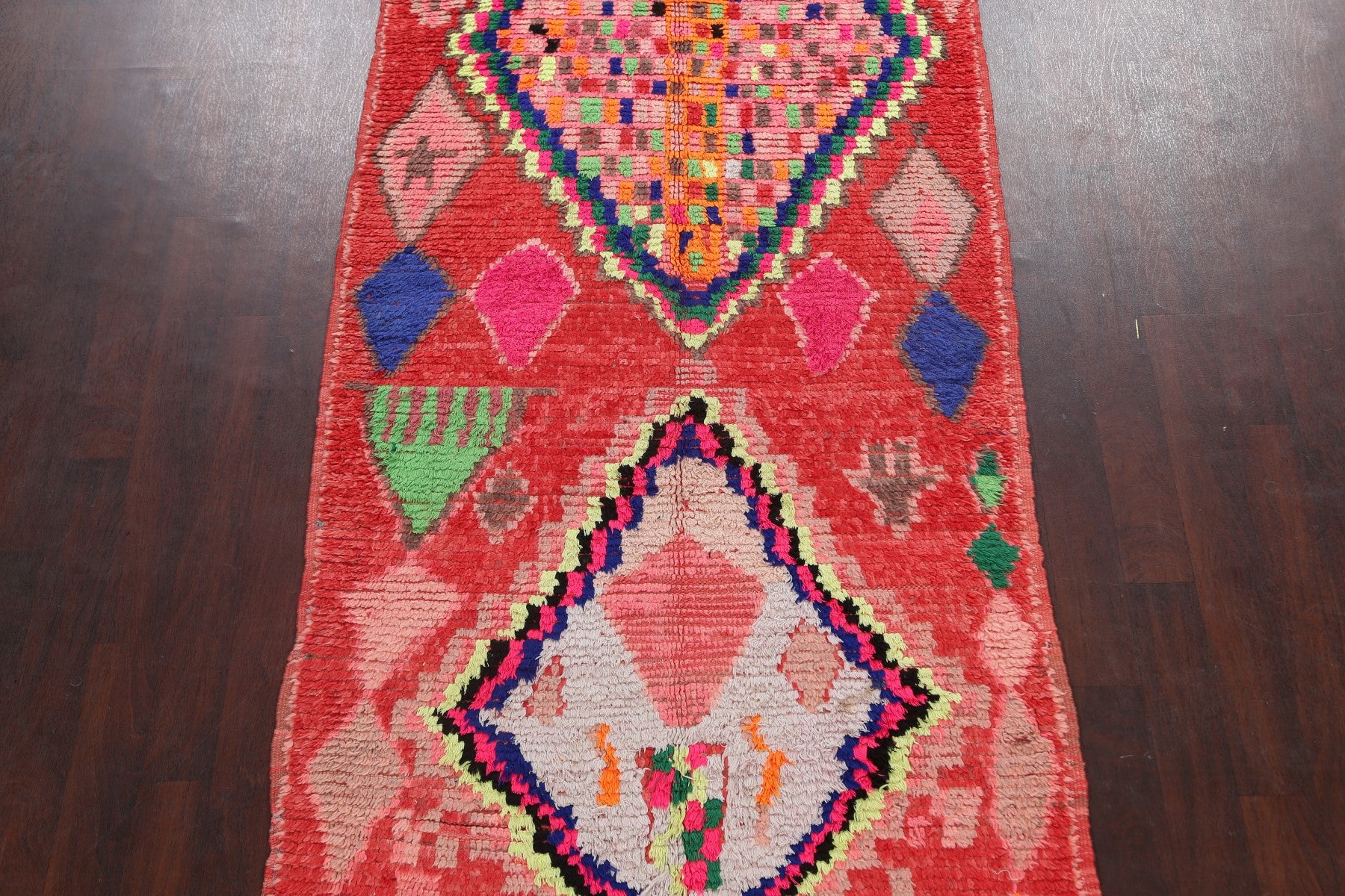 A Beautiful Genuine Morocco Moroccan rug is Hand Knotted by skillful weavers in Morocco with 100% Wool Material. This rug is in Very Good ( Low Pile ) condition. dimensions are 9' 6'' X 4' 7'' in foot and 290 X 140 in centimeter. the primary color is Coral.