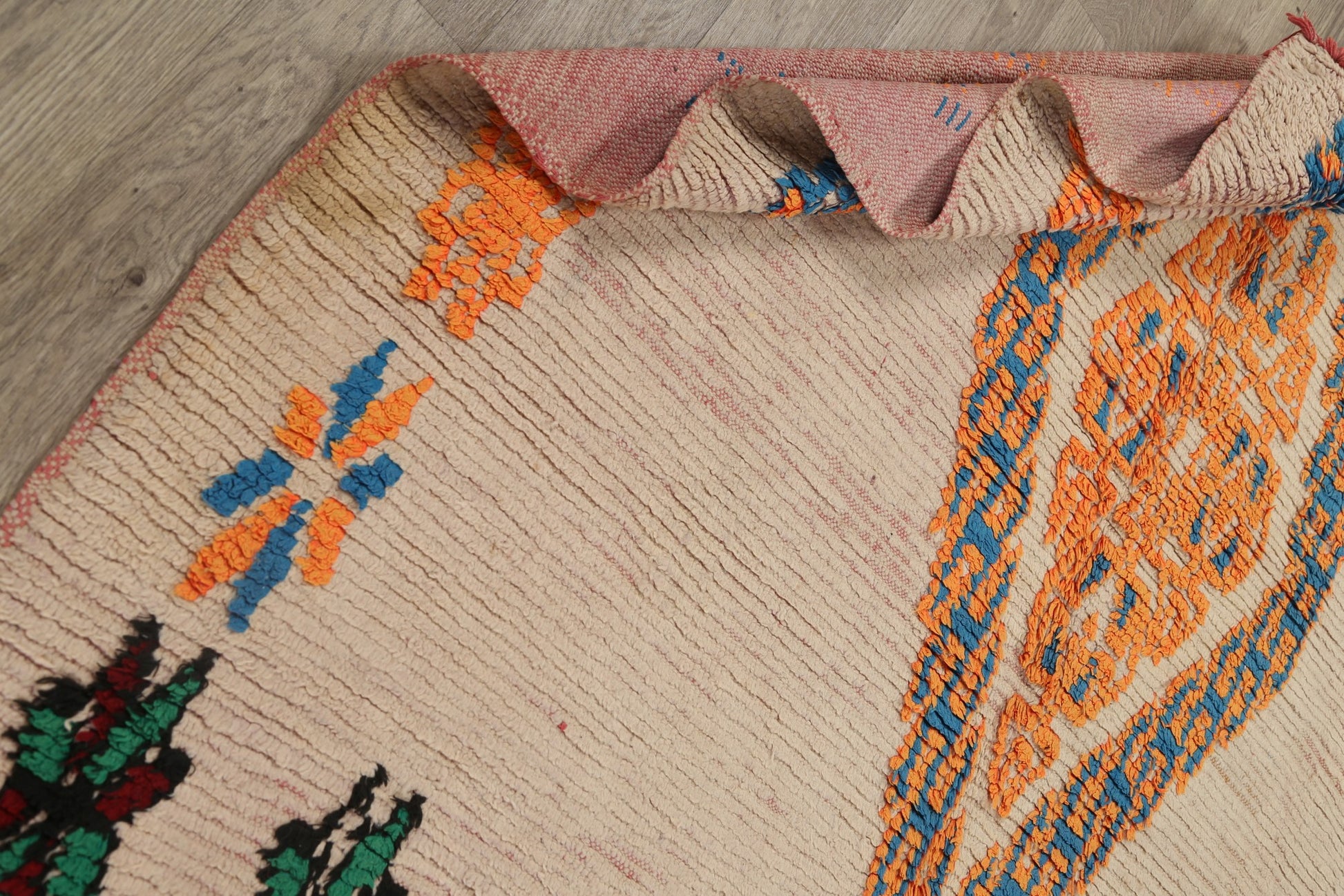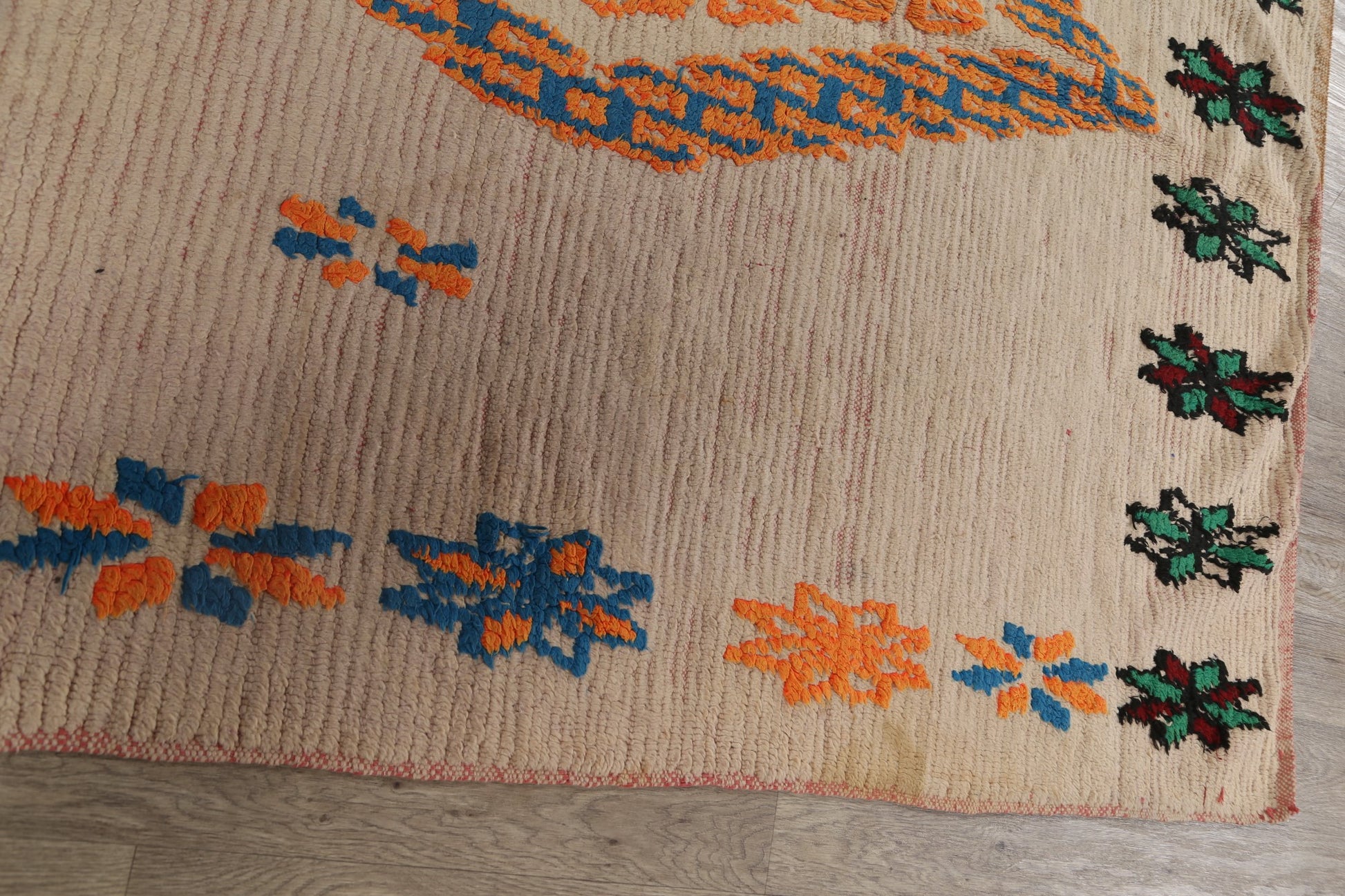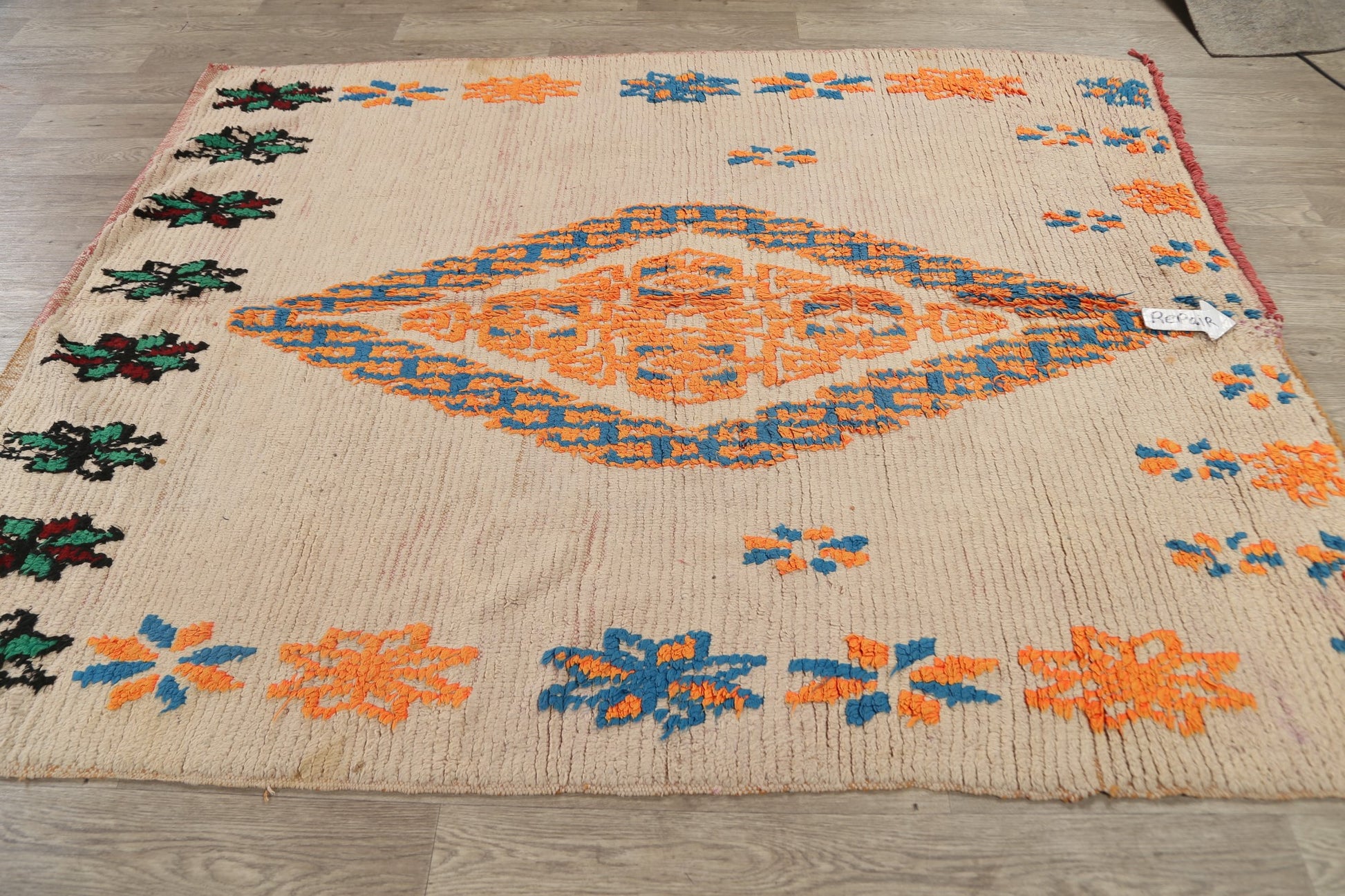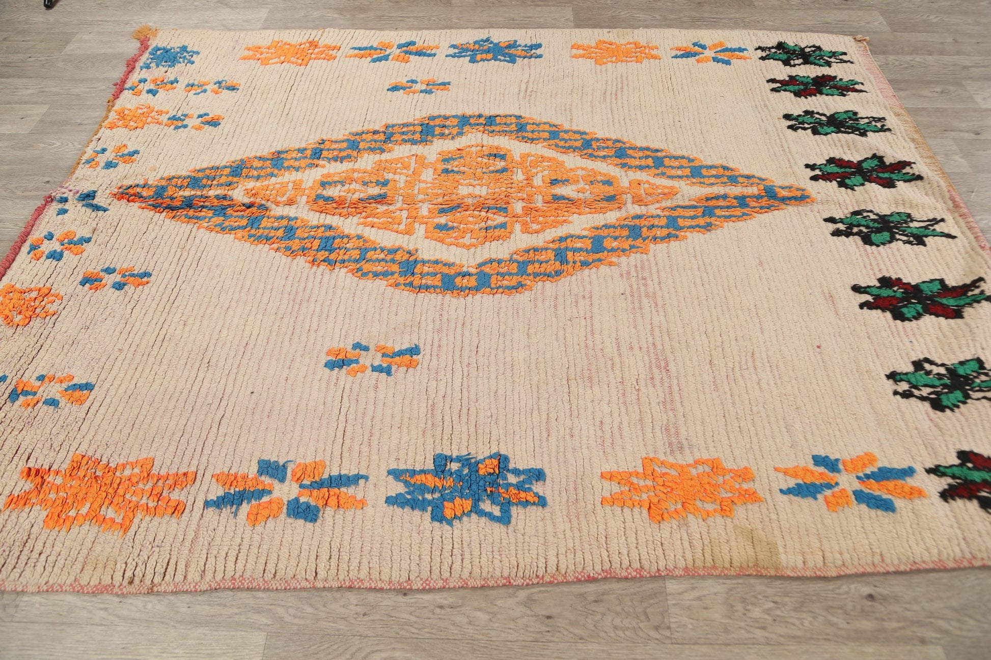 A Beautiful Genuine Morocco Moroccan rug is Hand Knotted by skillful weavers in Morocco with 100% Wool Material. This rug is in Very Good (Low Pile-Repair) condition. dimensions are 7' 2'' X 5' 9'' in foot and 218 X 175 in centimeter. the primary color is Beige & Ivories.