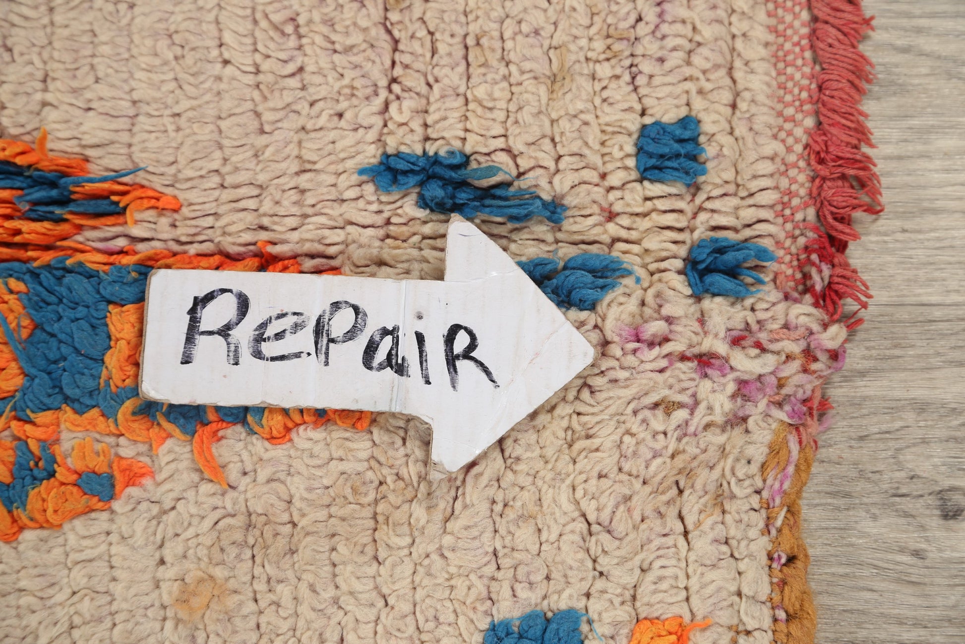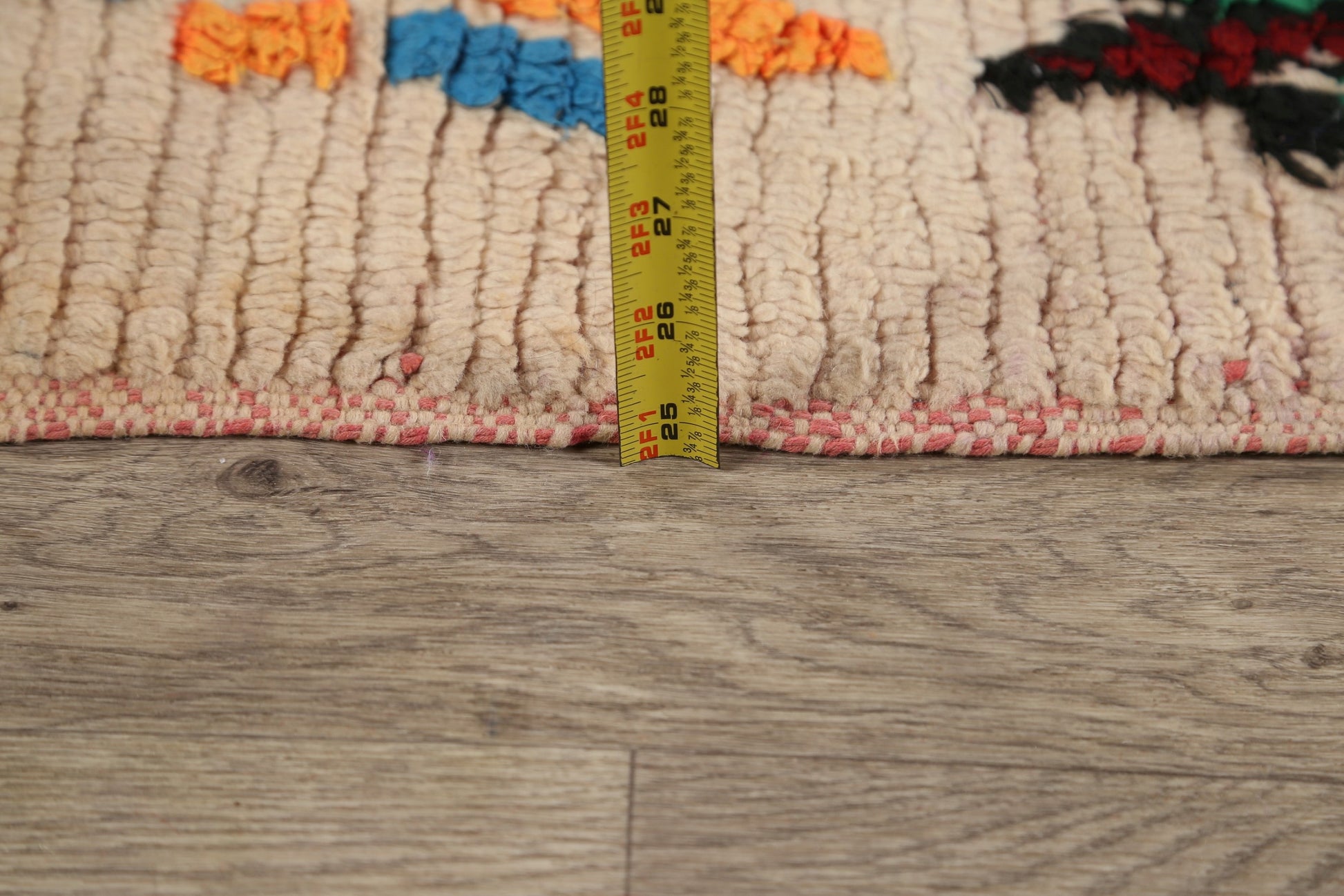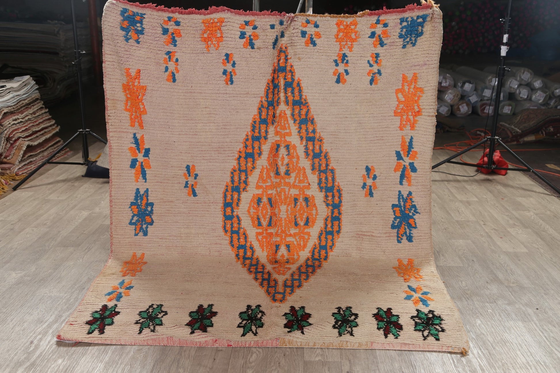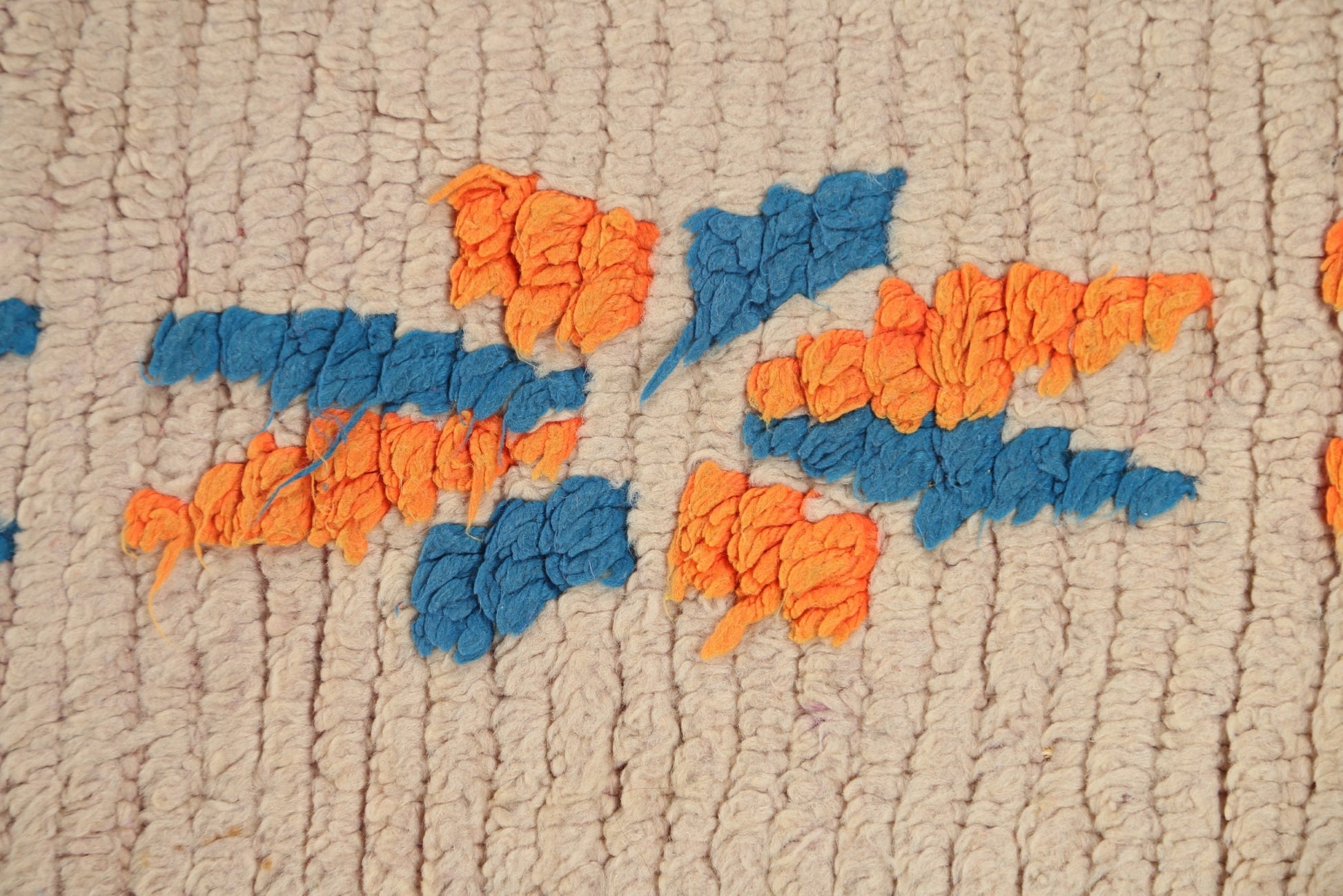 A Beautiful Genuine Morocco Moroccan rug is Hand Knotted by skillful weavers in Morocco with 100% Wool Material. This rug is in Very Good (Low Pile-Repair) condition. dimensions are 7' 2'' X 5' 9'' in foot and 218 X 175 in centimeter. the primary color is Beige & Ivories.
