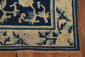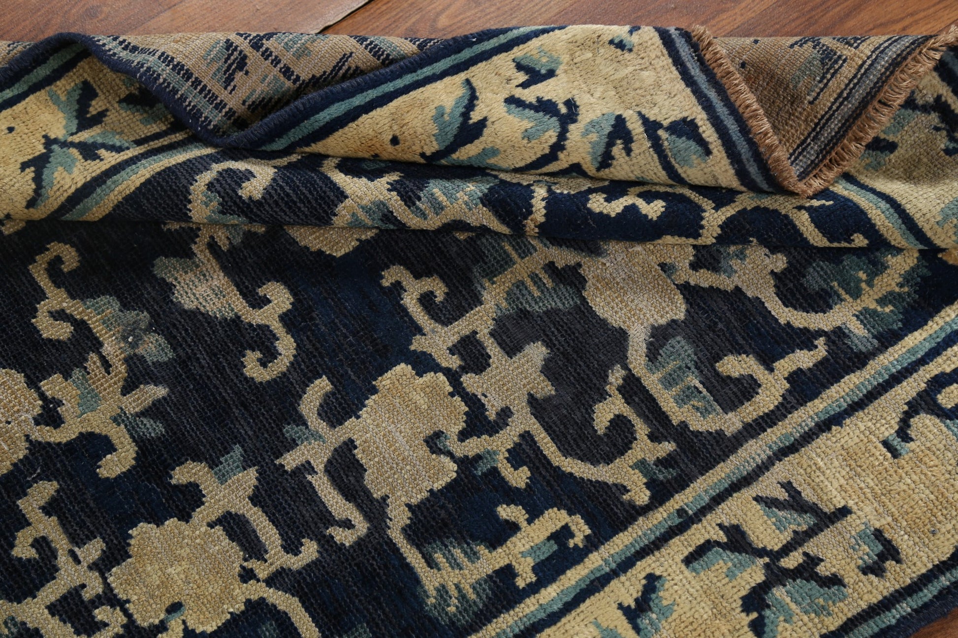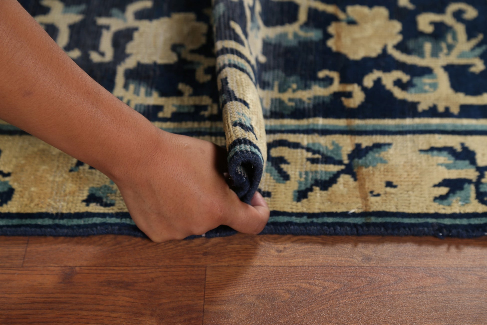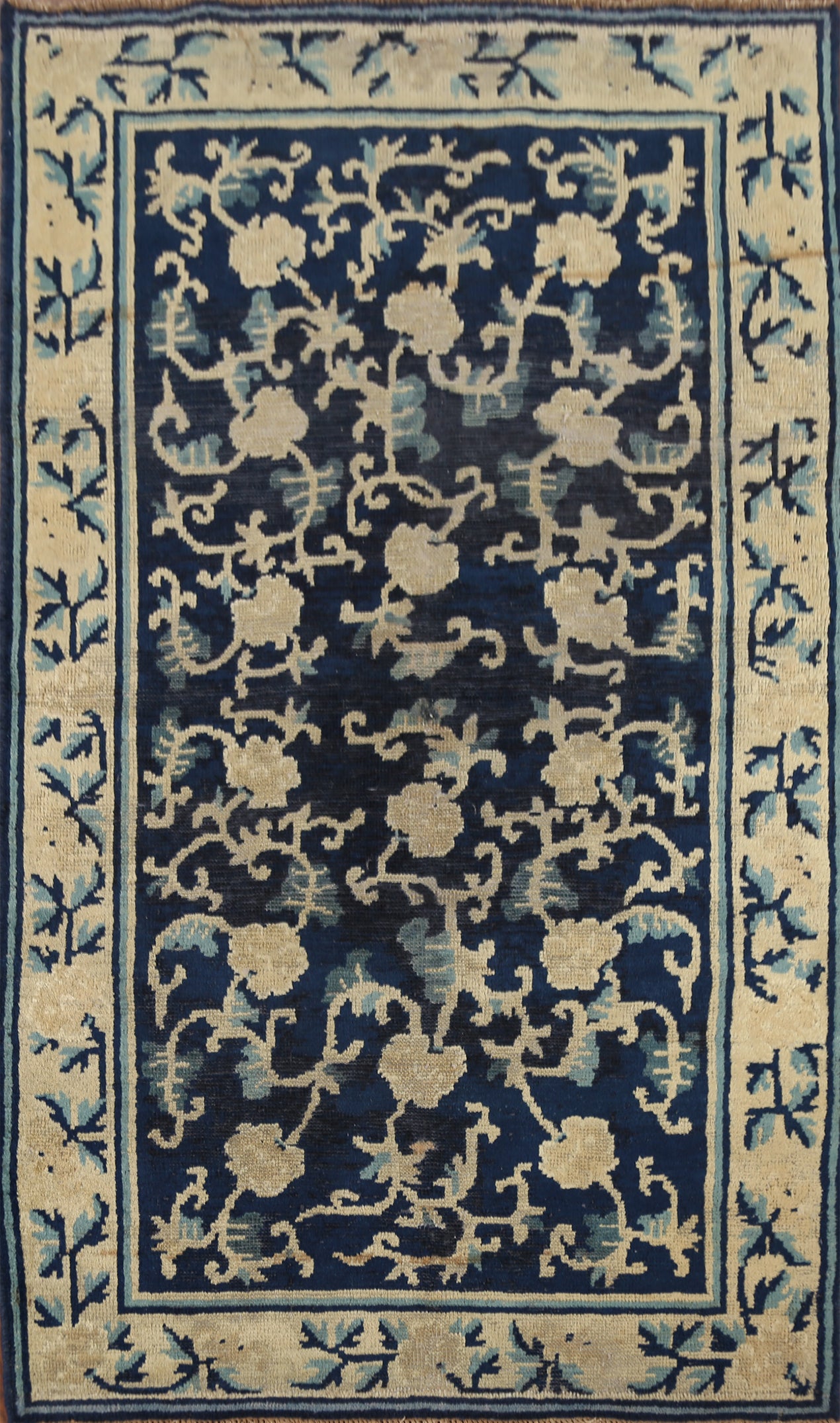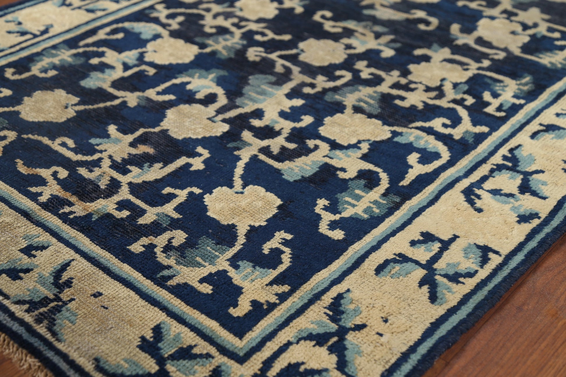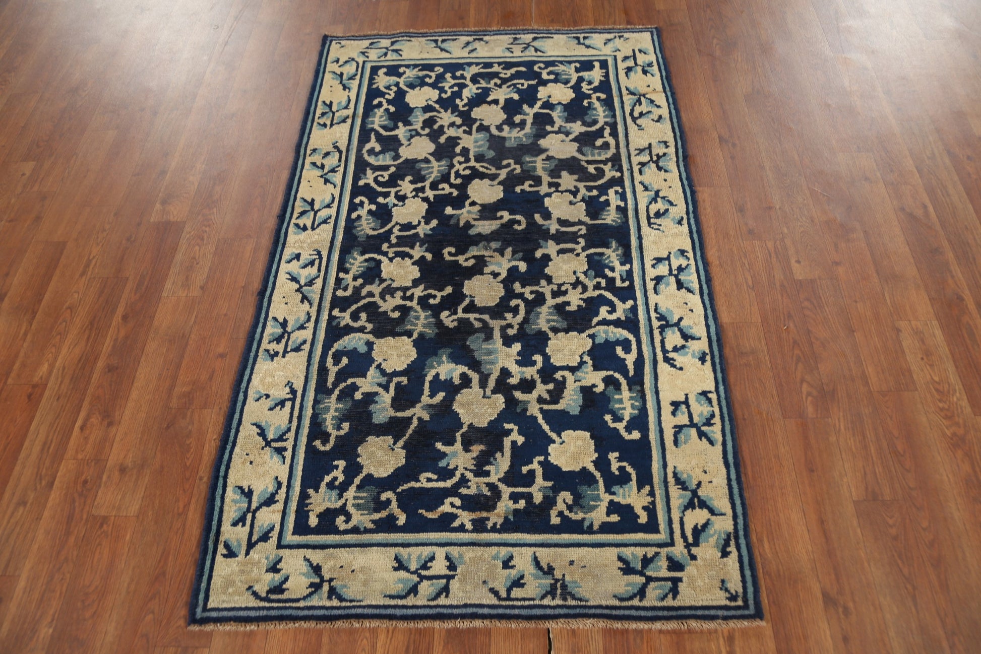 A Beautiful Genuine China Art Deco rug is Hand Knotted by skillful weavers in China with 100% Wool Material. This rug is in Very Good (Evenly Low Pile) condition. dimensions are 4' 9'' X 2' 11'' in foot and 145 X 89 in centimeter. the primary color is Navy Blue & Blues.