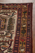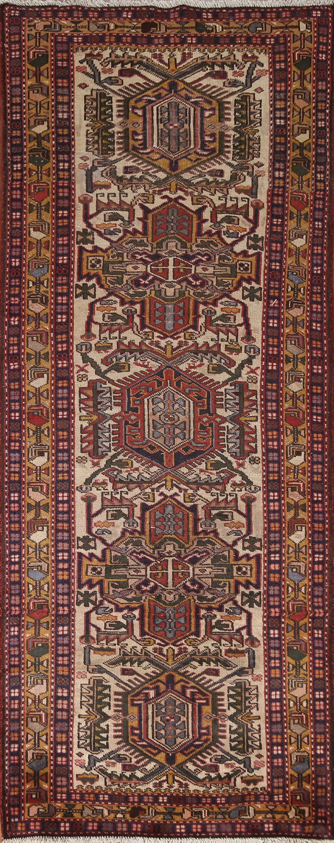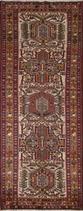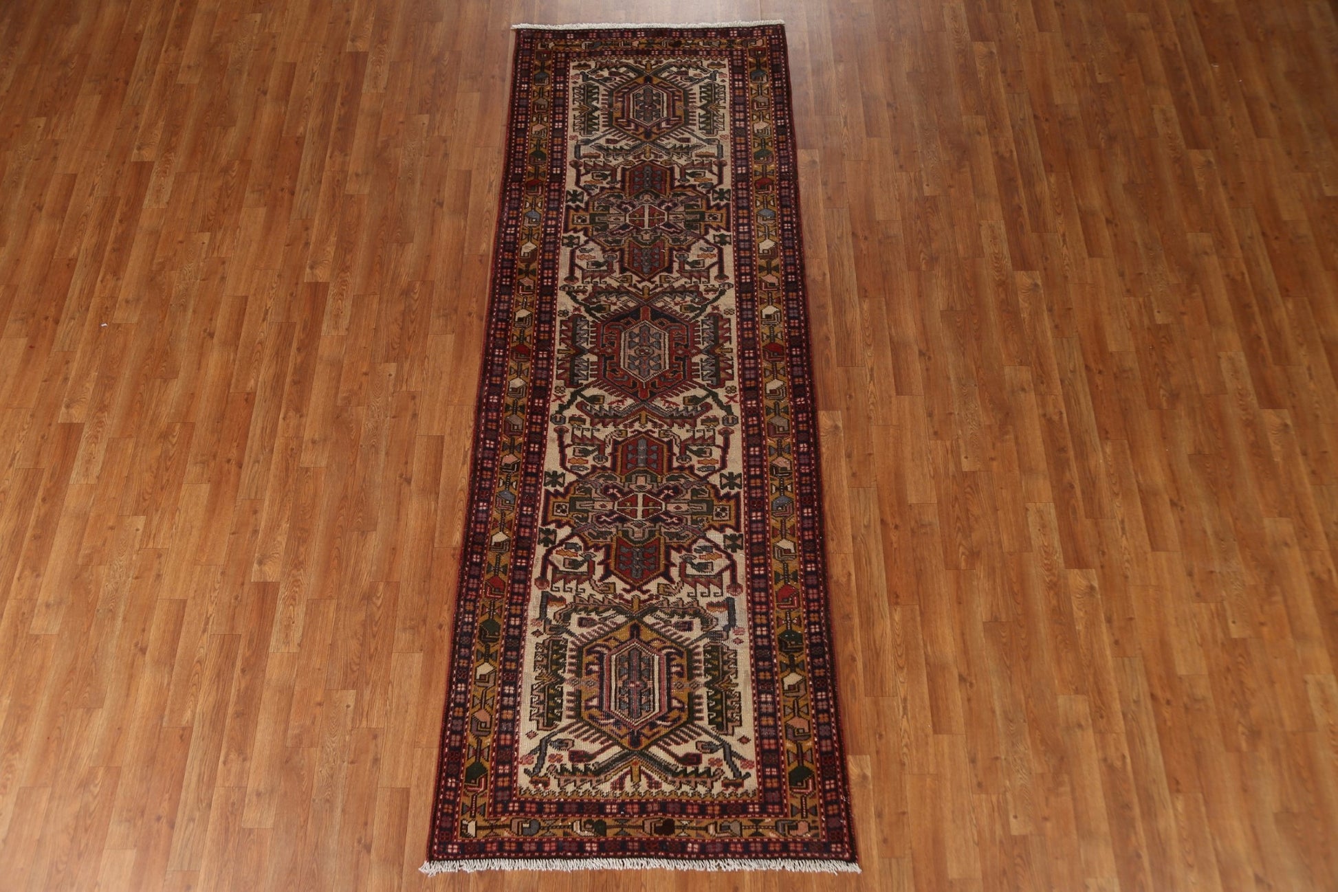 A Beautiful Genuine Persia ( Persia ) Heriz rug is Hand Knotted by skillful weavers in Persia ( Persia ) with 100% Wool Material. This rug is in Very Good (Evenly Low Pile) condition. dimensions are 9' 4'' X 3' 4'' in foot and 284 X 102 in centimeter. the primary color is Beige & Ivories.