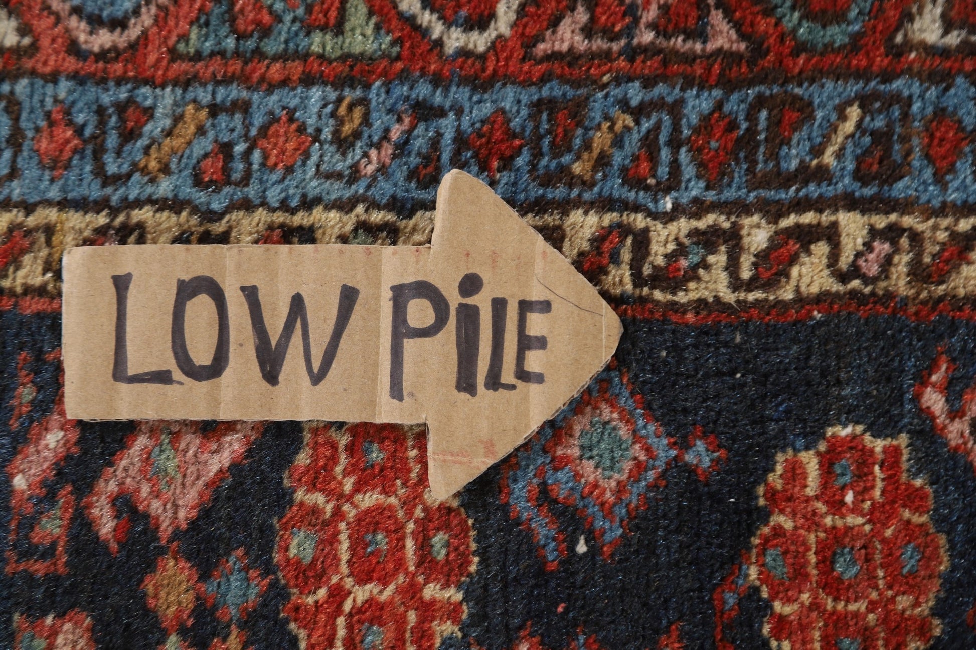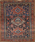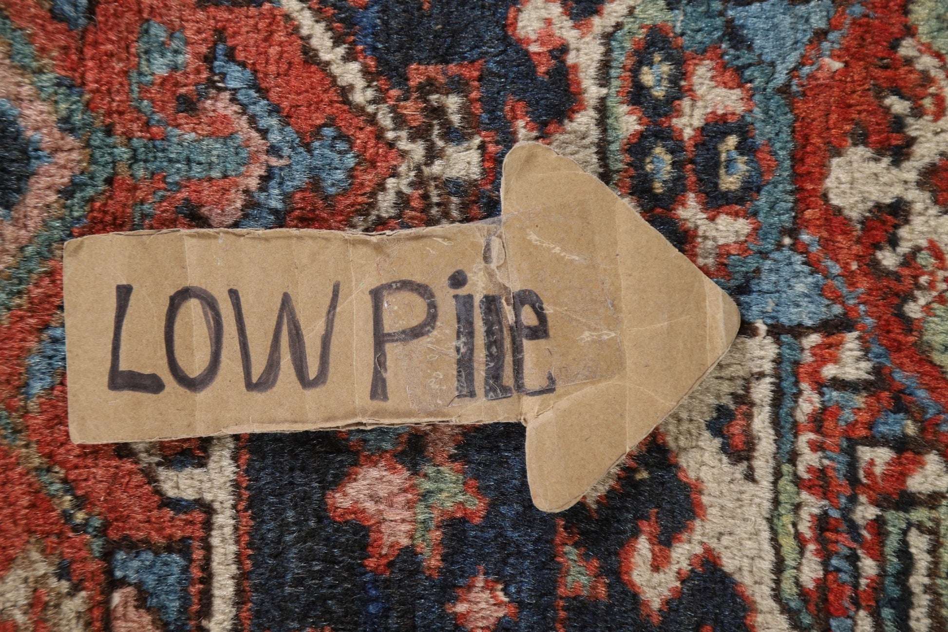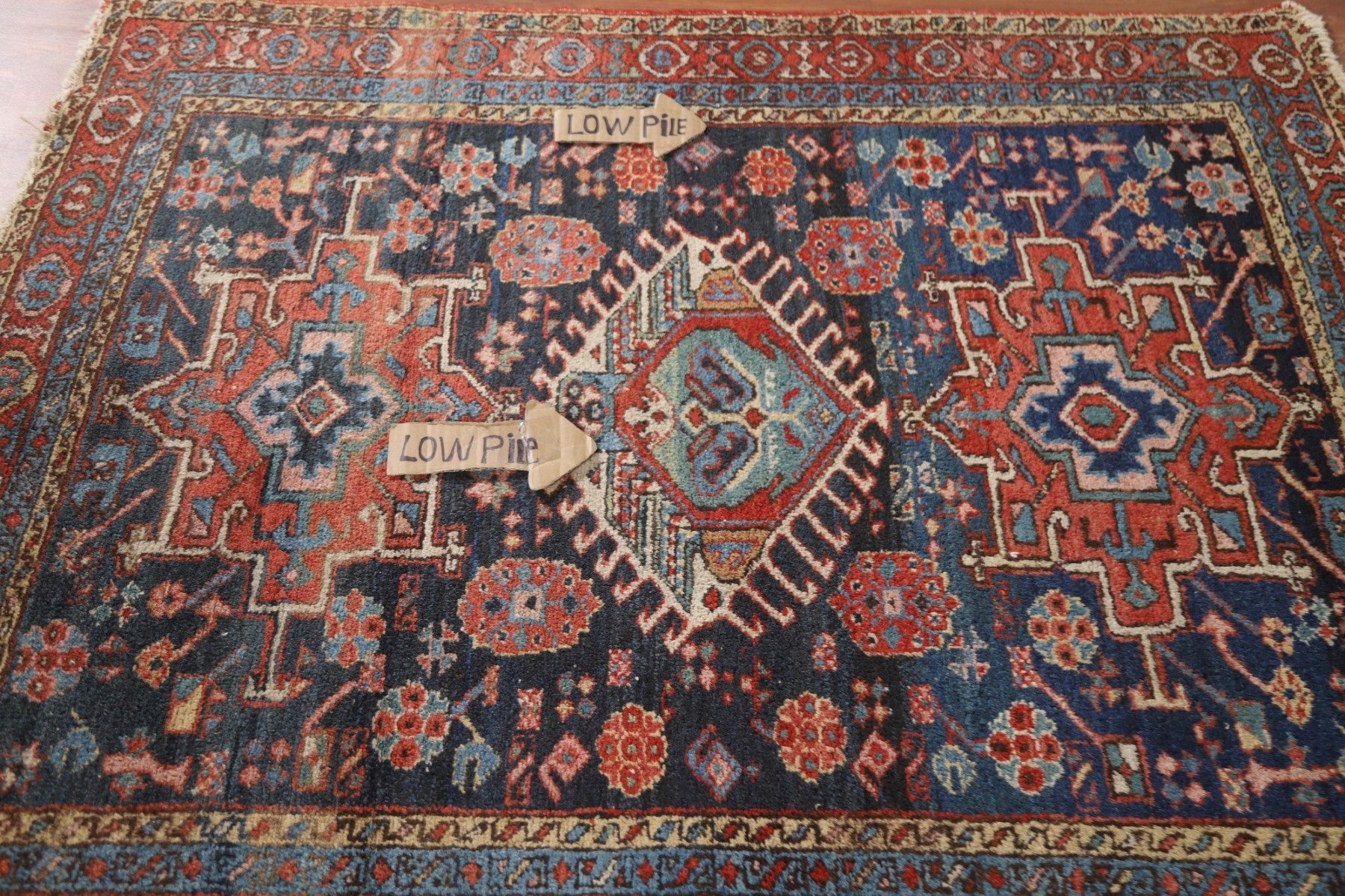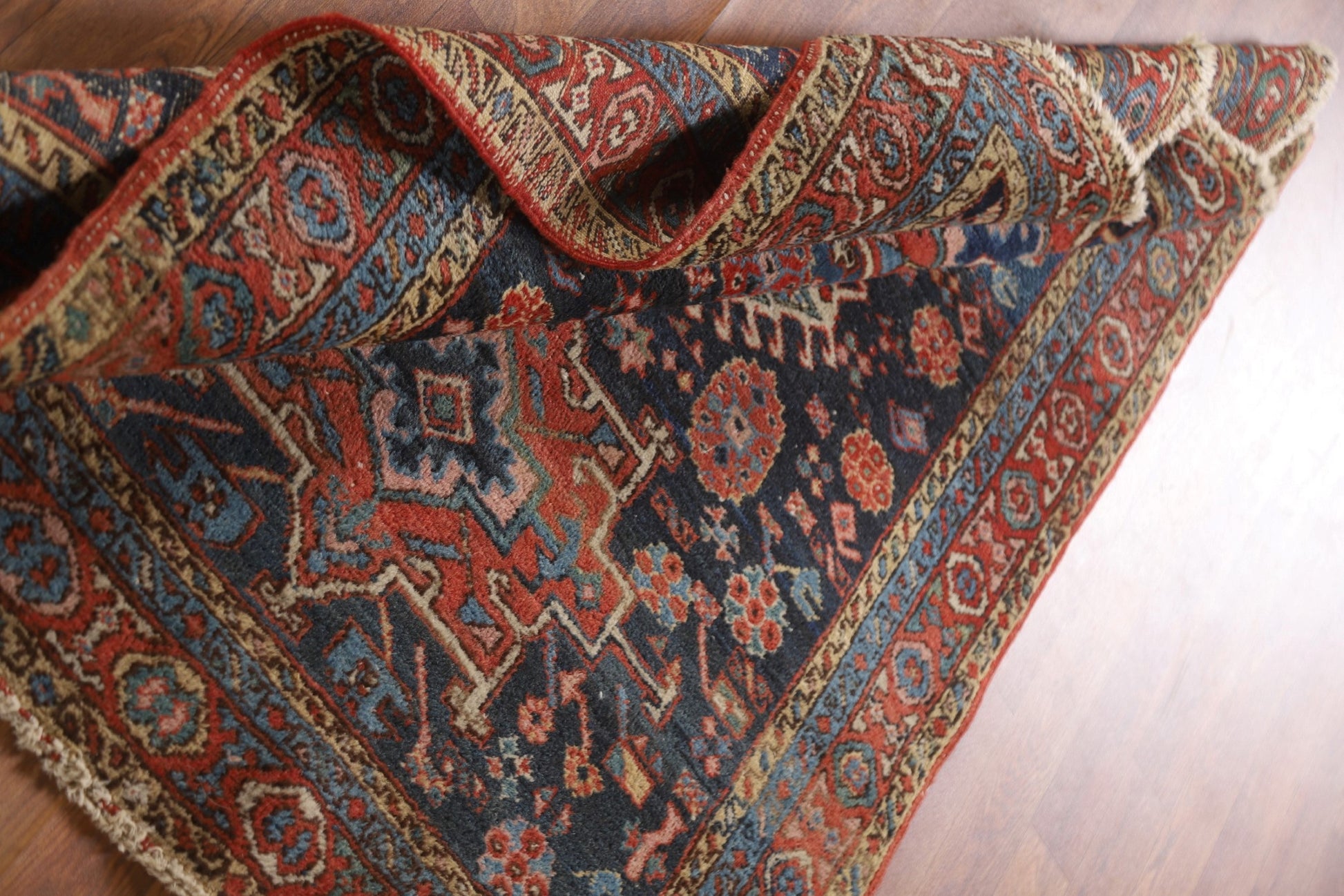A Beautiful Genuine Persia ( Persia ) Heriz (serapi) rug is Hand Knotted by skillful weavers in Persia ( Persia ) with 100% Wool Material. This rug is in Very Good (Low Pile-Abrash) condition. dimensions are 4' 9'' X 3' 11'' in foot and 145 X 119 in centimeter. the primary color is Navy Blue & Blues.