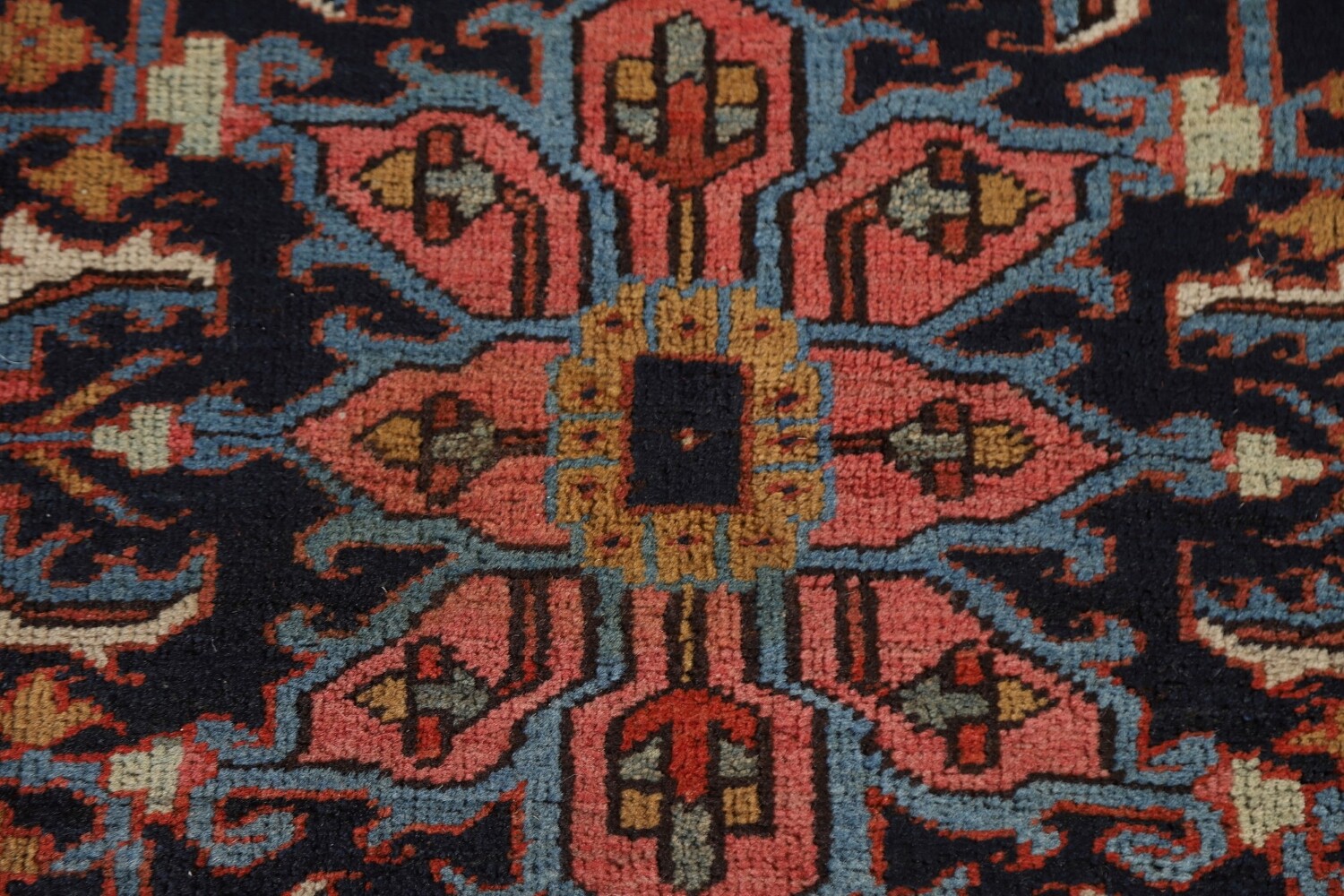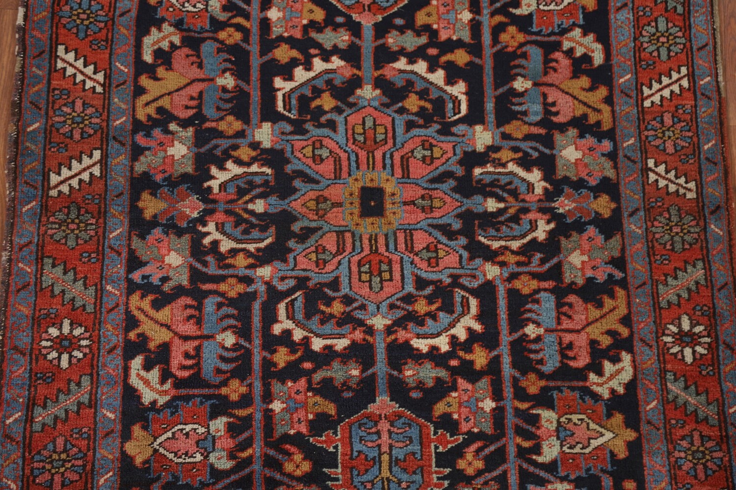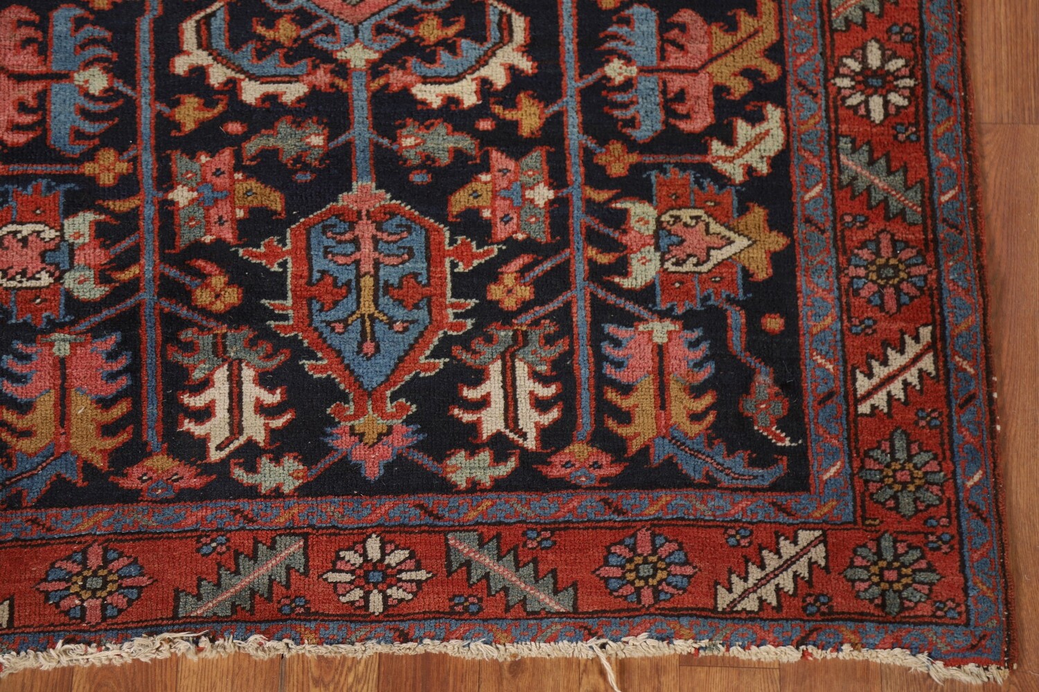 A Beautiful Genuine Persia ( Persia ) Heriz (serapi) rug is Hand Knotted by skillful weavers in Persia ( Persia ) with 100% Wool Material. This rug is in Very Good (Evenly Low Pile) condition. dimensions are 4' 10'' X 3' 8'' in foot and 147 X 112 in centimeter. the primary color is Navy Blue & Blues.