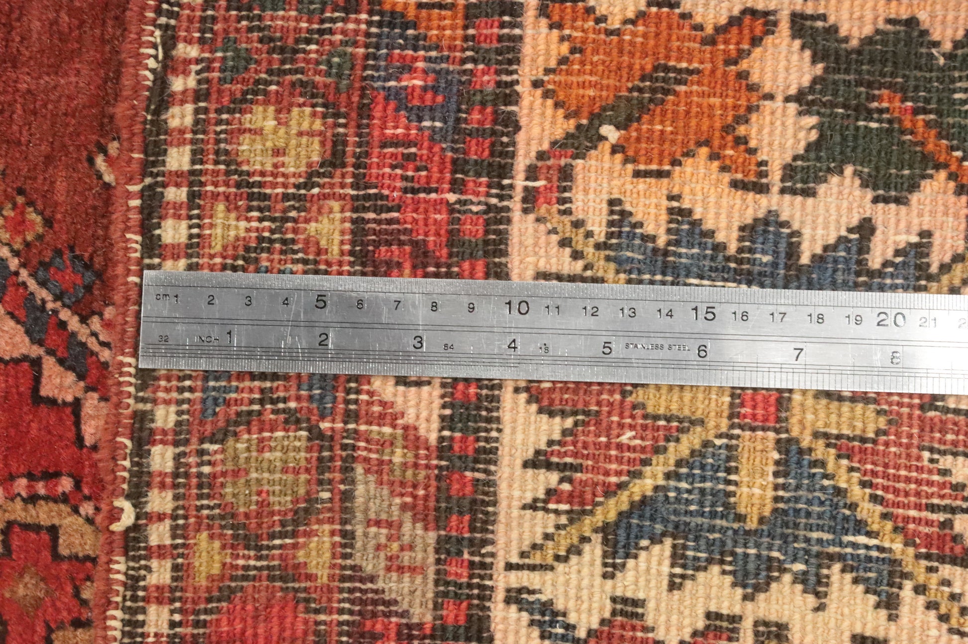 A Beautiful Genuine Persia ( Persia ) Heriz (serapi) rug is Hand Knotted by skillful weavers in Persia ( Persia ) with 100% Wool Material. This rug is in Very Good ( Bleeding) condition. dimensions are 10' 4'' X 3' 9'' in foot and 315 X 114 in centimeter. the primary color is Oranges & Rust.