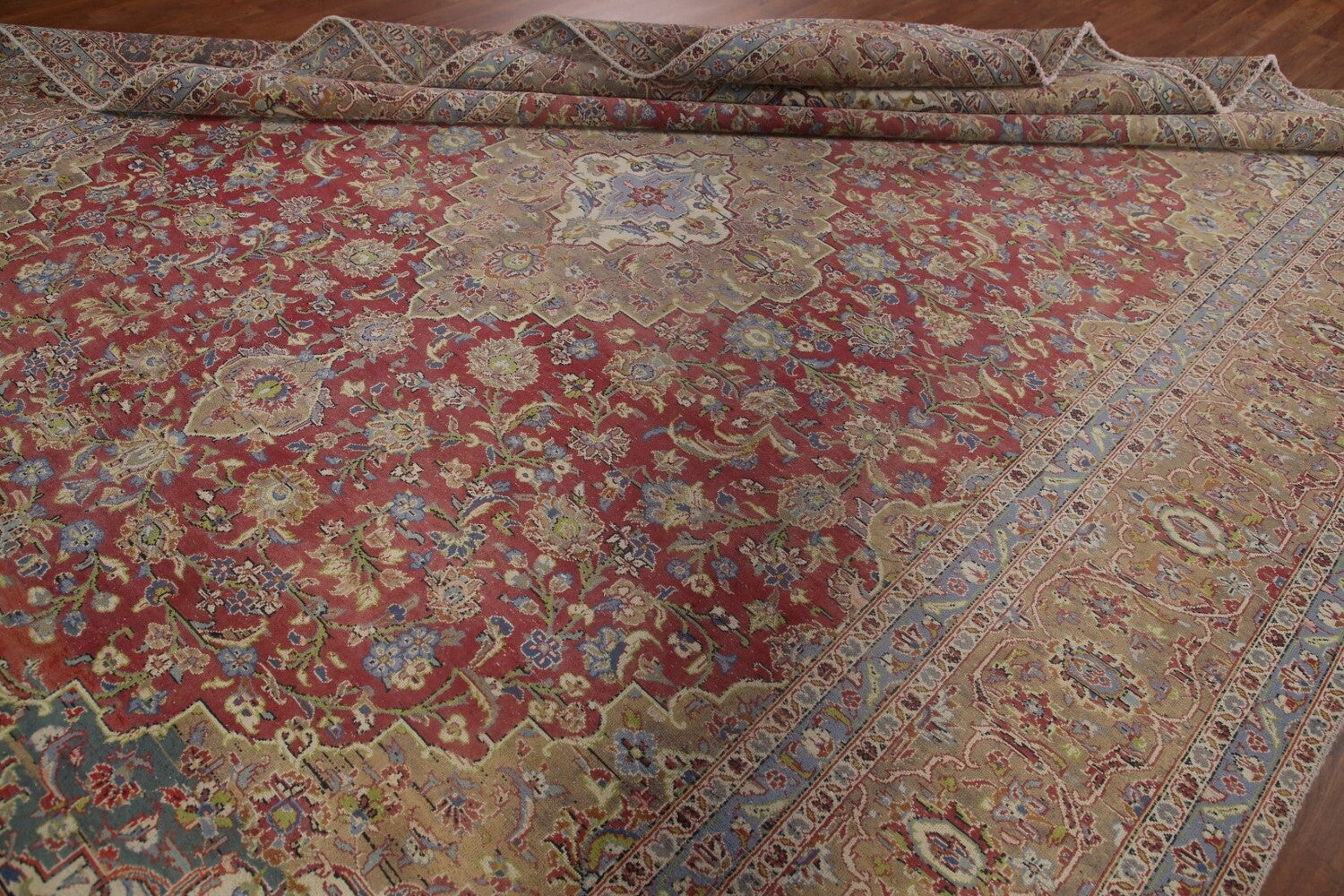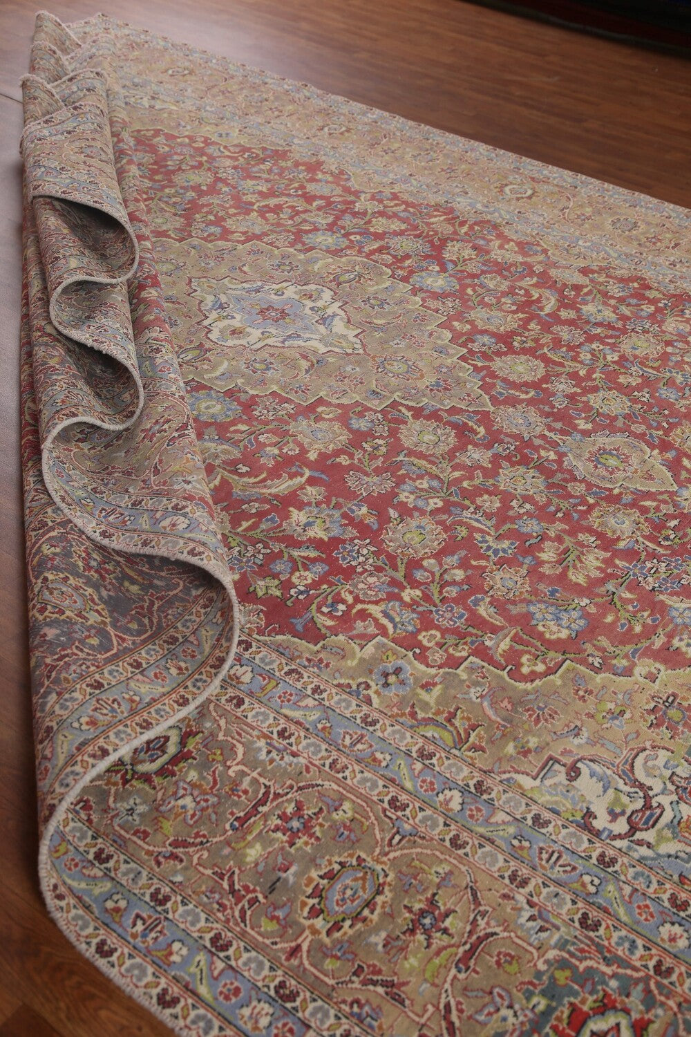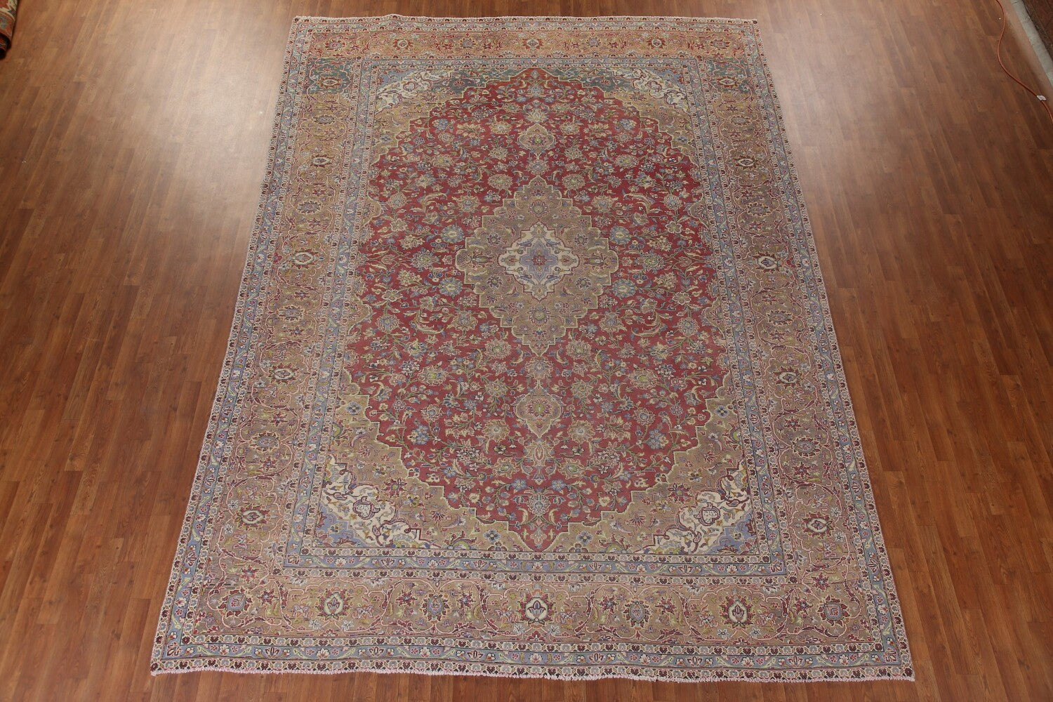 A Beautiful Genuine Persia ( Persia ) Kashan rug is Hand Knotted by skillful weavers in Persia ( Persia ) with 100% Wool Material. This rug is in Very Good (Low Pile-Abrash) condition. dimensions are 13' 1'' X 9' 6'' in foot and 399 X 290 in centimeter. the primary color is Red.