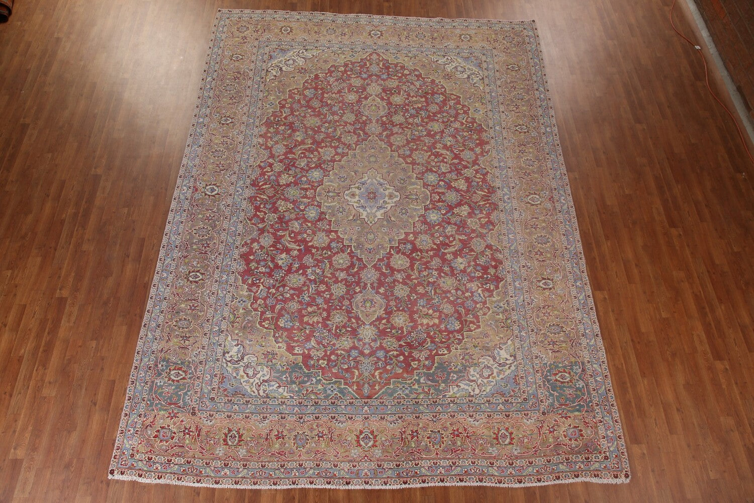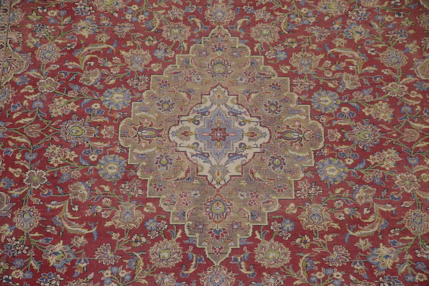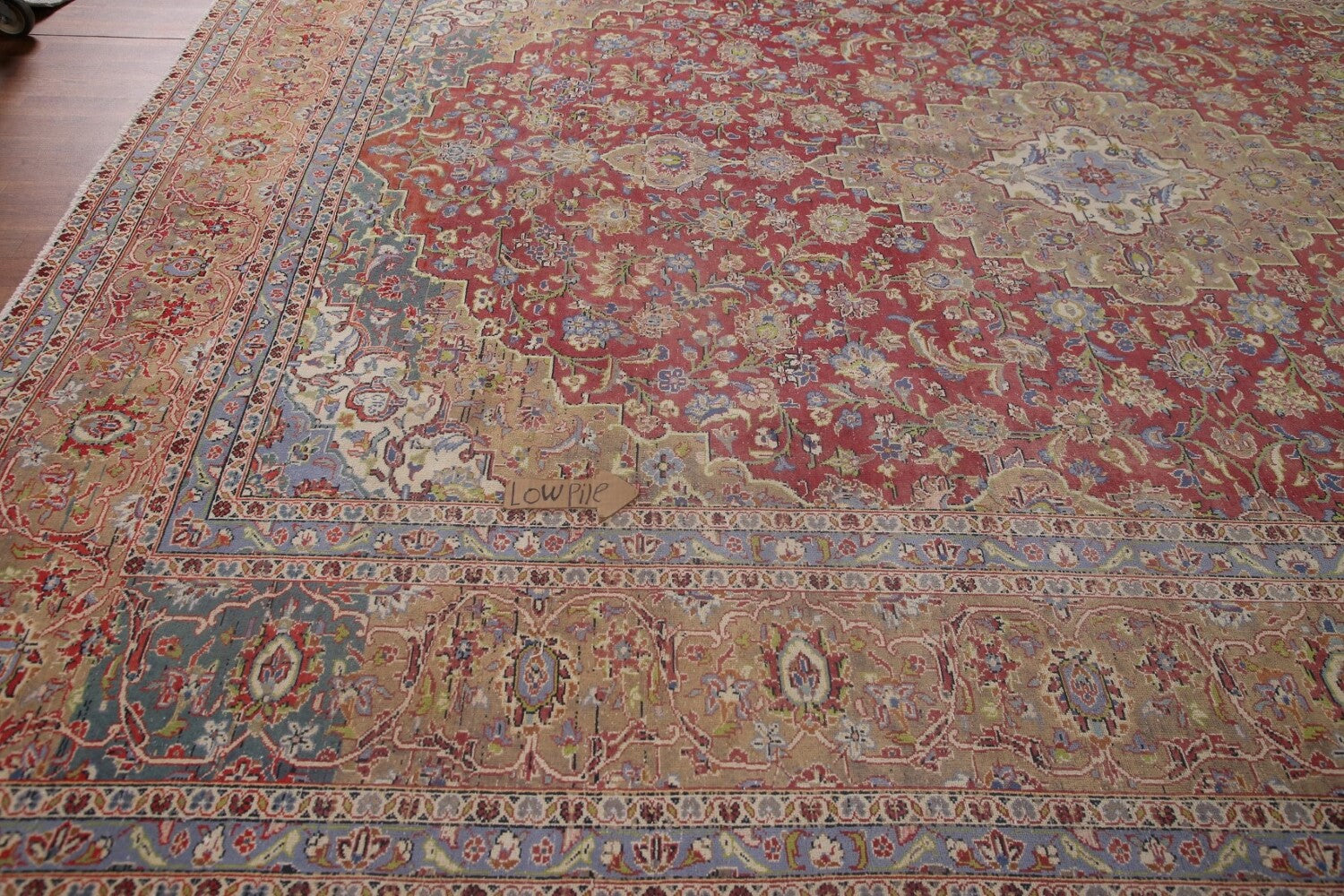 A Beautiful Genuine Persia ( Persia ) Kashan rug is Hand Knotted by skillful weavers in Persia ( Persia ) with 100% Wool Material. This rug is in Very Good (Low Pile-Abrash) condition. dimensions are 13' 1'' X 9' 6'' in foot and 399 X 290 in centimeter. the primary color is Red.