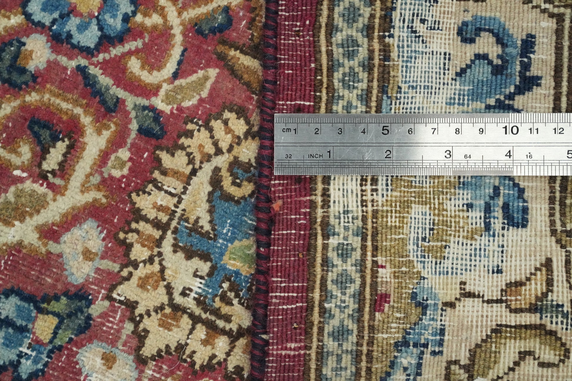 A Beautiful Genuine Persia ( Persia ) Kerman rug is Hand Knotted by skillful weavers in Persia ( Persia ) with 100% Wool Material. This rug is in Very Good (Evenly Low Pile) condition. dimensions are 14' 5'' X 11' 0'' in foot and 439 X 335 in centimeter. the primary color is Red.