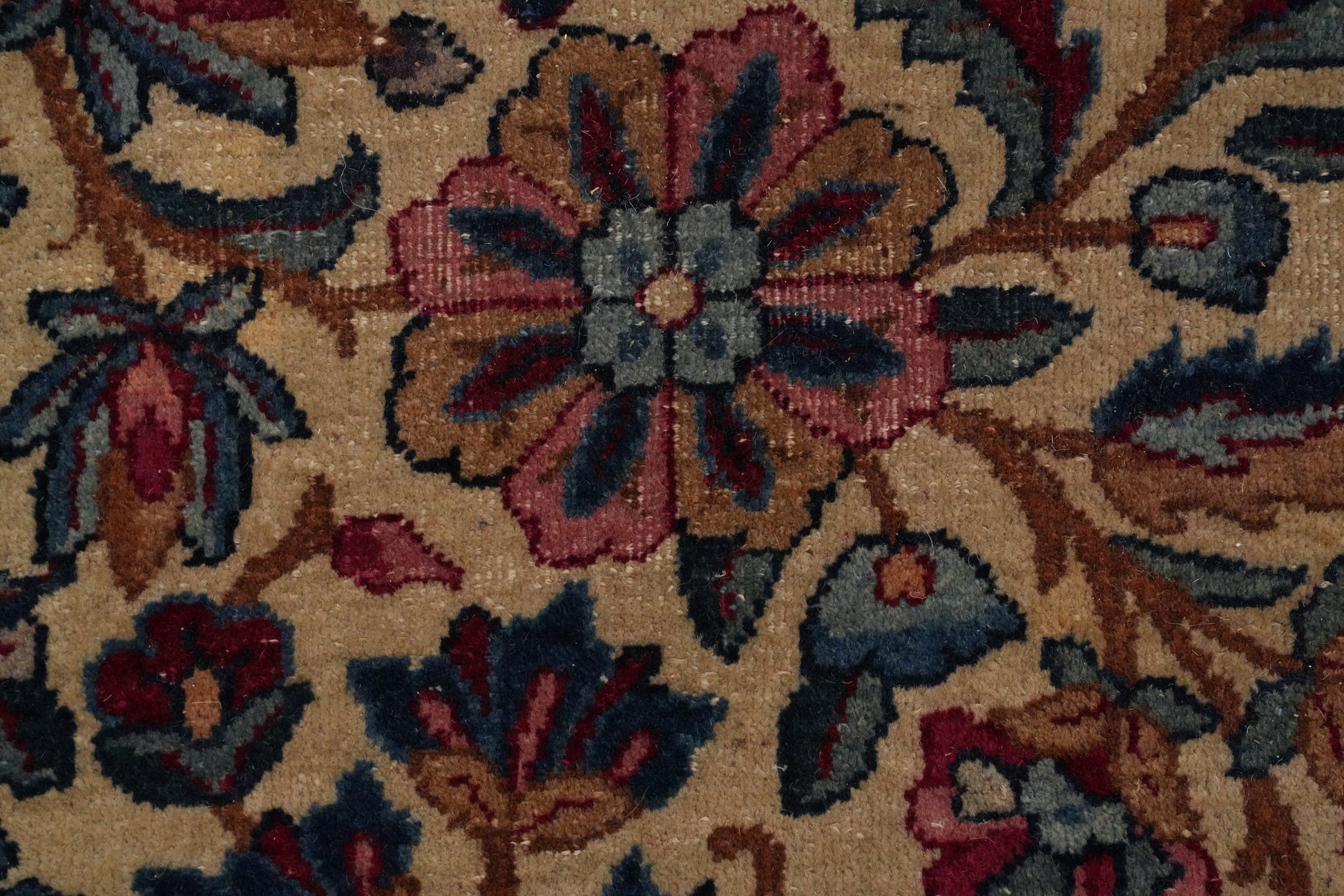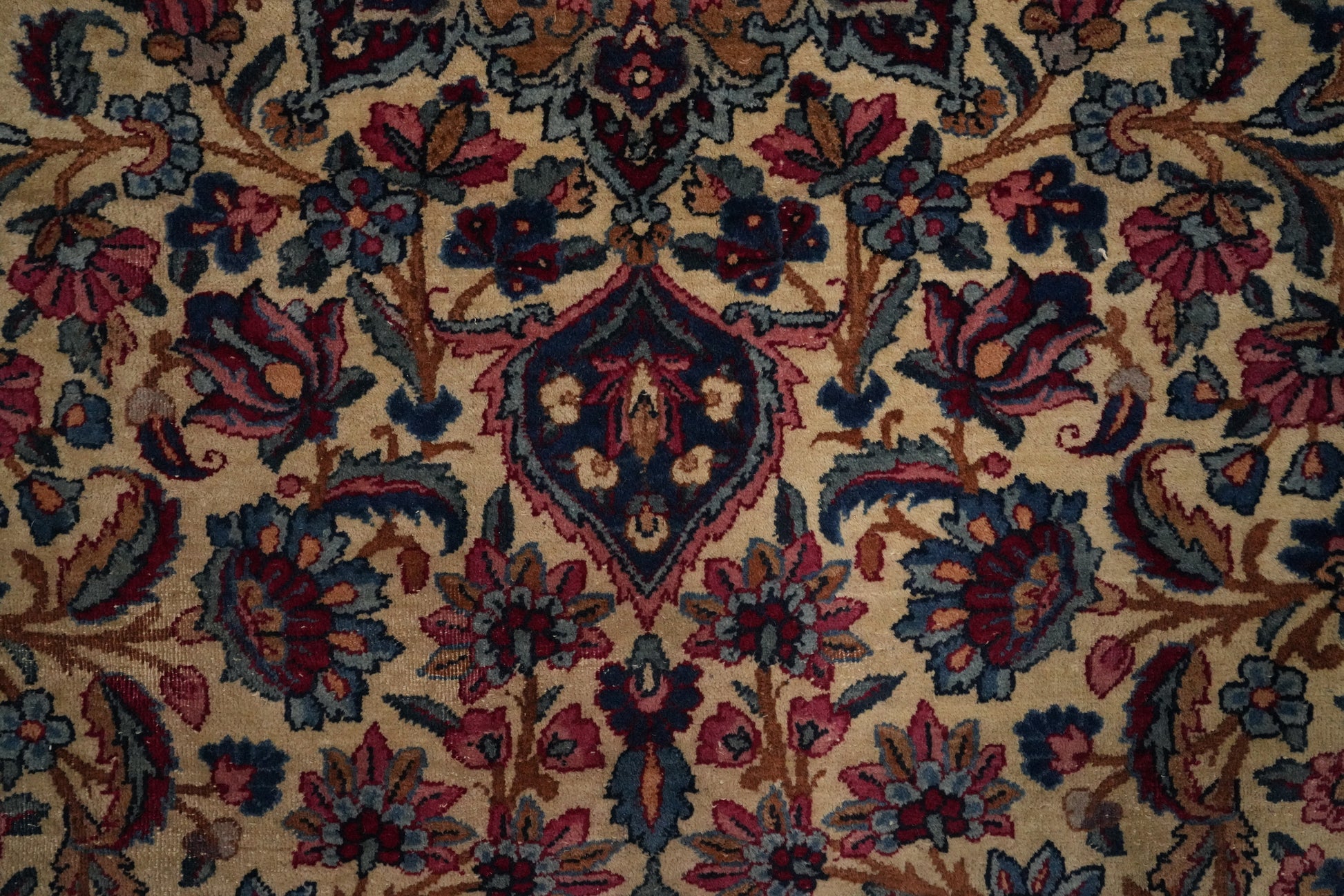 A Beautiful Genuine Persia ( Persia ) Kerman rug is Hand Knotted by skillful weavers in Persia ( Persia ) with 100% Wool Material. This rug is in Very Good (Low Pile-Stain) condition. dimensions are 15' 5'' X 10' 9'' in foot and 470 X 328 in centimeter. the primary color is Beige & Ivories.