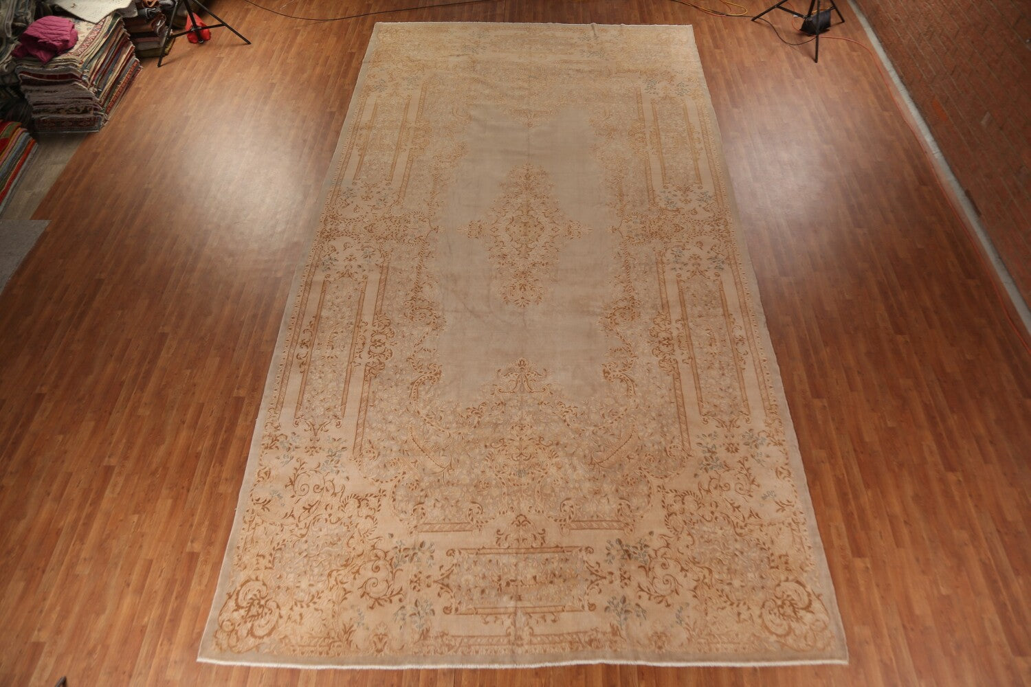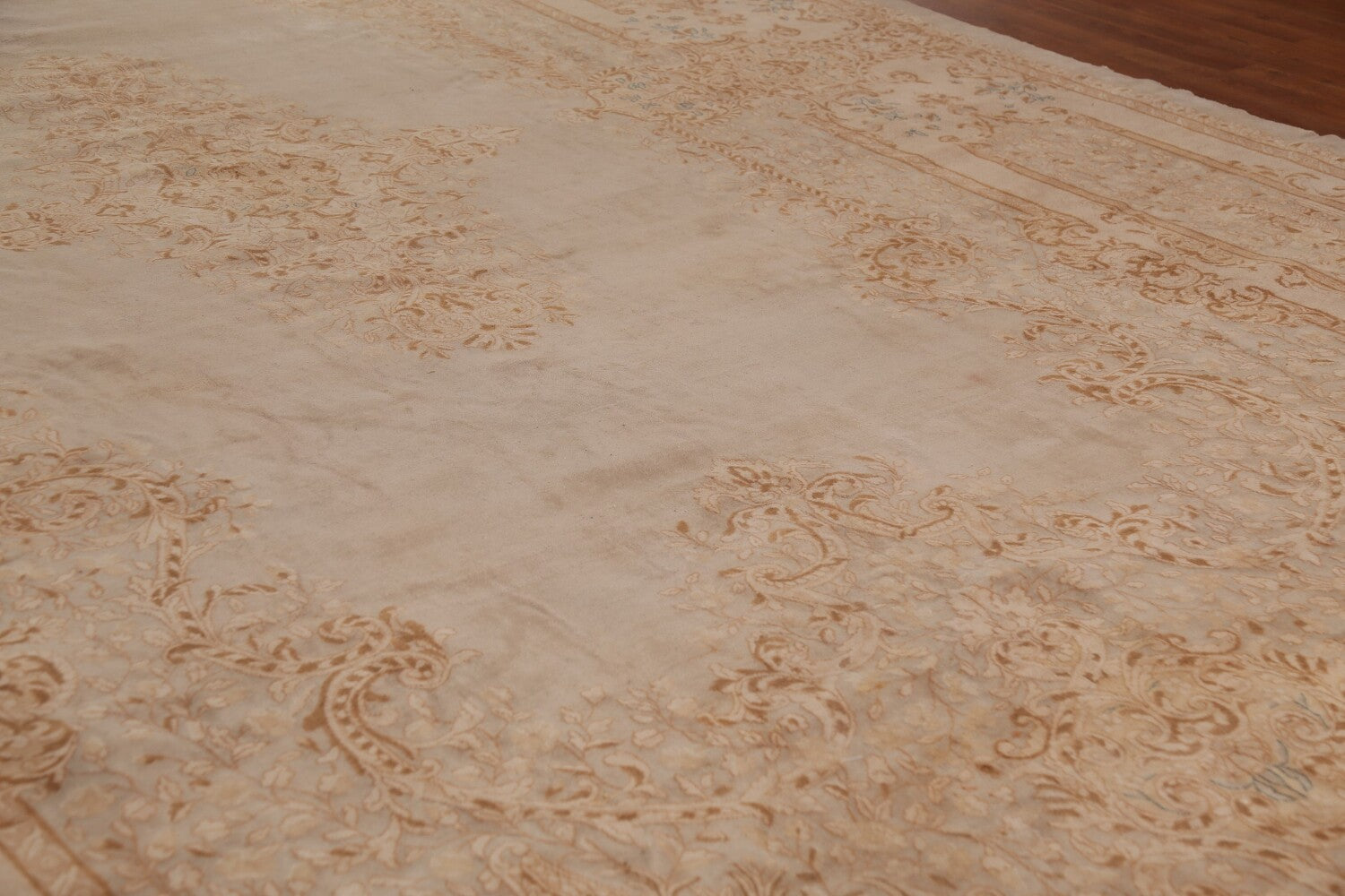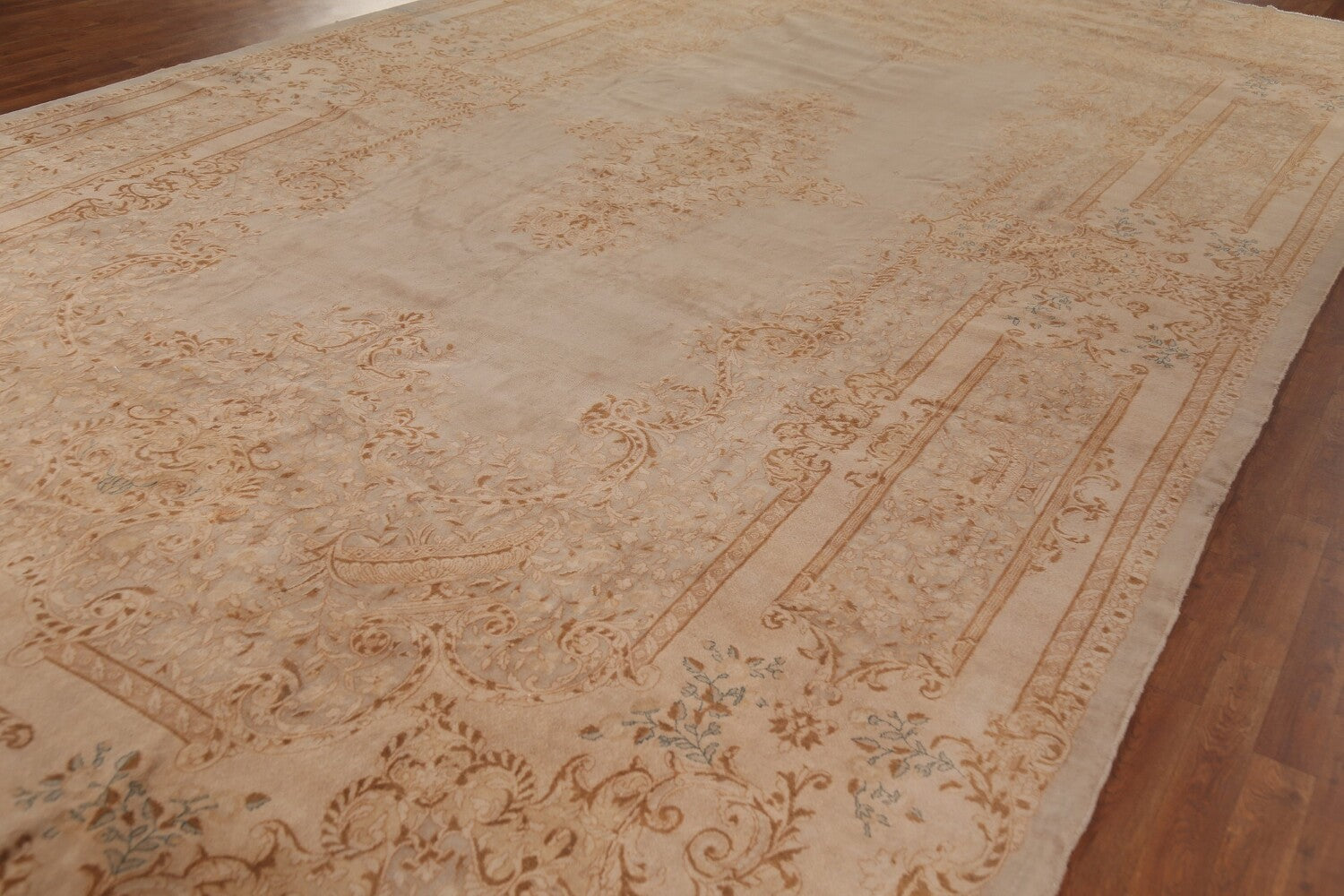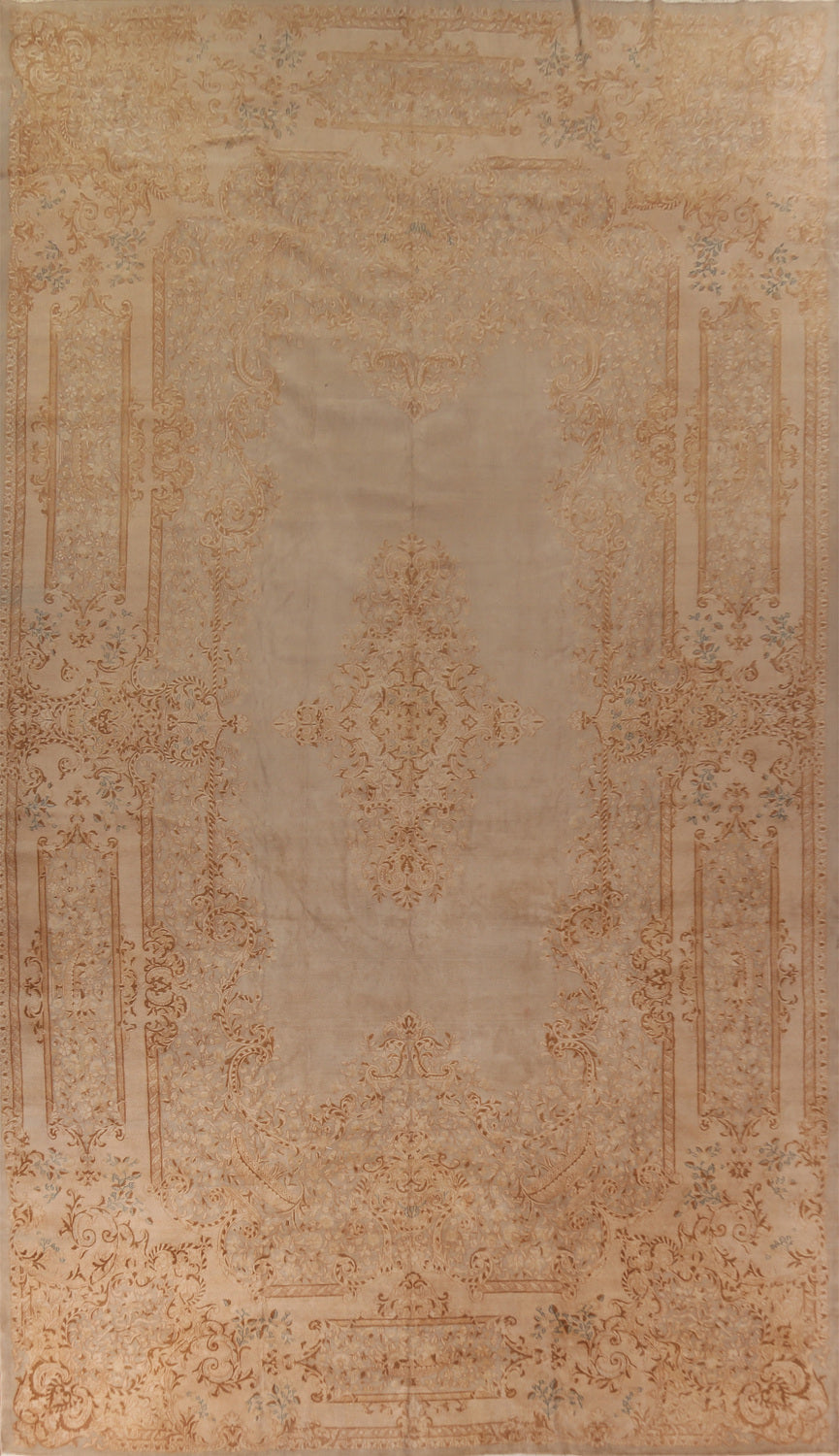 A Beautiful Genuine Persia ( Persia ) Kerman rug is Hand Knotted by skillful weavers in Persia ( Persia ) with 100% Wool Material. This rug is in Very Good condition. dimensions are 19' 9'' X 10' 6'' in foot and 602 X 320 in centimeter. the primary color is Beige & Ivories.