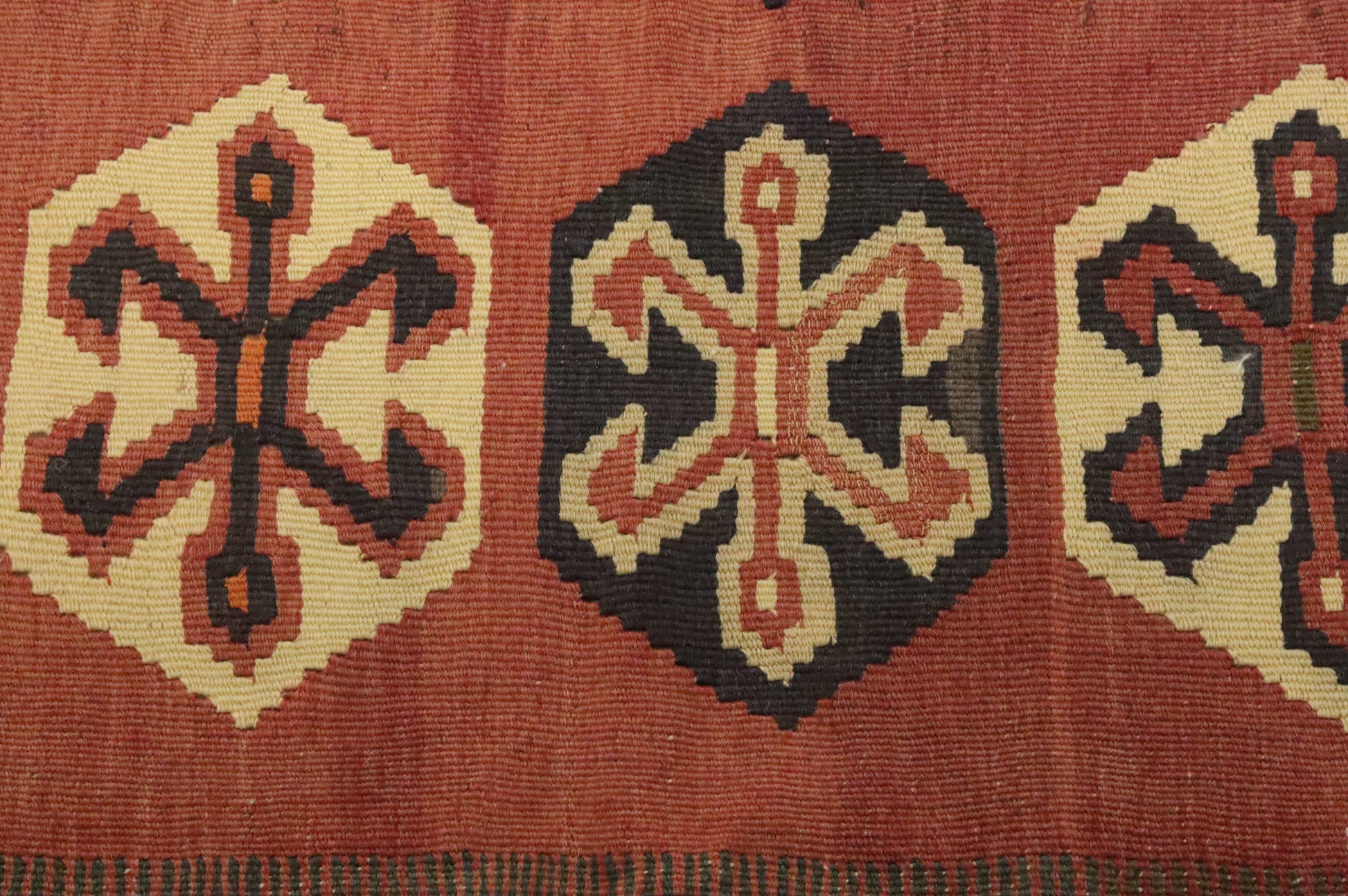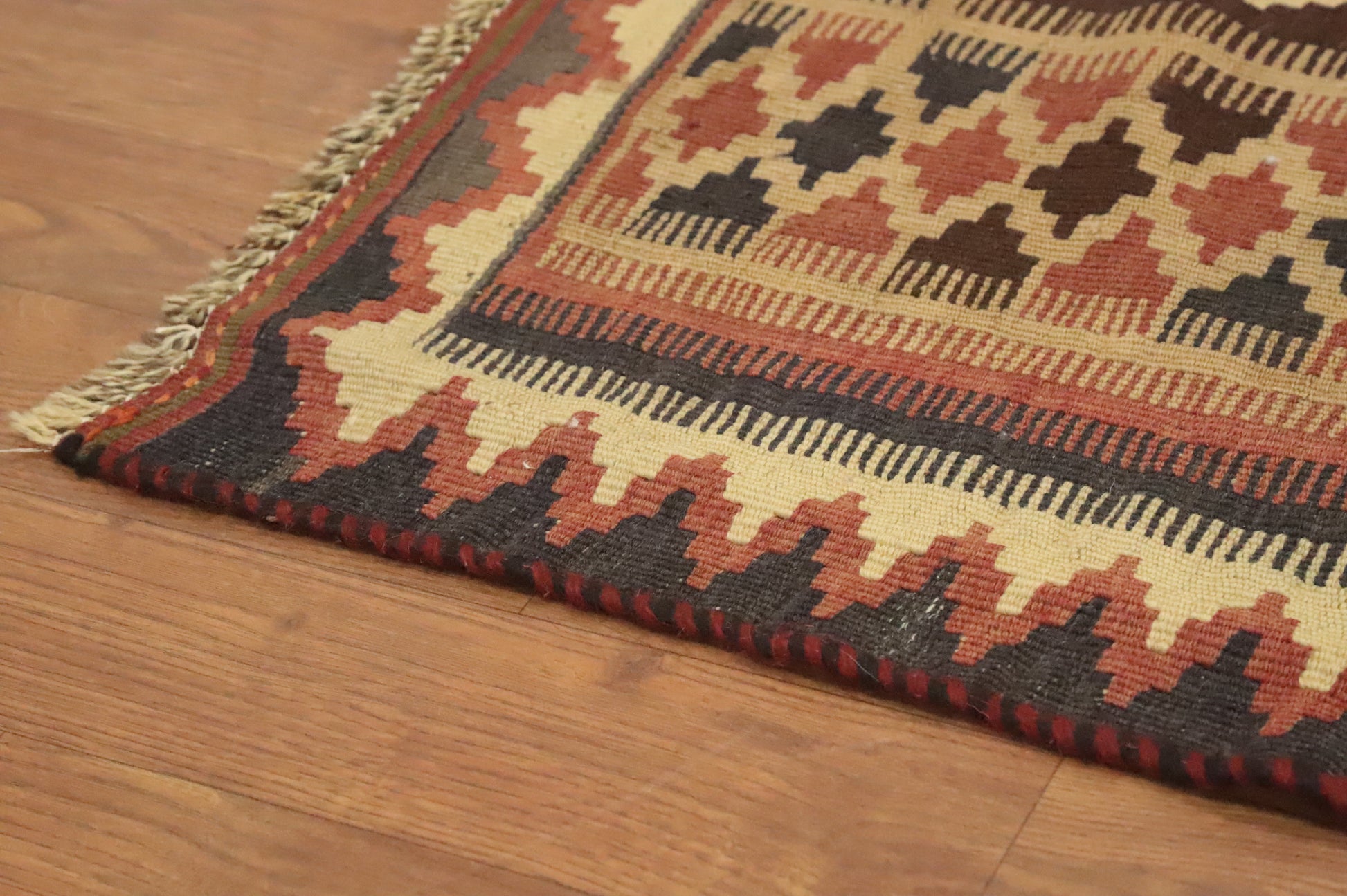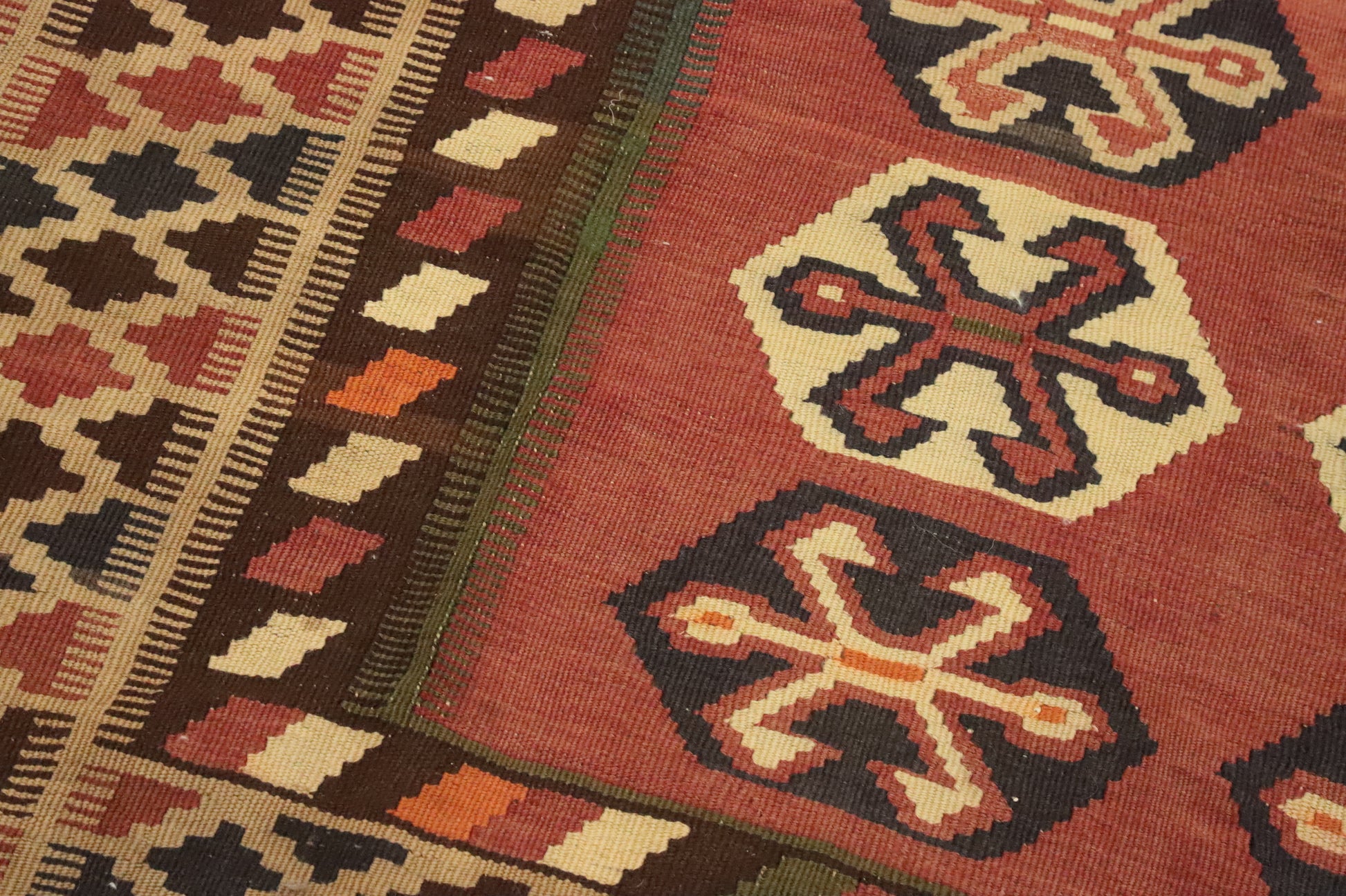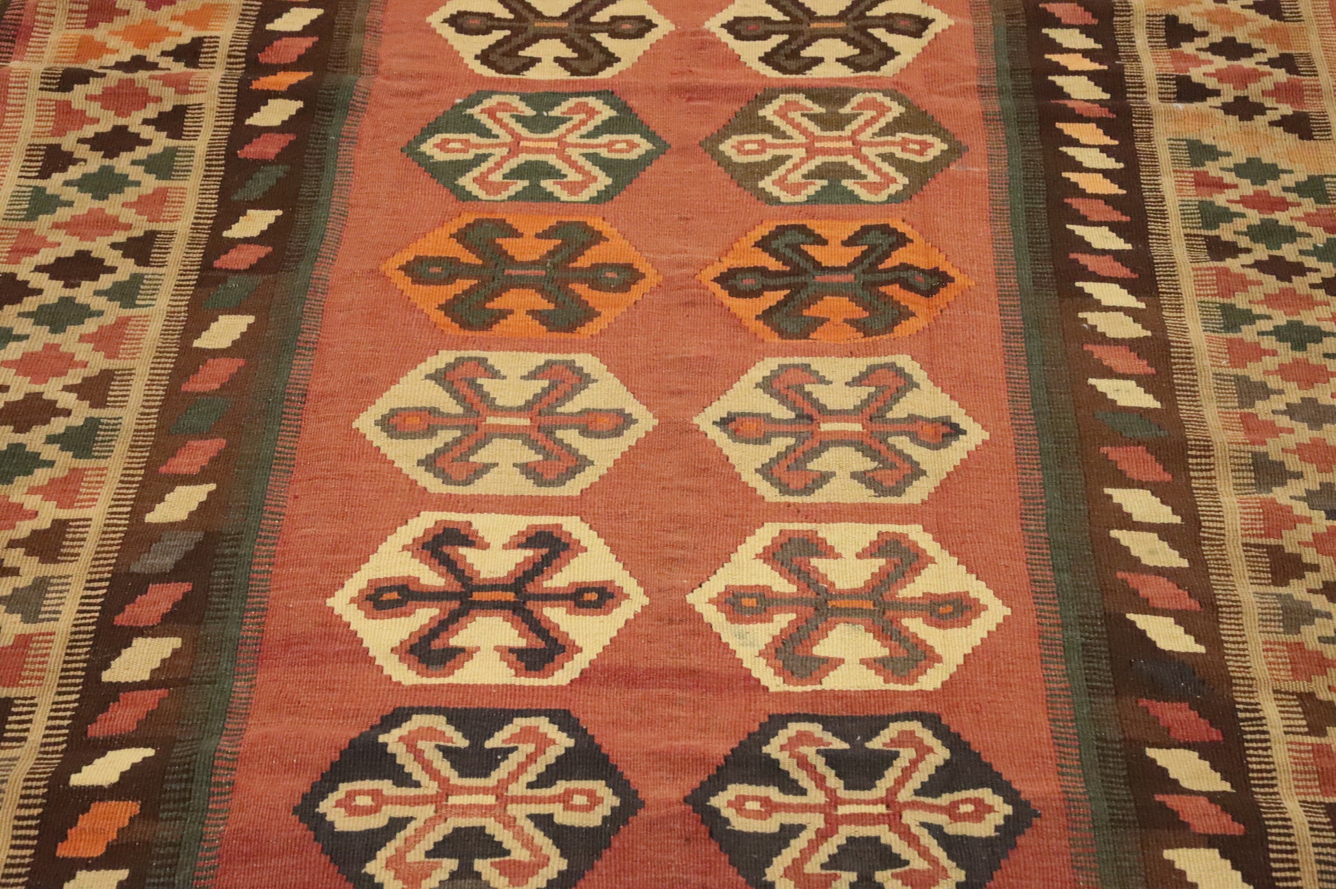 A Beautiful Genuine Persia ( Persia ) Kilim (Qashqai) rug is Hand Woven by skillful weavers in Persia ( Persia ) with 100% Wool Material. This rug is in Very Good (Abrash) condition. dimensions are 8' 11'' X 4' 10'' in foot and  272 X 147 in centimeter. the primary color is Oranges & Rust.