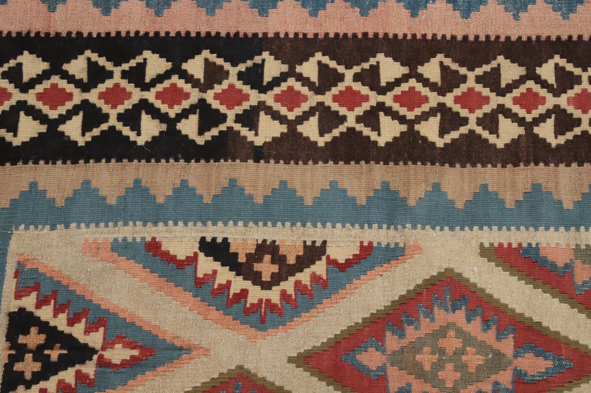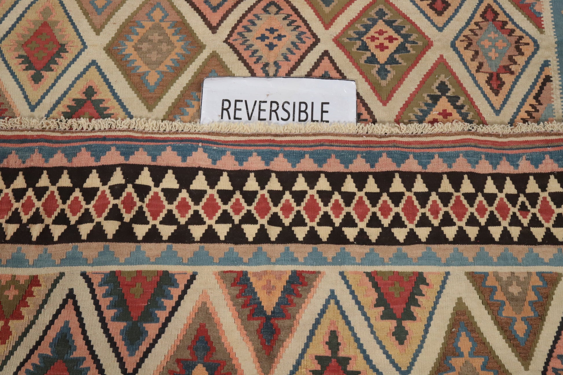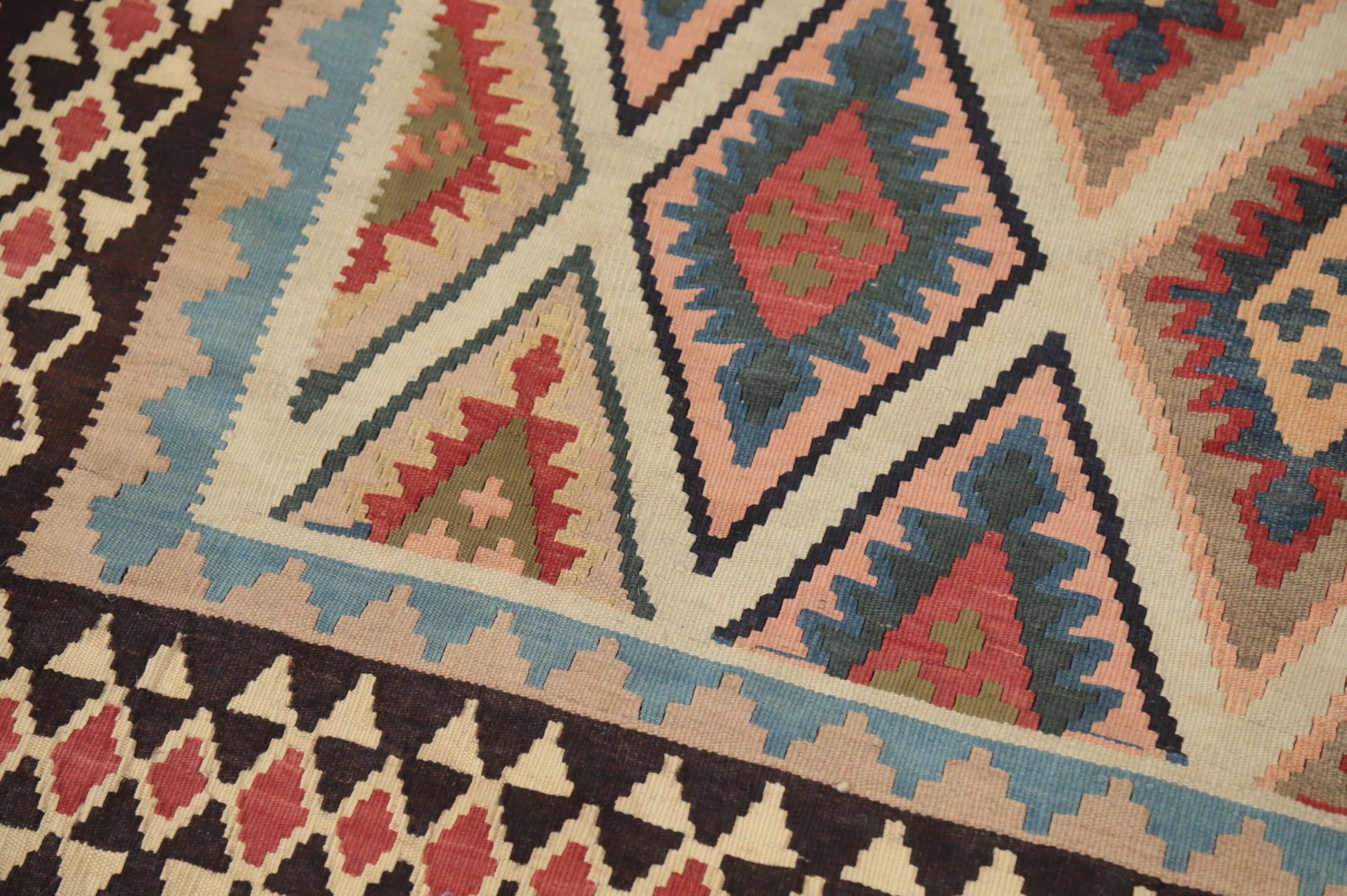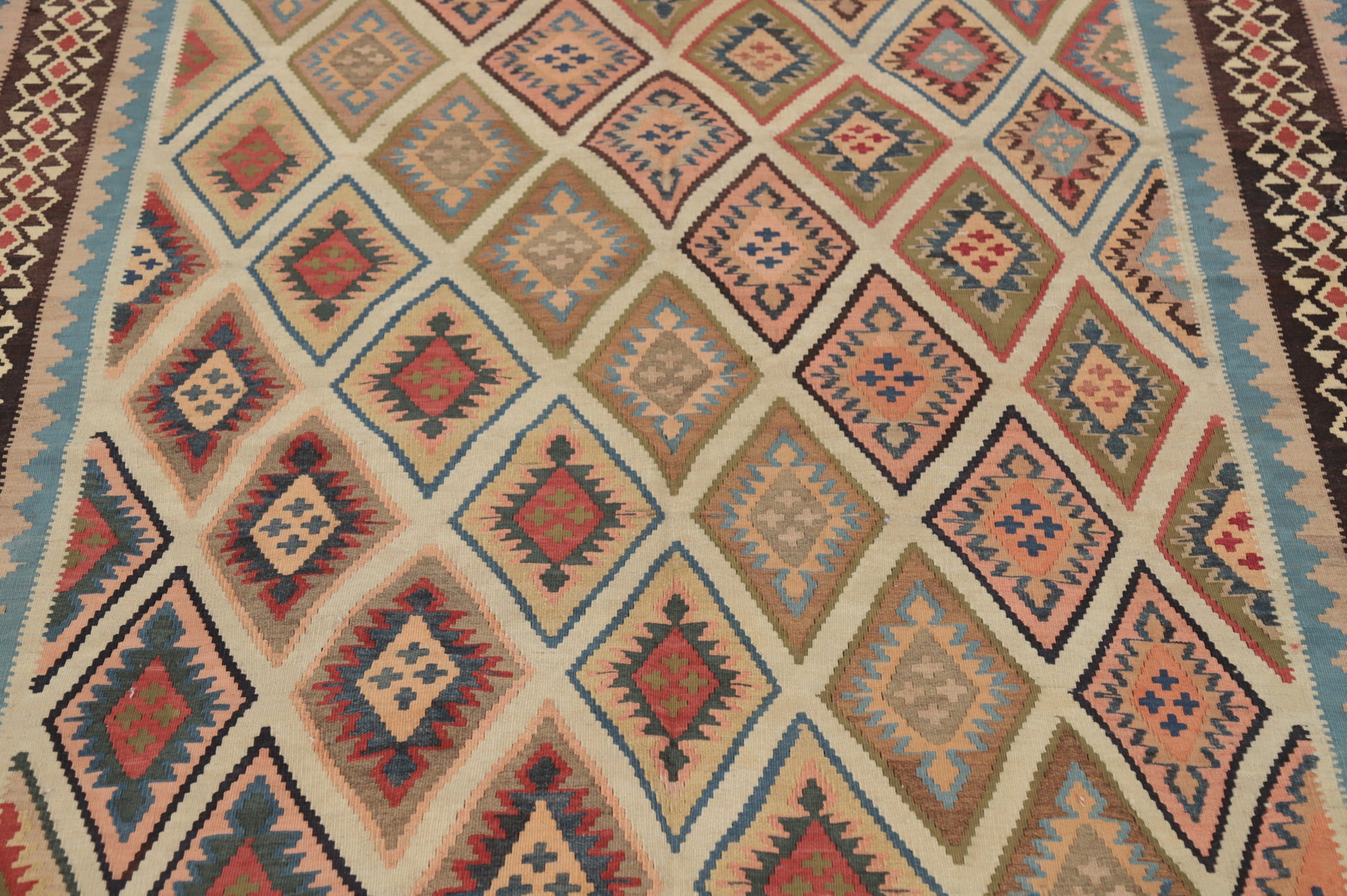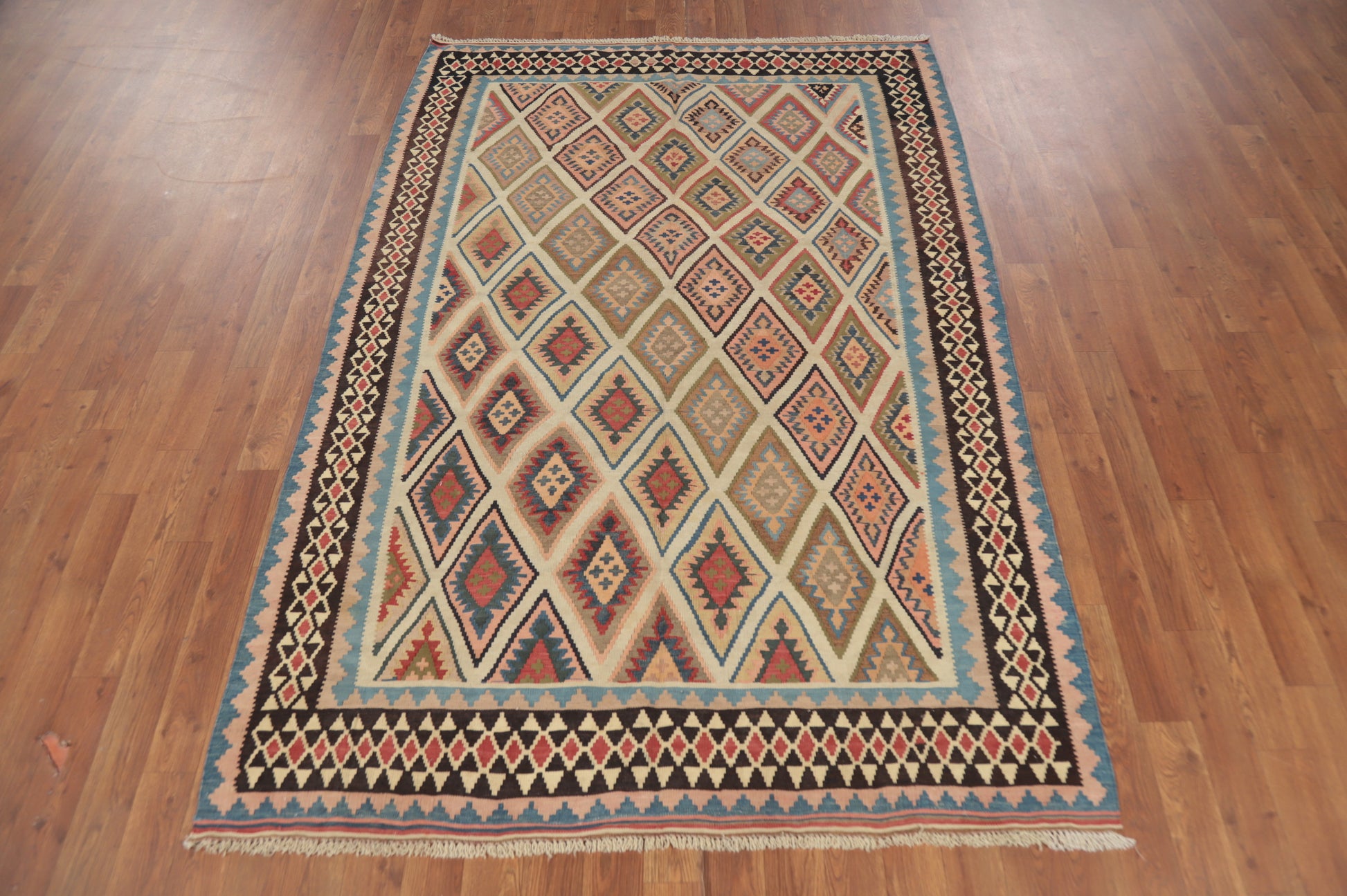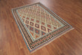 A Beautiful Genuine Persia ( Persia ) Kilim (Qashqai) rug is Hand Woven by skillful weavers in Persia ( Persia ) with 100% Wool Material. This rug is in Very Good (Abrash-Repair) condition. dimensions are 6' 8'' X 4' 5'' in foot and 203 X 135 in centimeter. the primary color is Beige & Ivories.