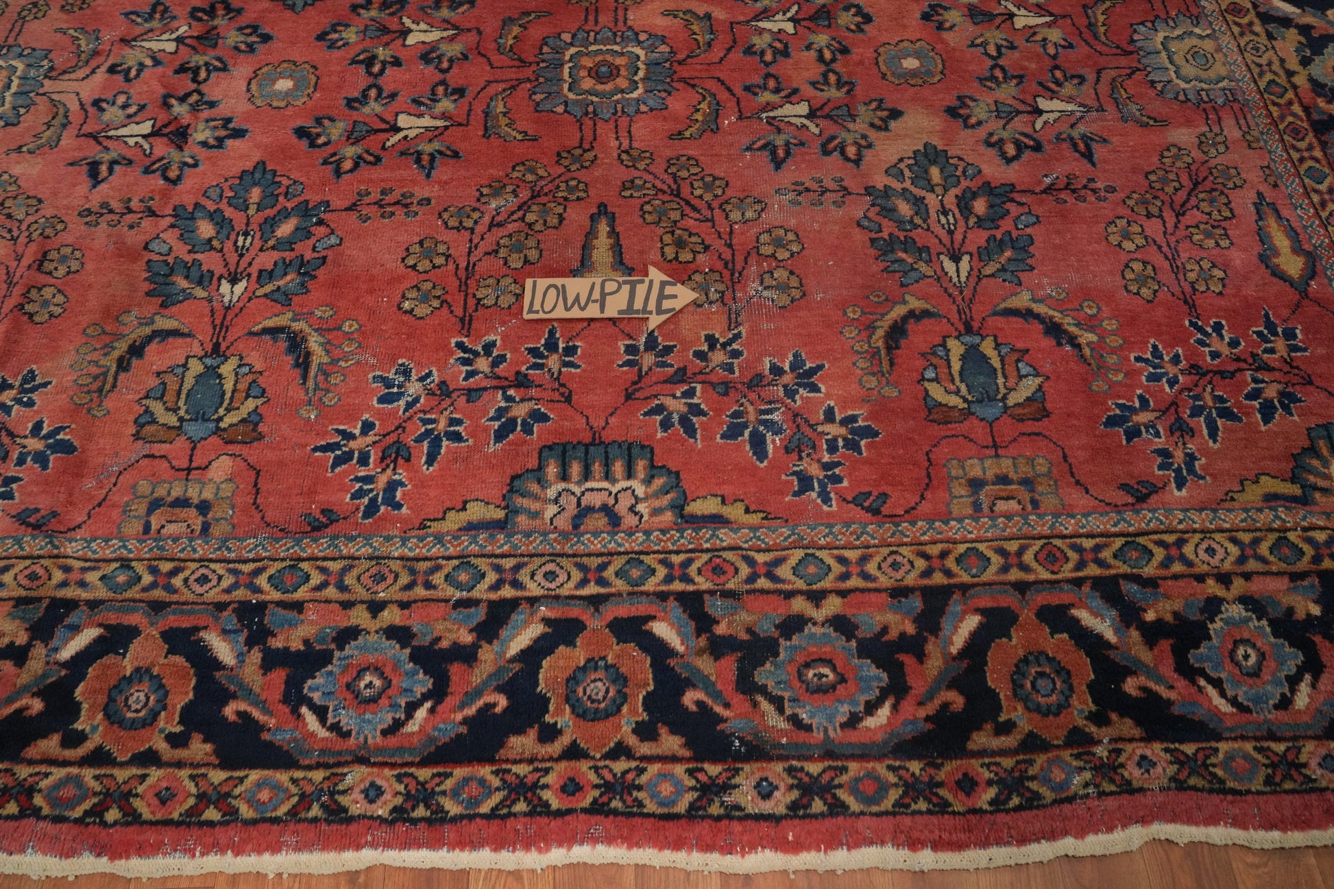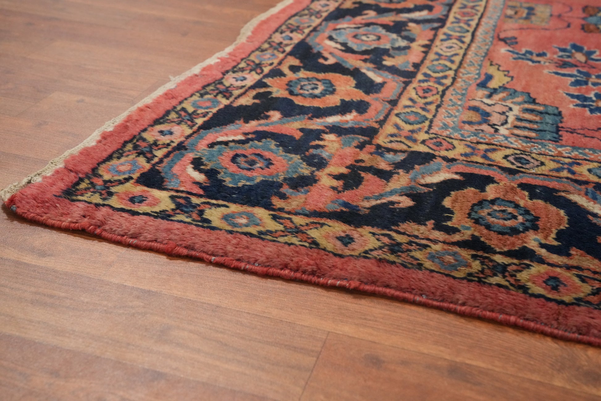 A Beautiful Genuine Persia ( Persia ) Mahal rug is Hand Knotted by skillful weavers in Persia ( Persia ) with 100% Wool Material. This rug is in Very Good ( Low Pile ) condition. dimensions are 12' 1'' X 8' 7'' in foot and 368 X 262 in centimeter. the primary color is Coral.