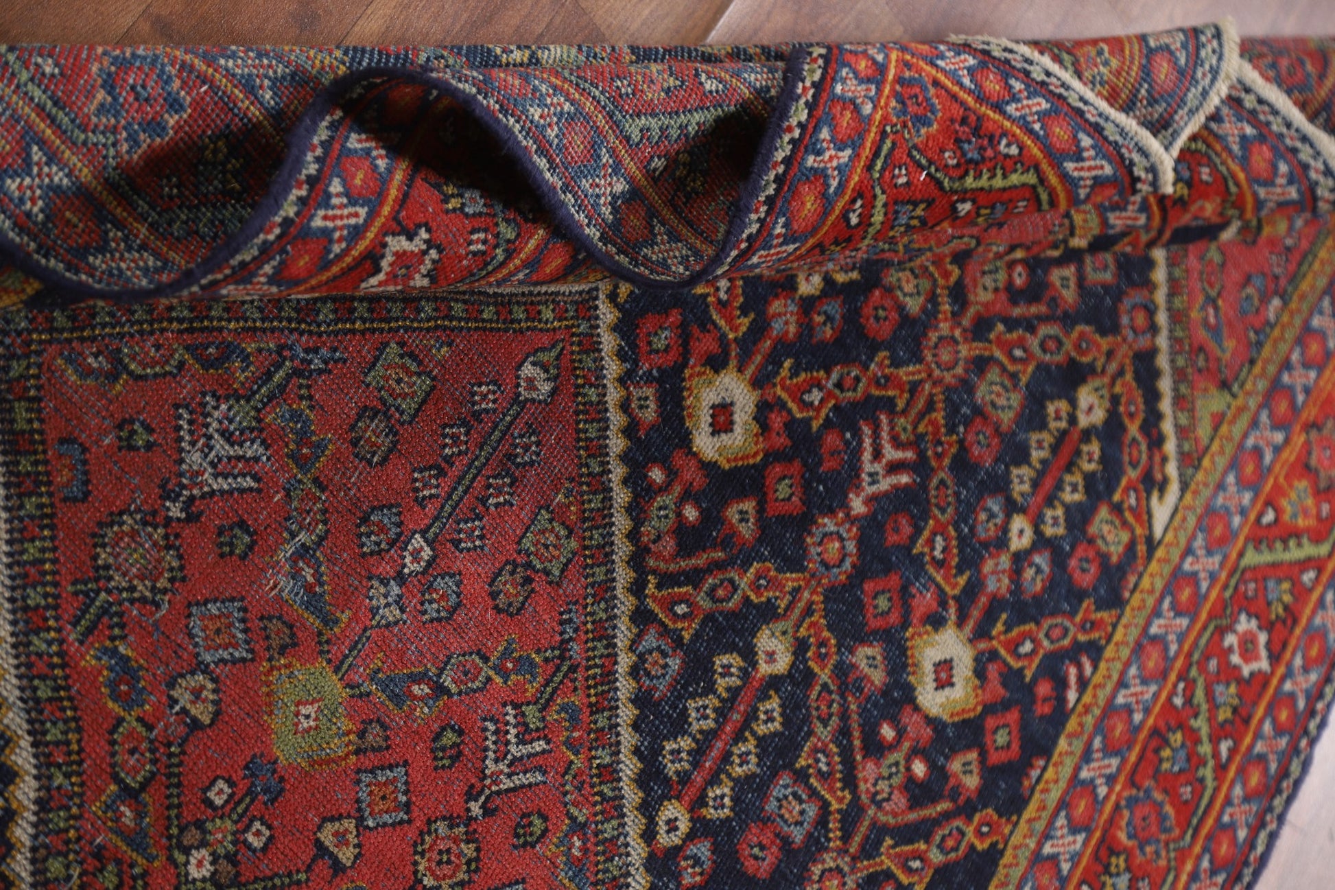 A Beautiful Genuine Persia ( Persia ) Mahal rug is Hand Knotted by skillful weavers in Persia ( Persia ) with 100% Wool Material. This rug is in Very Good (Evenly Low Pile) condition. dimensions are 6' 6'' X 4' 1'' in foot and 198 X 124 in centimeter. the primary color is Navy Blue & Blues.