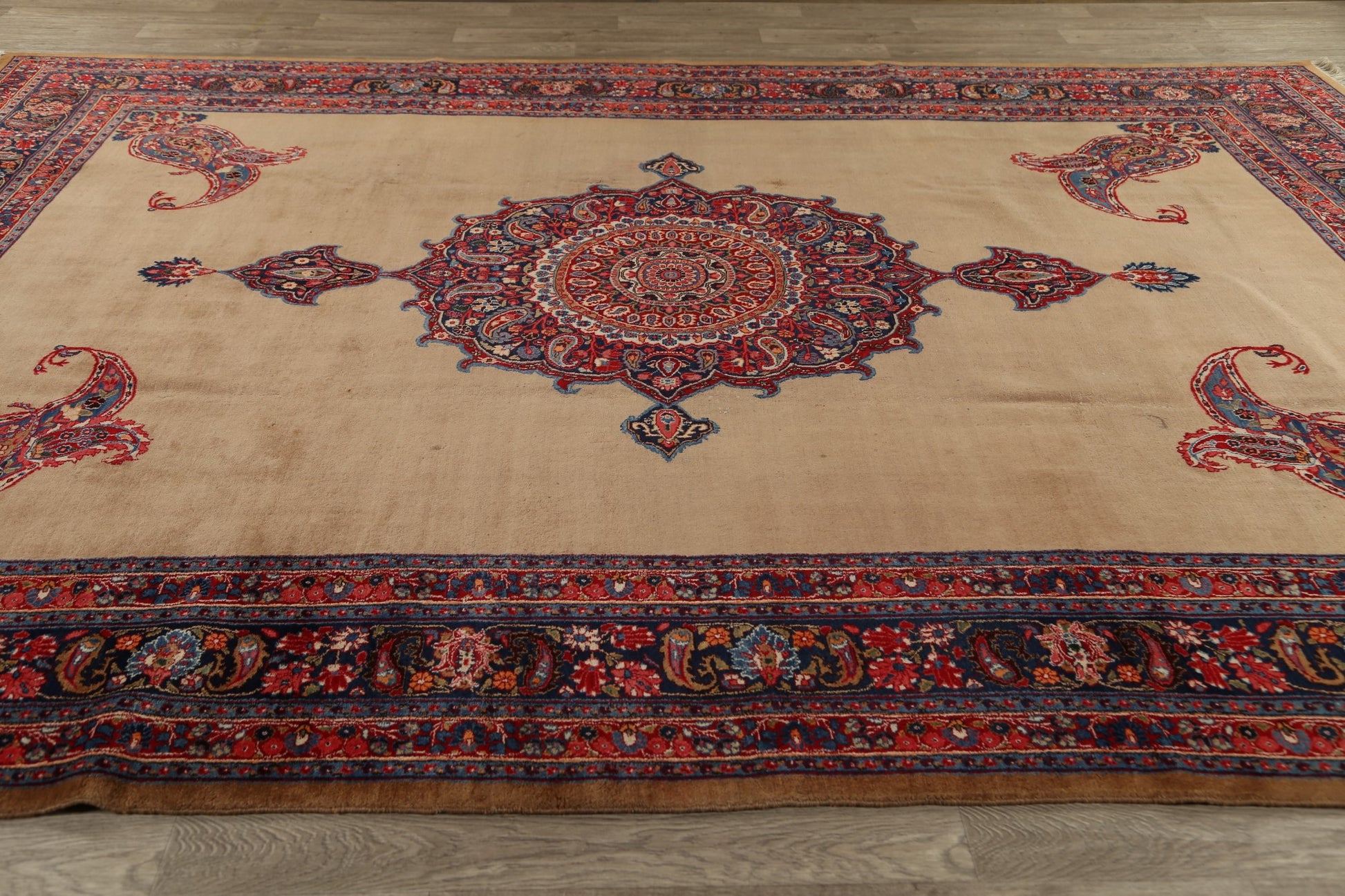 A Beautiful Genuine Persia ( Persia ) Mashad rug is Hand Knotted by skillful weavers in Persia ( Persia ) with 100% Wool Material. This rug is in Very Good ( Low Pile ) condition. dimensions are 13' 1'' X 9' 9'' in foot and 399 X 297 in centimeter. the primary color is Brown.