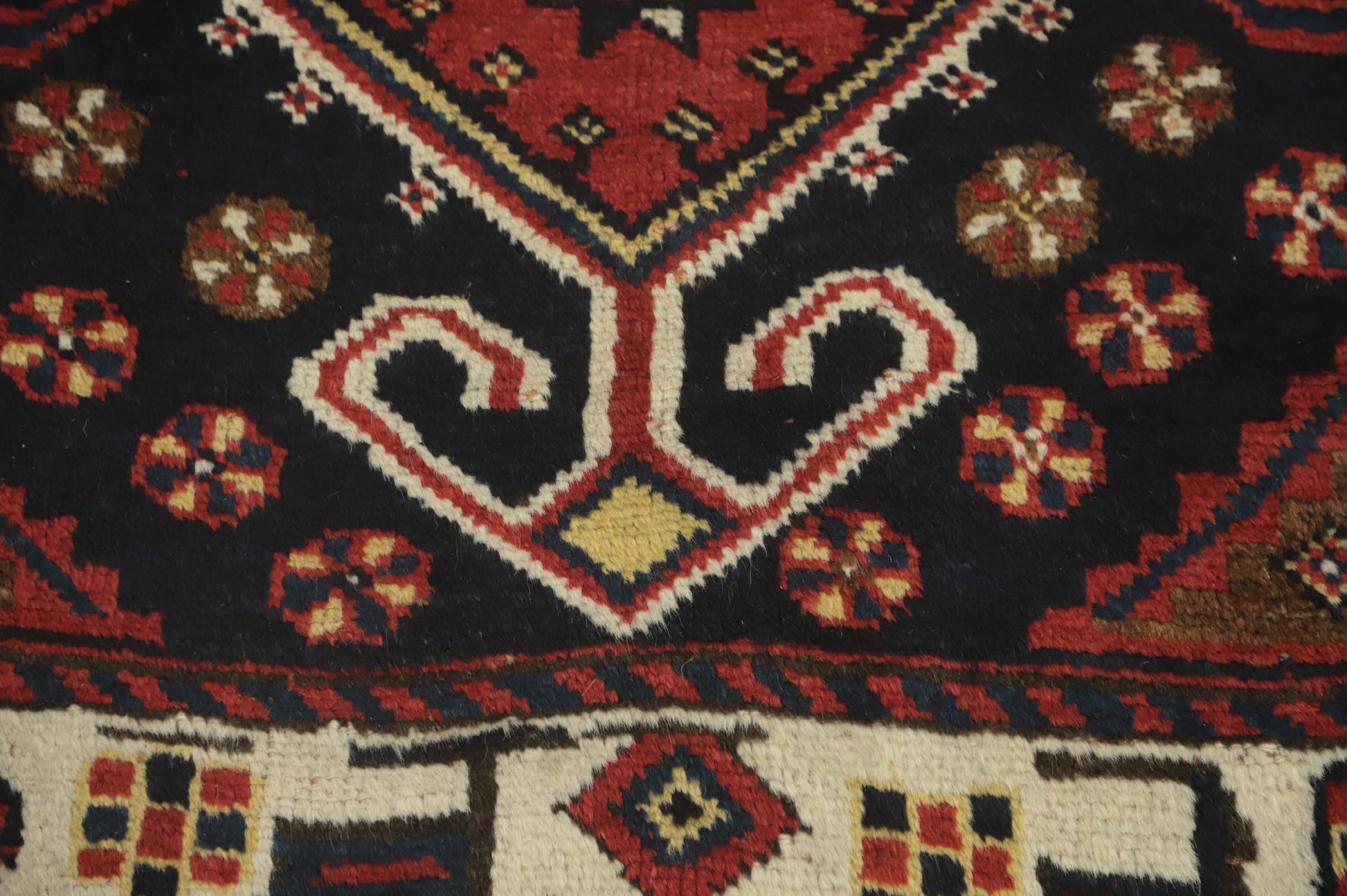 A Beautiful Genuine Persia ( Persia ) Qashqai rug is Hand Knotted by skillful weavers in Persia ( Persia ) with 100% Wool Material. This rug is in Very Good (Low Pile-Abrash) condition. dimensions are 7' 4'' X 3' 10'' in foot and 224 X 117 in centimeter. the primary color is Navy Blue & Blues.