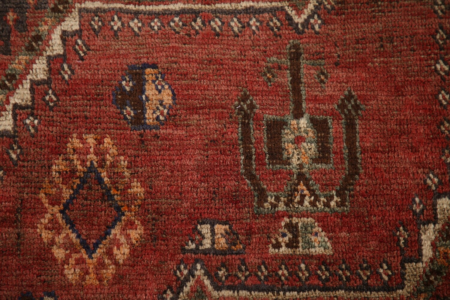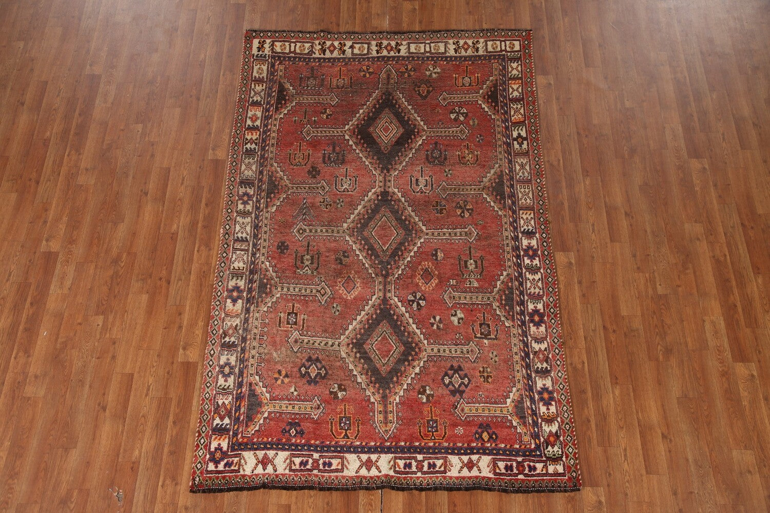 A Beautiful Genuine Persia ( Persia ) Qashqai rug is Hand Knotted by skillful weavers in Persia ( Persia ) with 100% Wool Material. This rug is in Very Good(Evenly Low Pile) condition. dimensions are 7' 5'' X 4' 10'' in foot and 226 X 147 in centimeter. the primary color is Red.