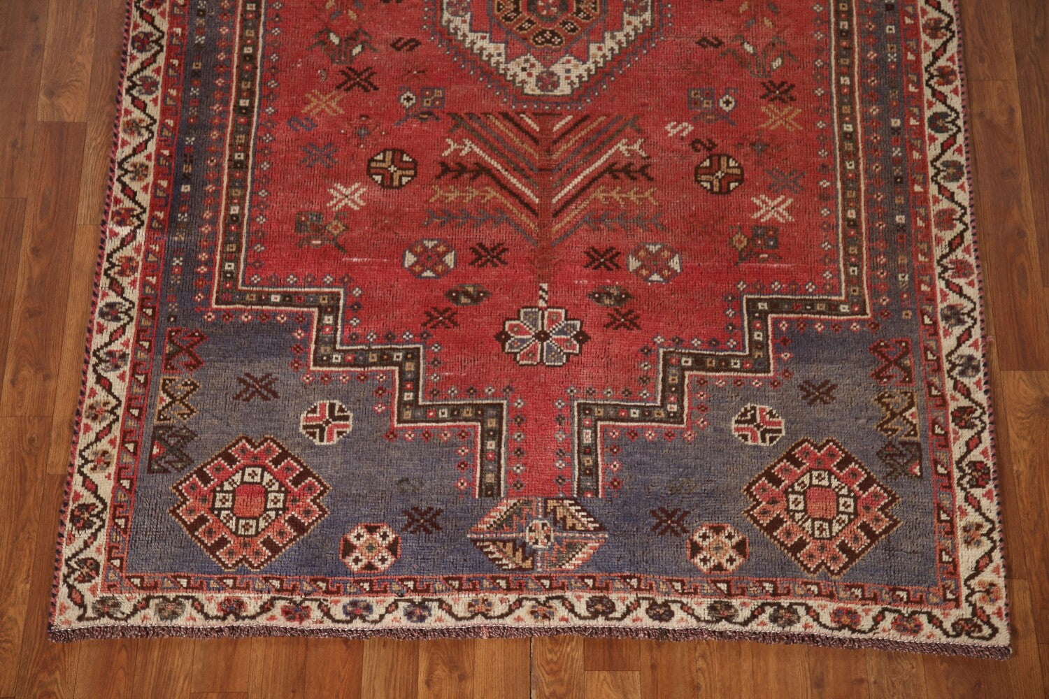 A Beautiful Genuine Persia ( Persia ) Qashqai rug is Hand Knotted by skillful weavers in Persia ( Persia ) with 100% Wool Material. This rug is in Very Good (Evenly Low Pile) condition. dimensions are 7' 5'' X 4' 9'' in foot and 226 X 145 in centimeter. the primary color is Pink.