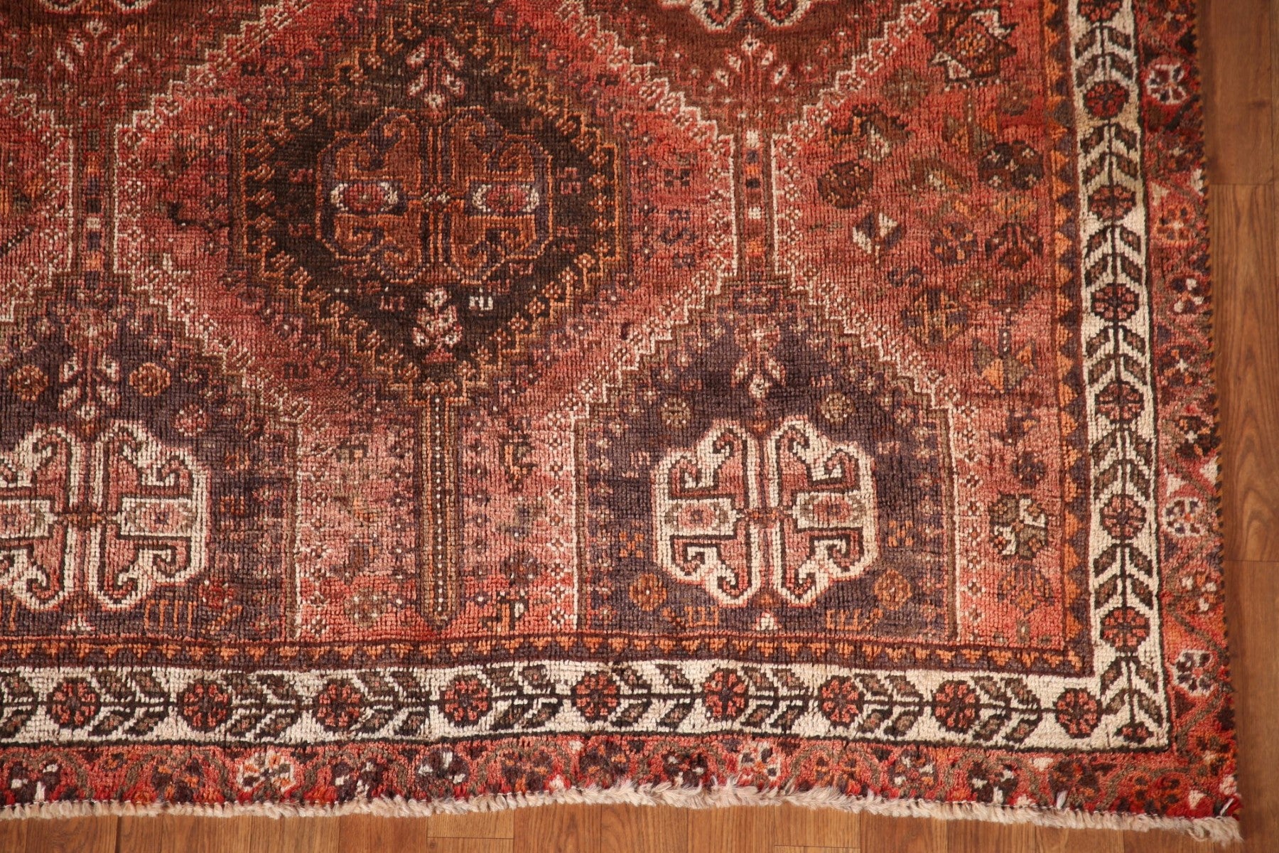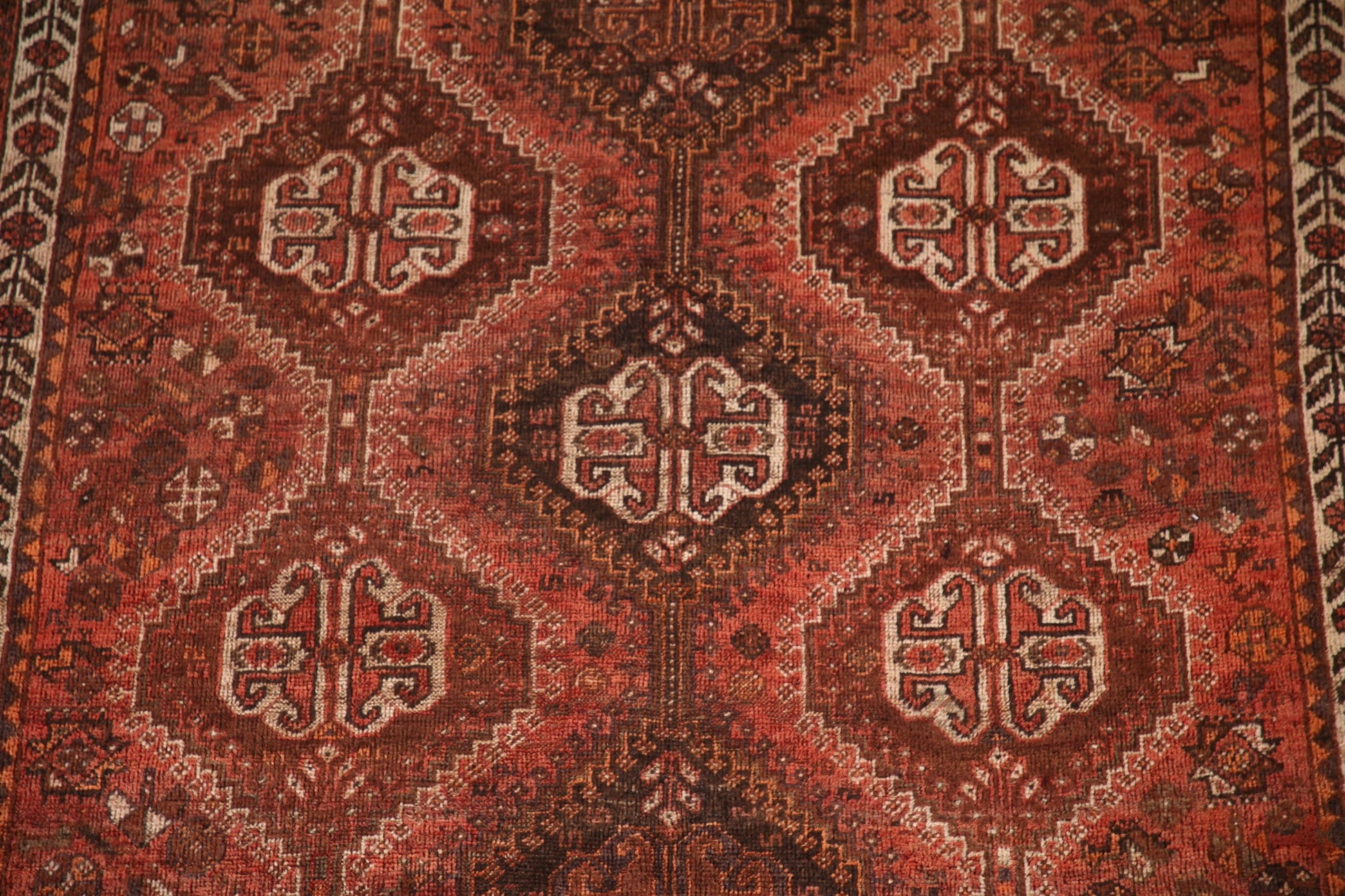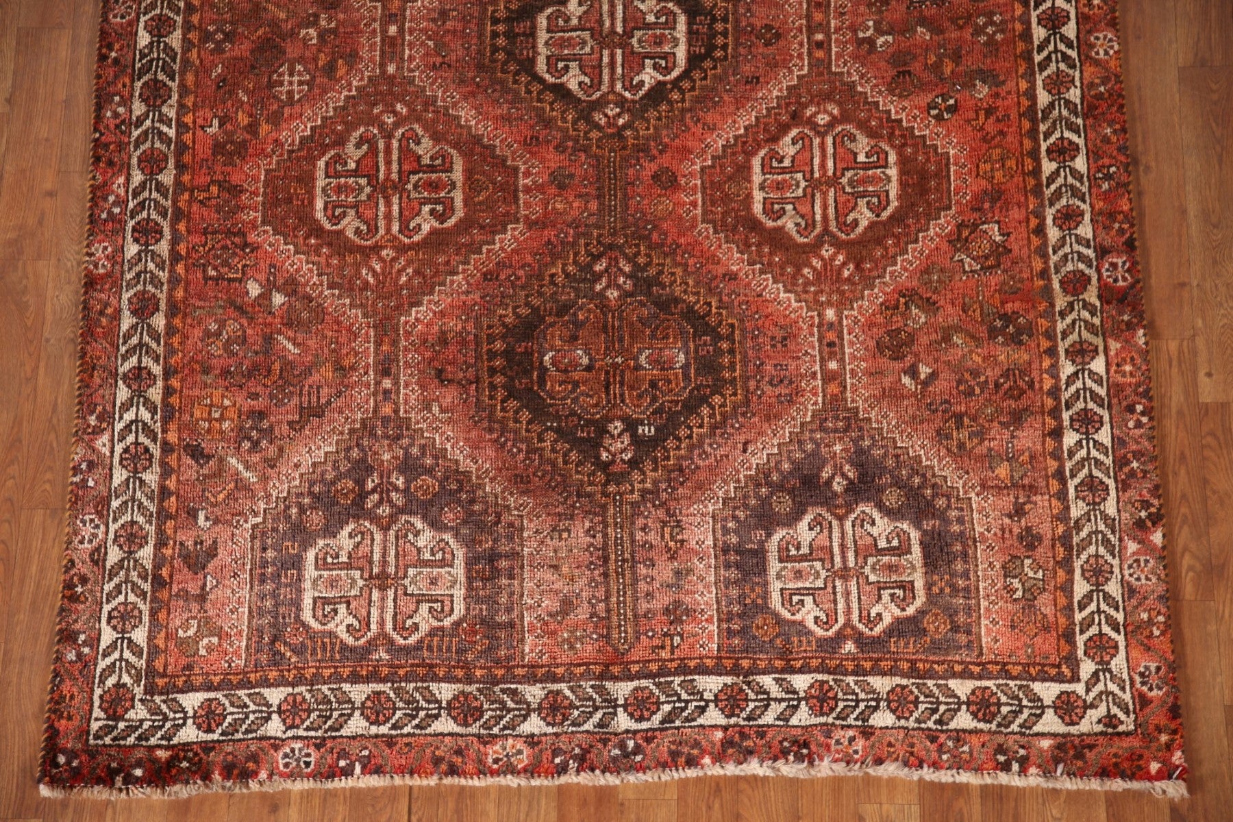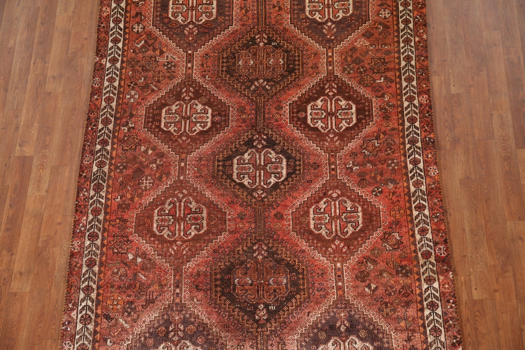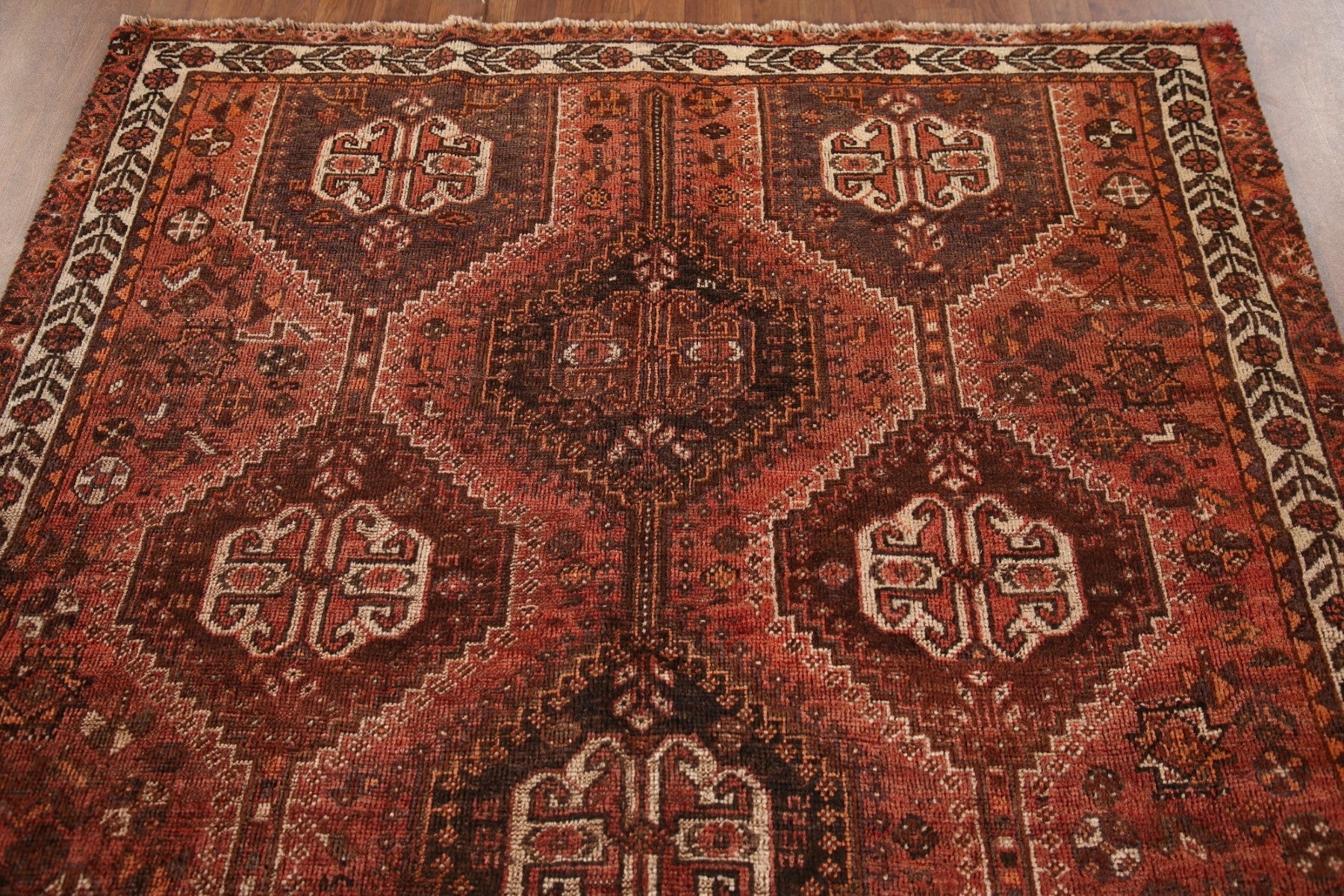 A Beautiful Genuine Persia ( Persia ) Shiraz rug is Hand Knotted by skillful weavers in Persia ( Persia ) with 100% Wool Material. This rug is in Very Good(Evenly Low Pile) condition. dimensions are 7' 9'' X 5' 3'' in foot and 236 X 160 in centimeter. the primary color is Red.