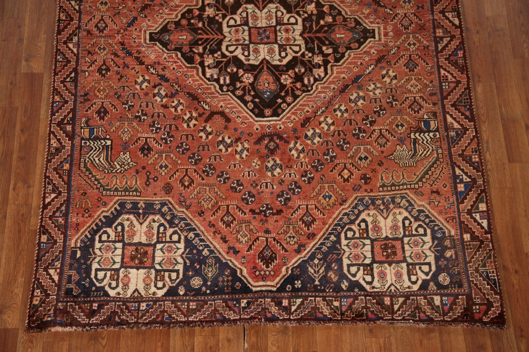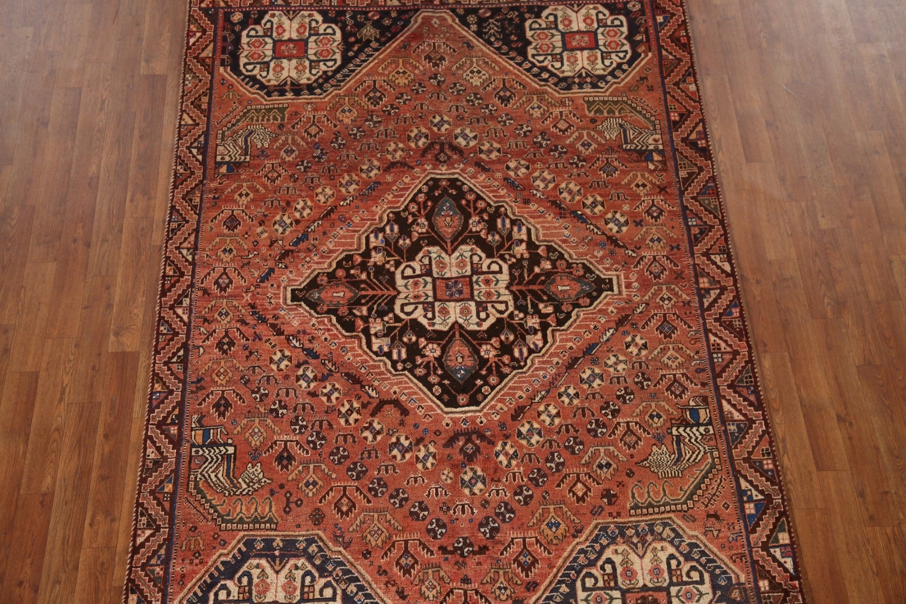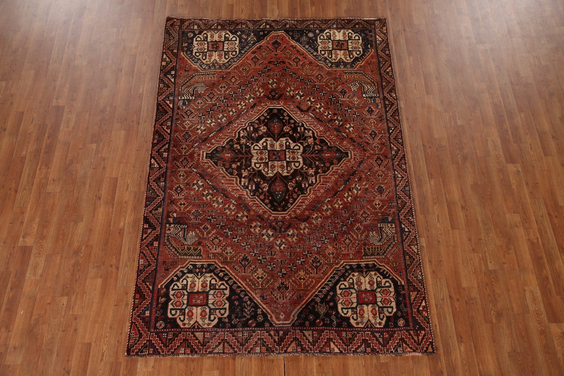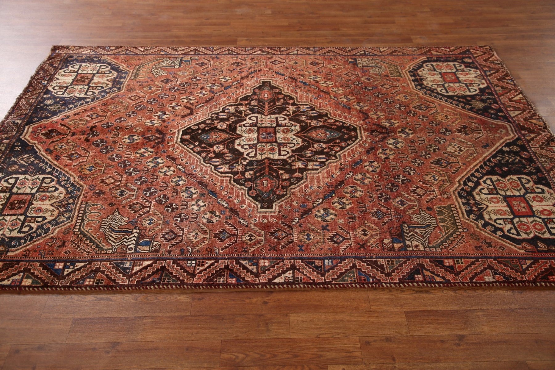 A Beautiful Genuine Persia ( Persia ) Shiraz rug is Hand Knotted by skillful weavers in Persia ( Persia ) with 100% Wool Material. This rug is in Very Good(Evenly Low Pile) condition. dimensions are 7' 11'' X 5' 4'' in foot and 241 X 163 in centimeter. the primary color is Oranges & Rust.