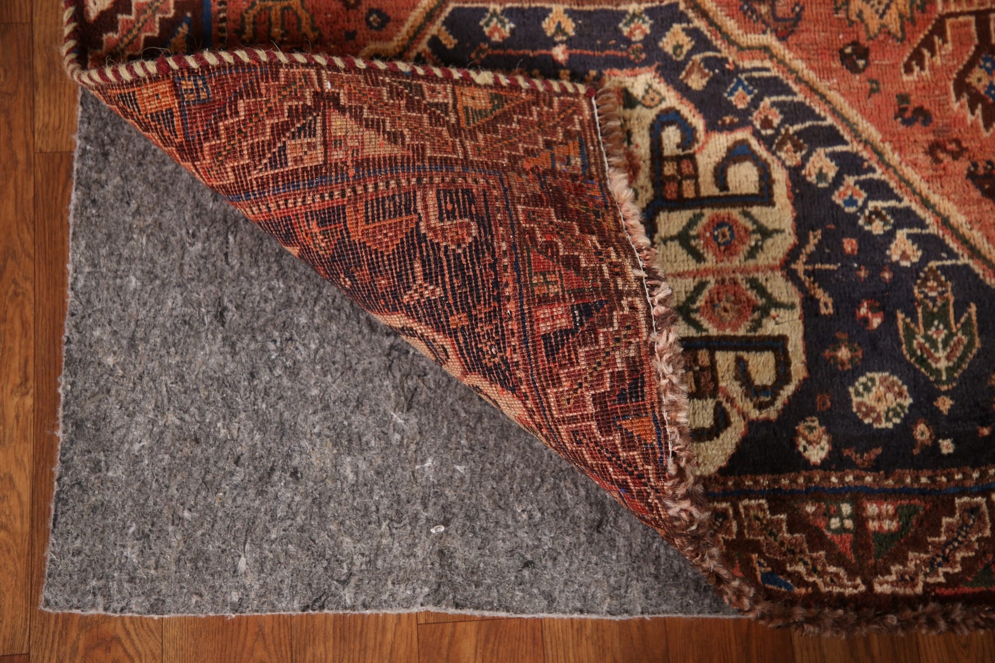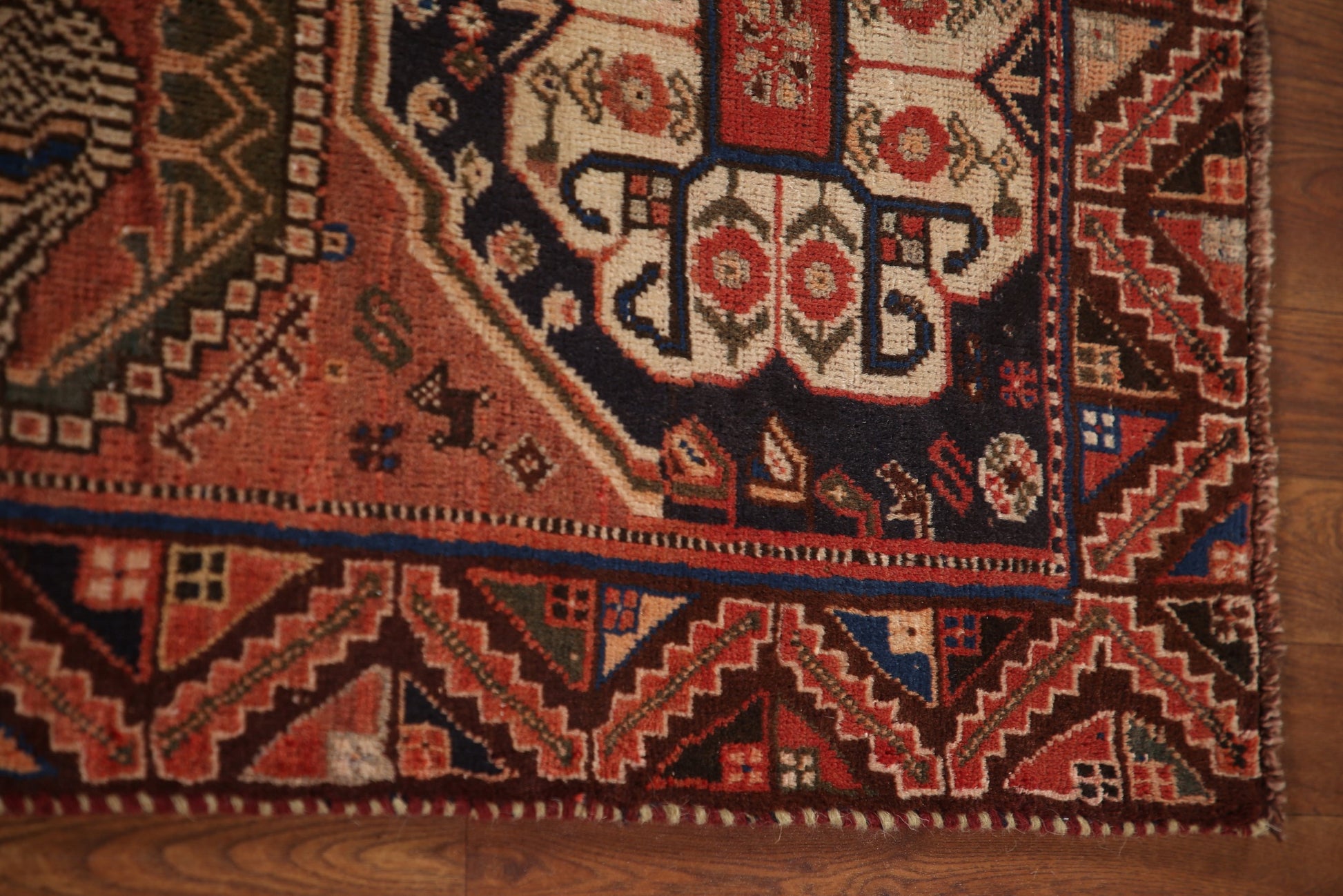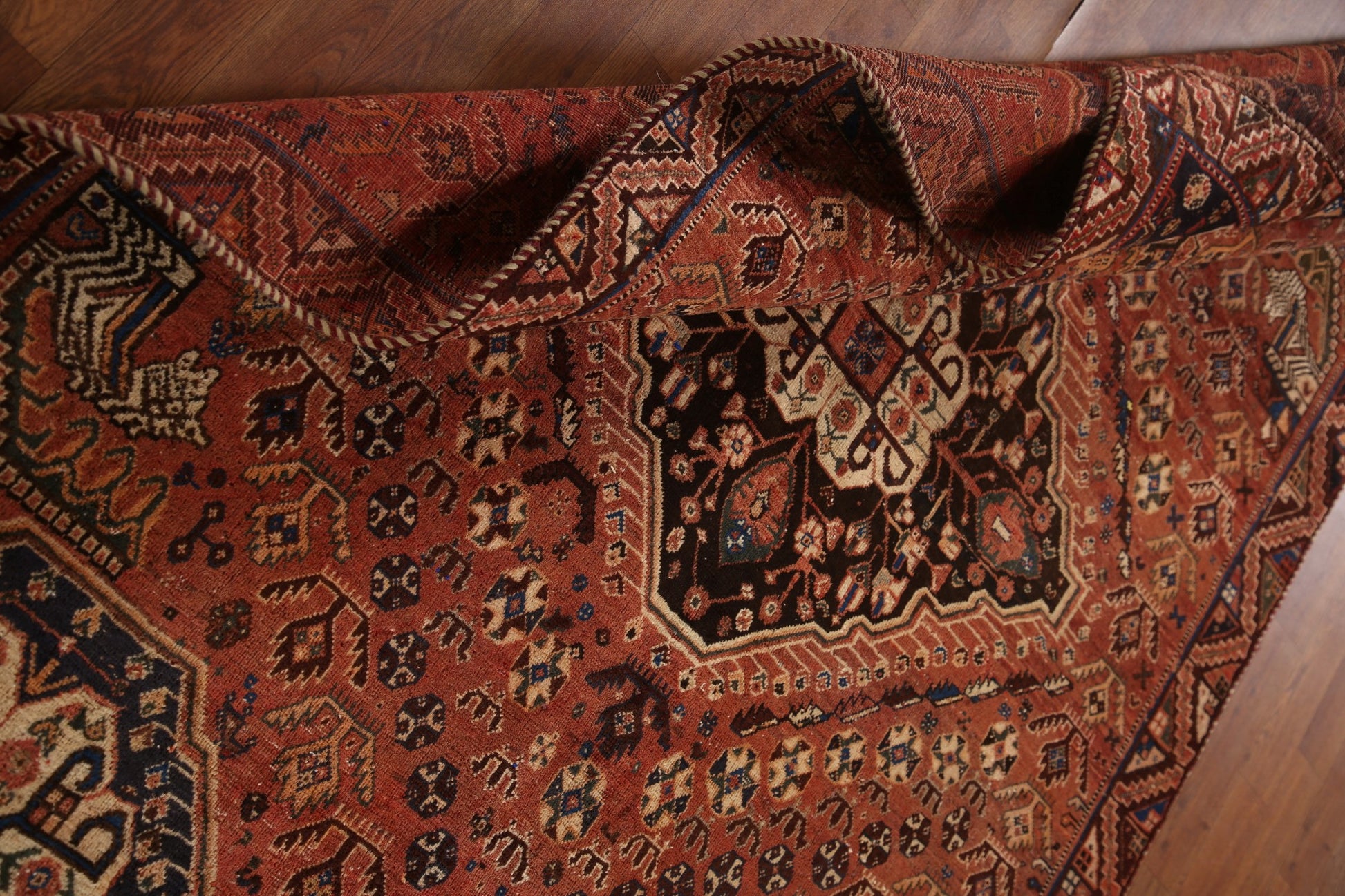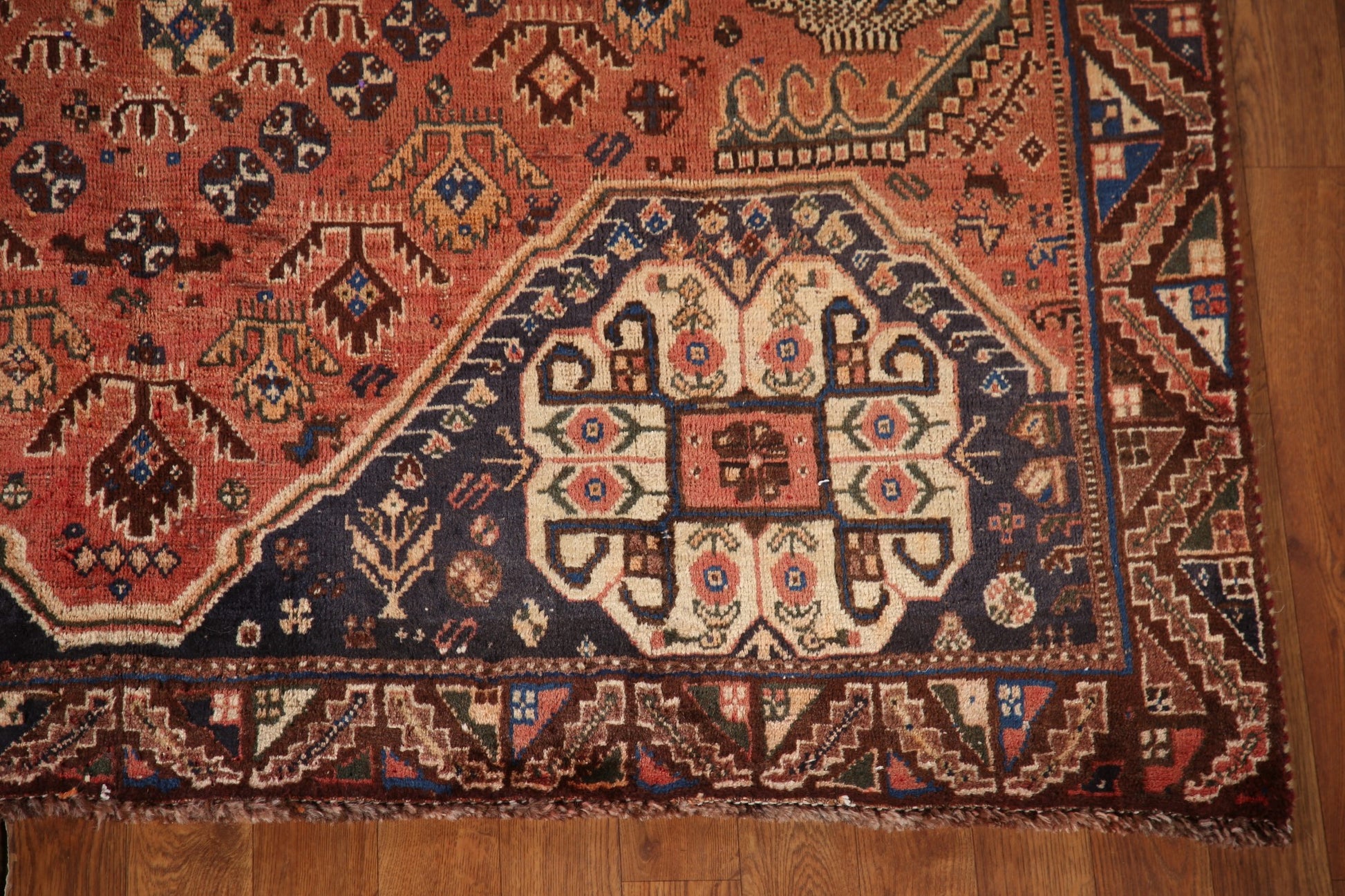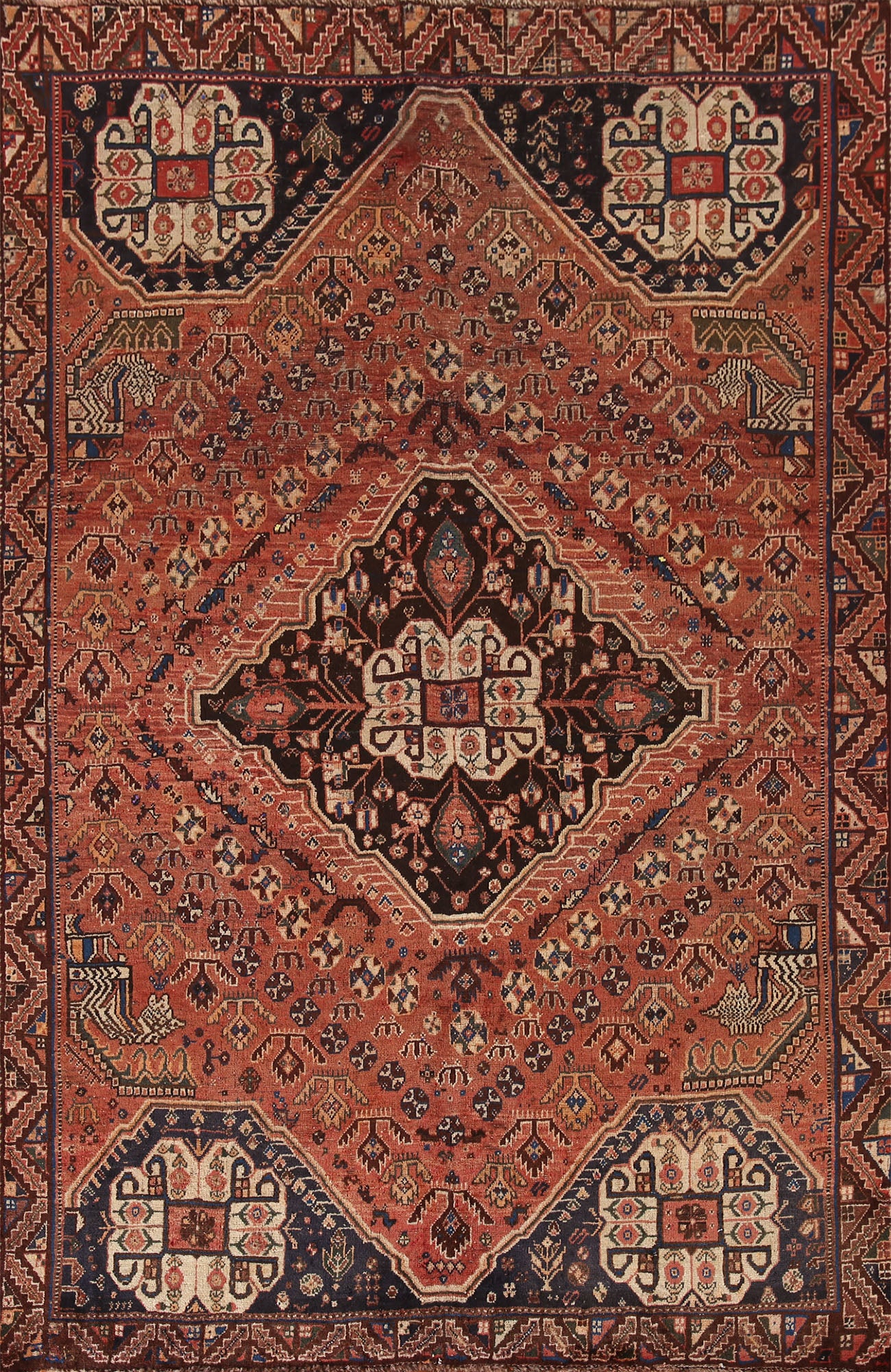 A Beautiful Genuine Persia ( Persia ) Shiraz rug is Hand Knotted by skillful weavers in Persia ( Persia ) with 100% Wool Material. This rug is in Very Good(Evenly Low Pile) condition. dimensions are 7' 11'' X 5' 4'' in foot and 241 X 163 in centimeter. the primary color is Oranges & Rust.
