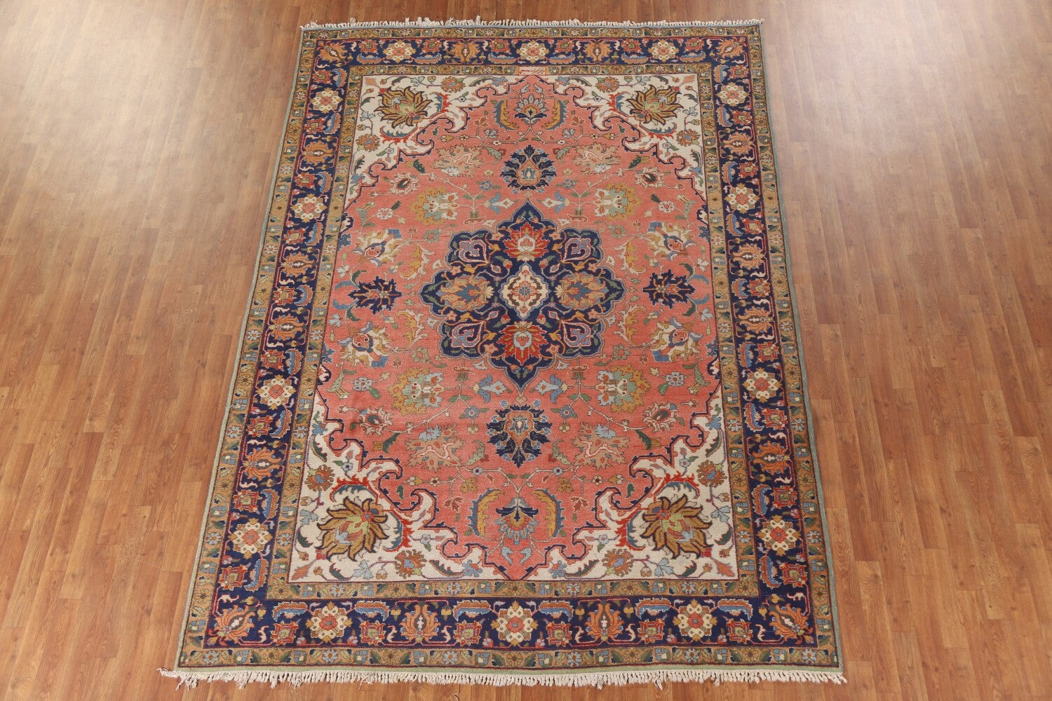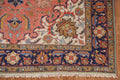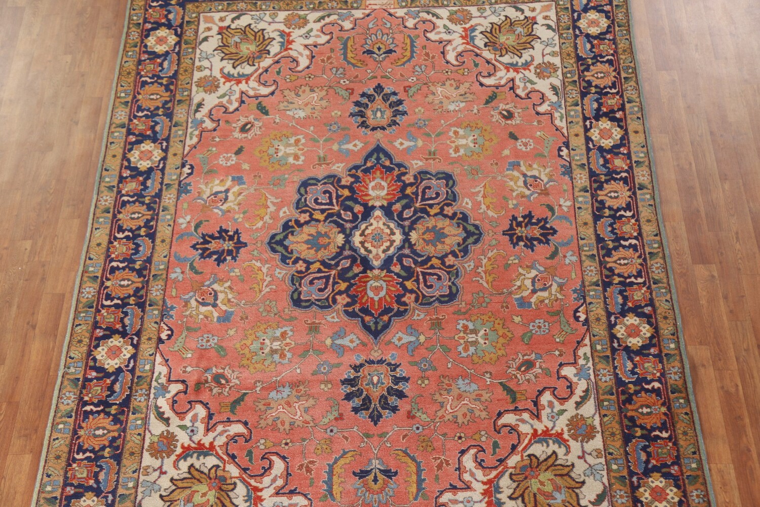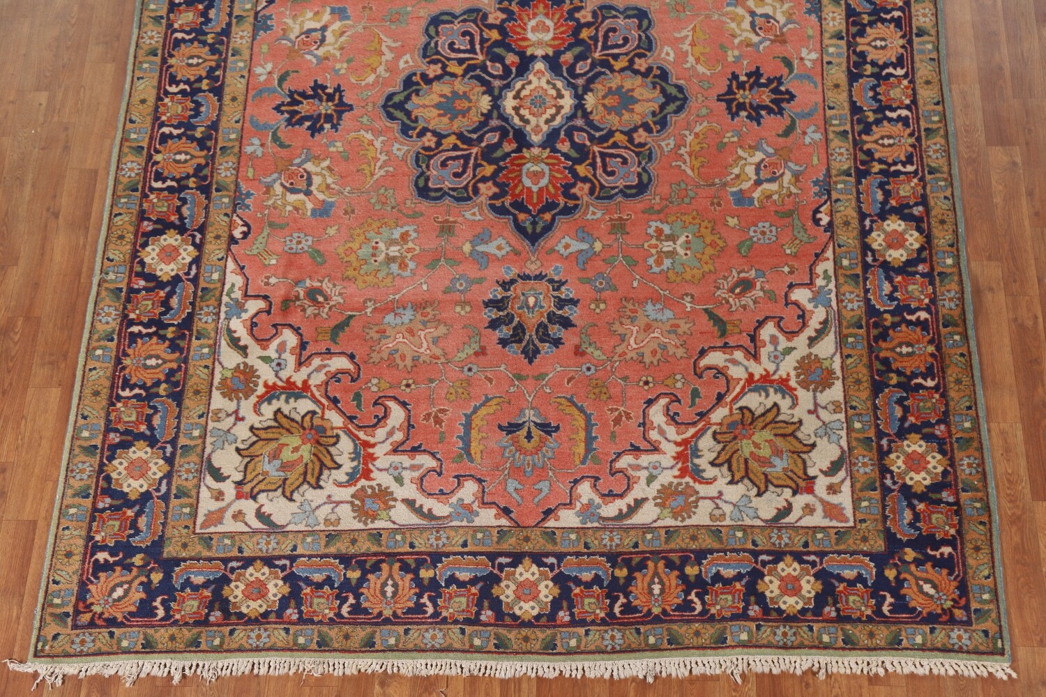 A Beautiful Genuine Persia ( Persia ) Tabriz rug is Hand Knotted by skillful weavers in Persia ( Persia ) with 100% Wool Material. This rug is in Very Good (Low Pile) condition. dimensions are 10' 7'' X 7' 5'' in foot and 323 X 226 in centimeter. the primary color is Coral.