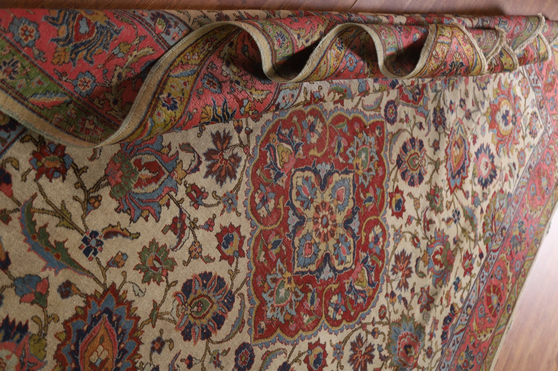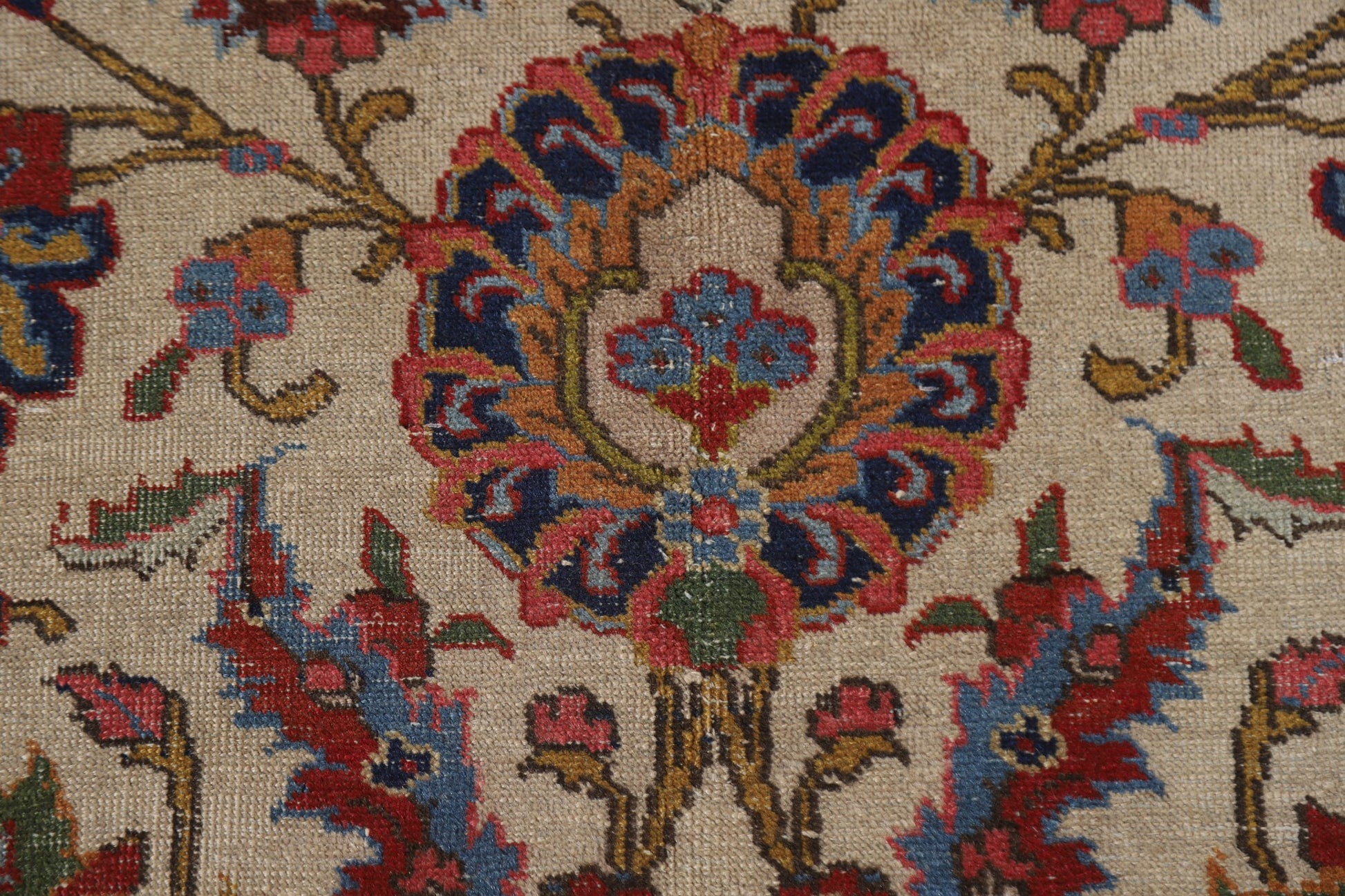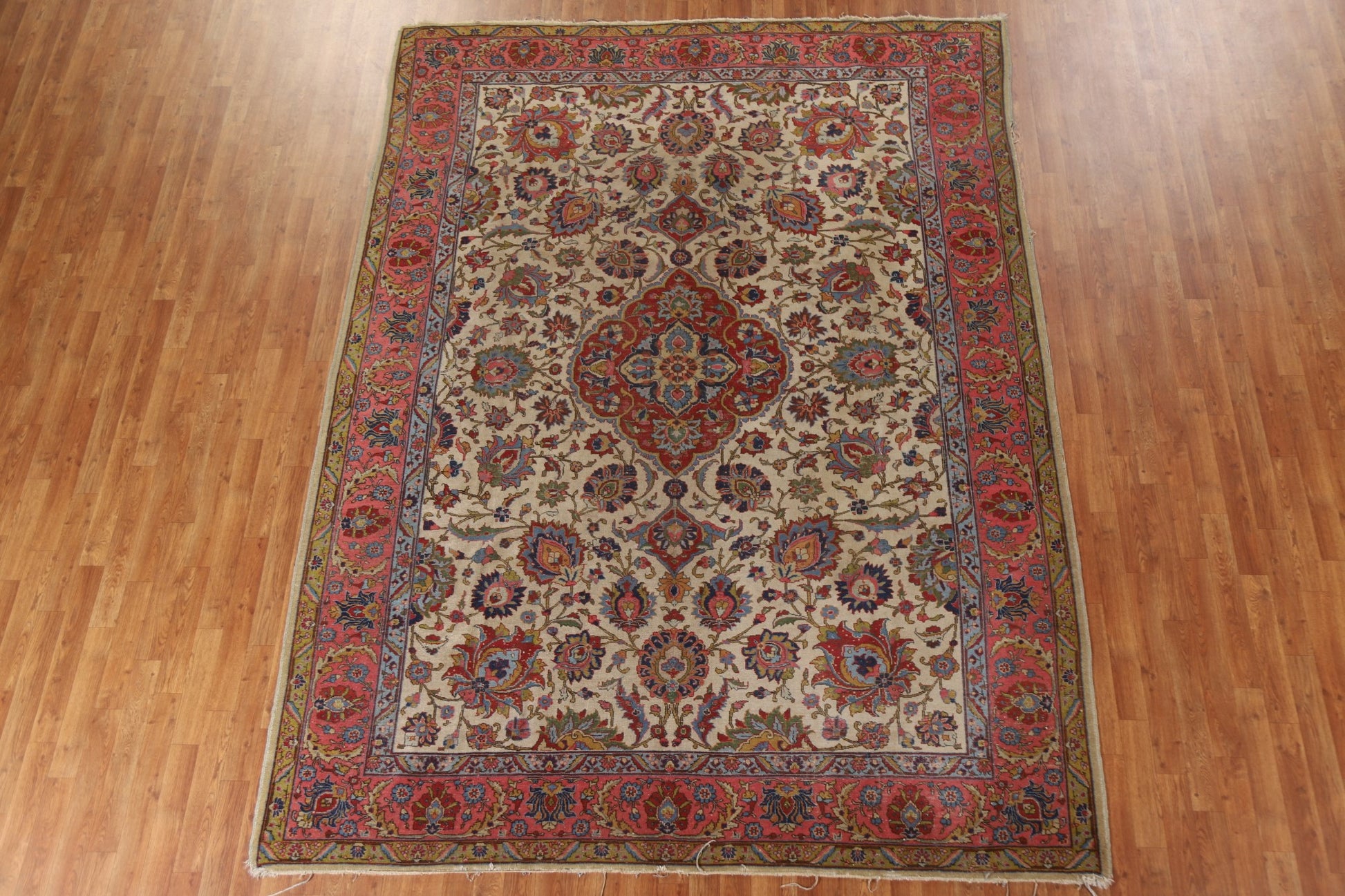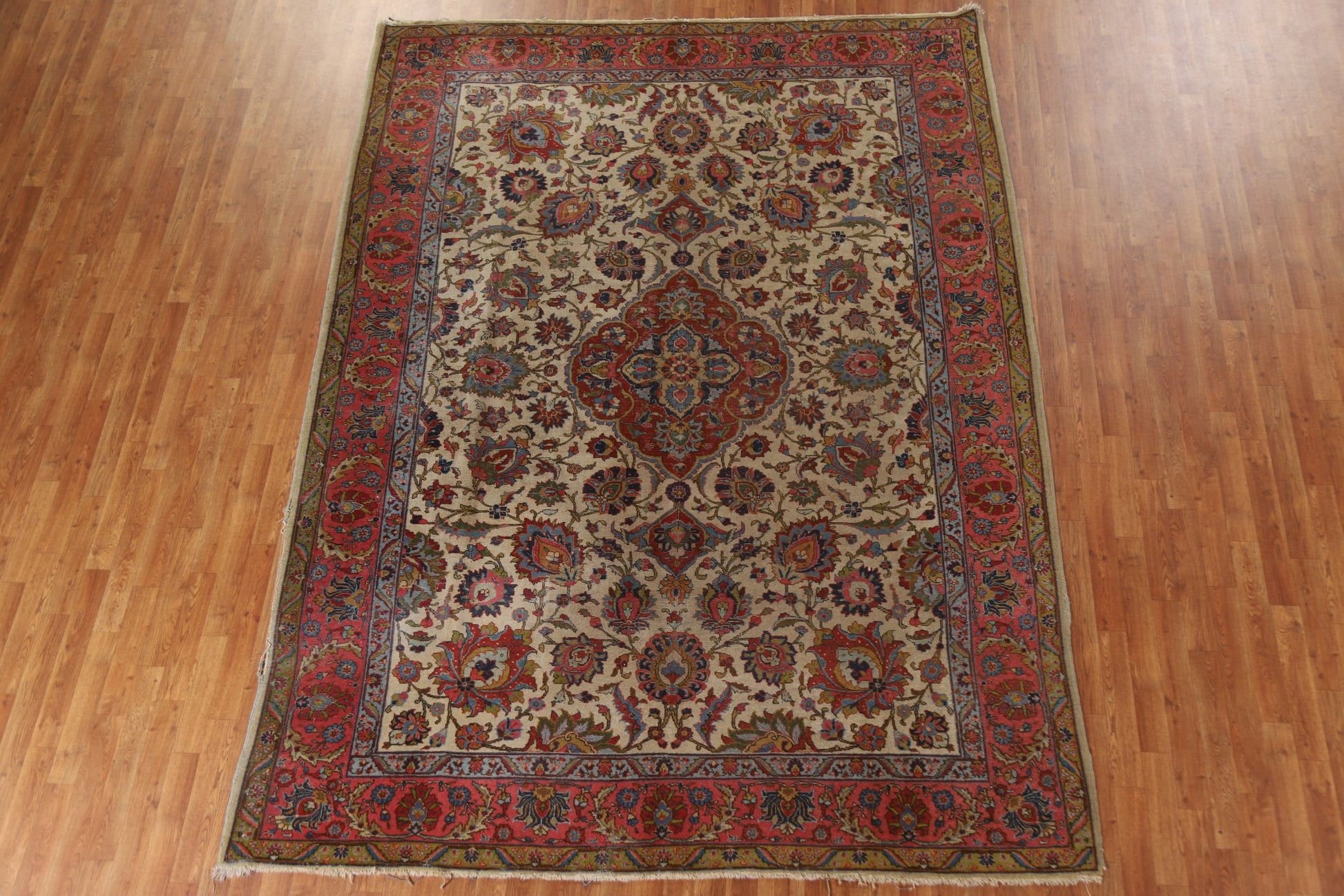 A Beautiful Genuine Persia ( Persia ) Tabriz rug is Hand Knotted by skillful weavers in Persia ( Persia ) with 100% Wool Material. This rug is in Very Good (Evenly Low Pile) condition. dimensions are 10' 6'' X 7' 10'' in foot and 320 X 239 in centimeter. the primary color is Beige & Ivories.
