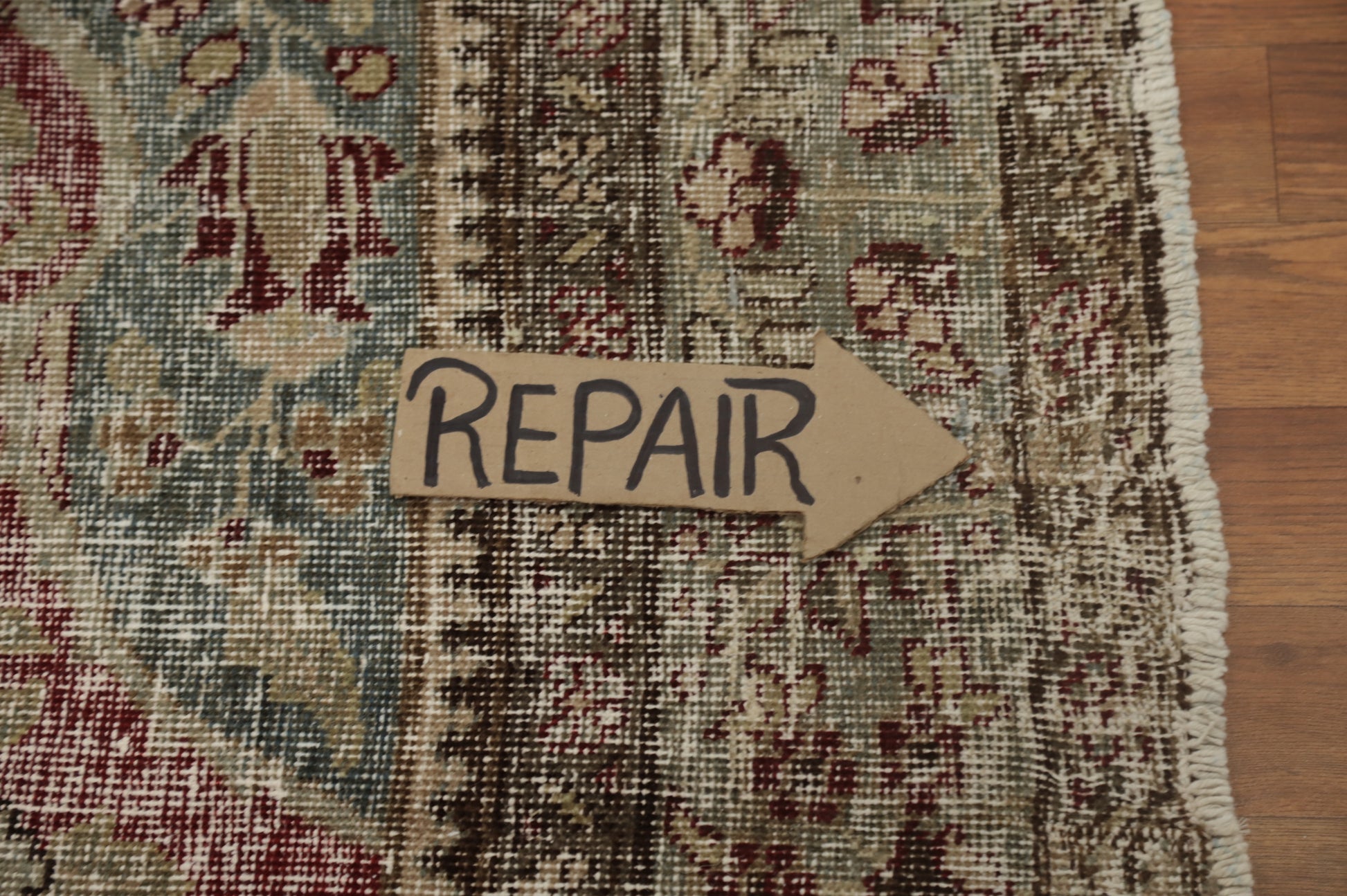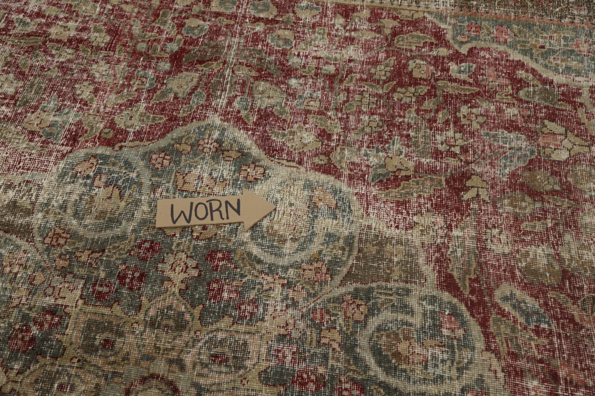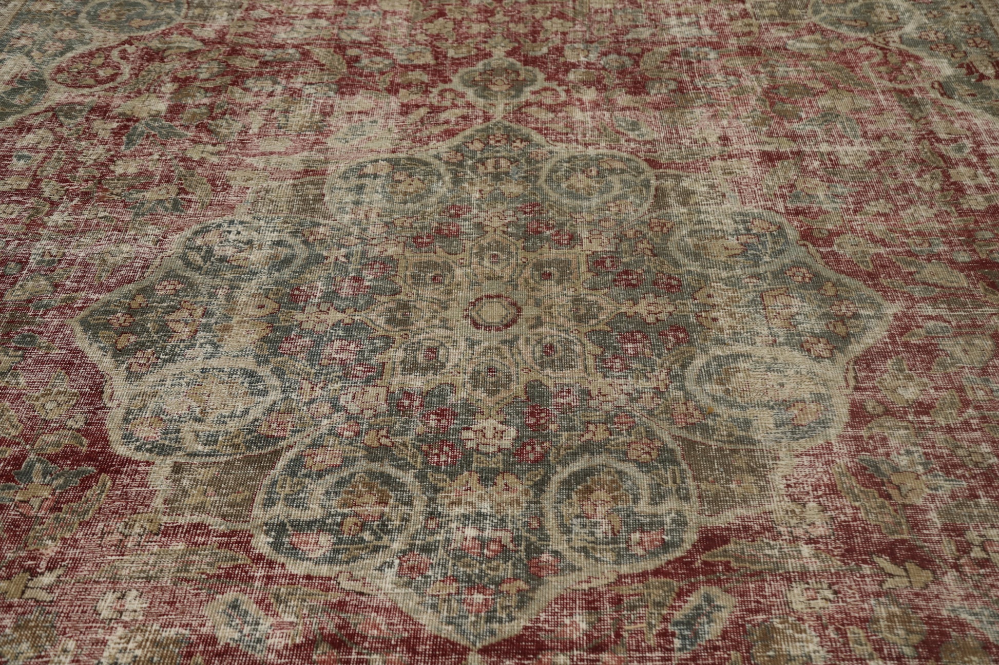A Beautiful Genuine Persia ( Persia ) Tabriz rug is Hand Knotted by skillful weavers in Persia ( Persia ) with 100% Wool Material. This rug is in Very Good (Low Pile-Worn-Repairs) condition. dimensions are 11' 10'' X 8' 8'' in foot and 361 X 264 in centimeter. the primary color is Red.