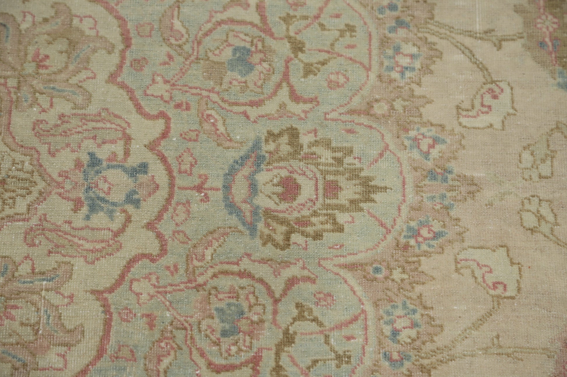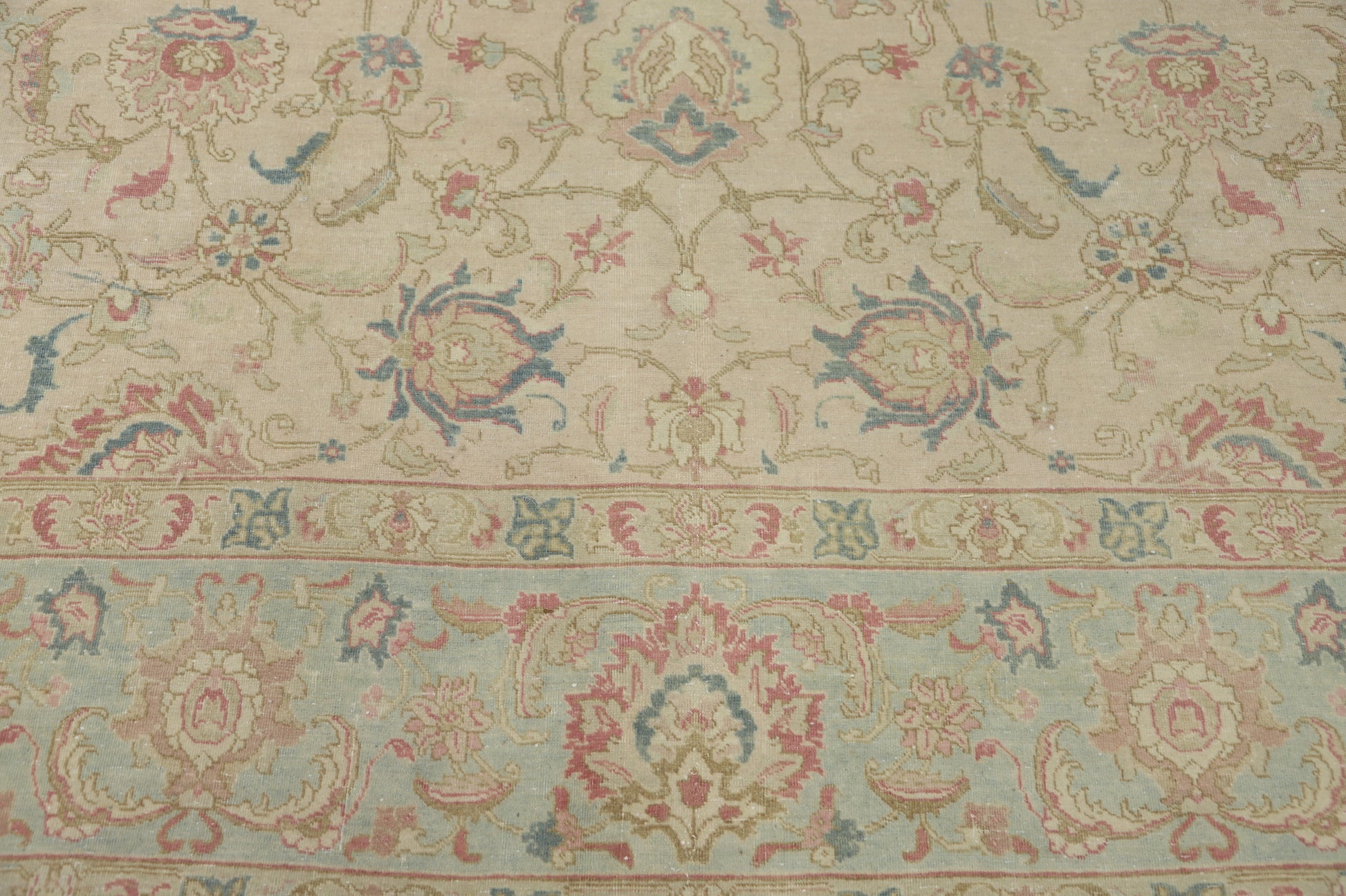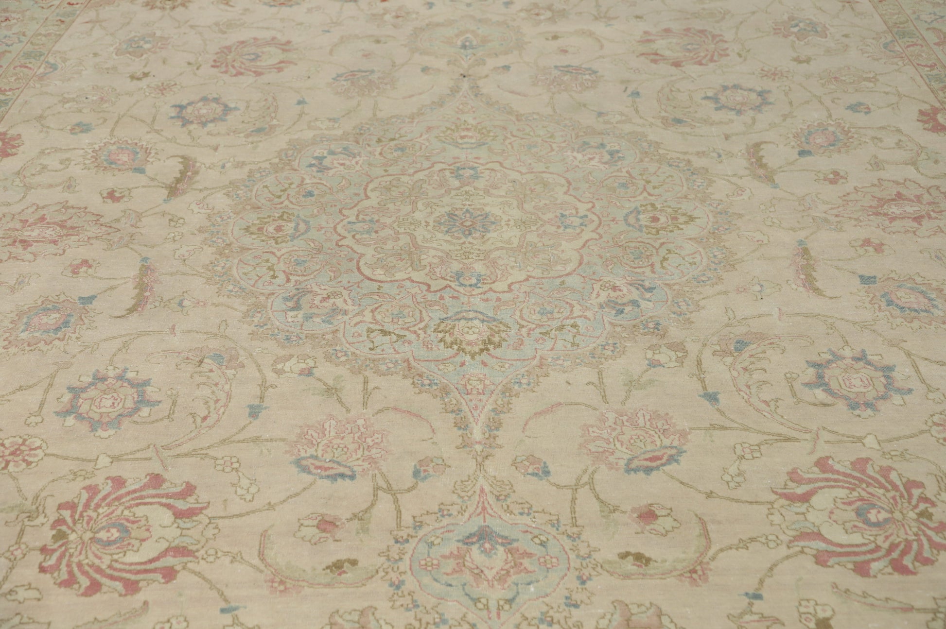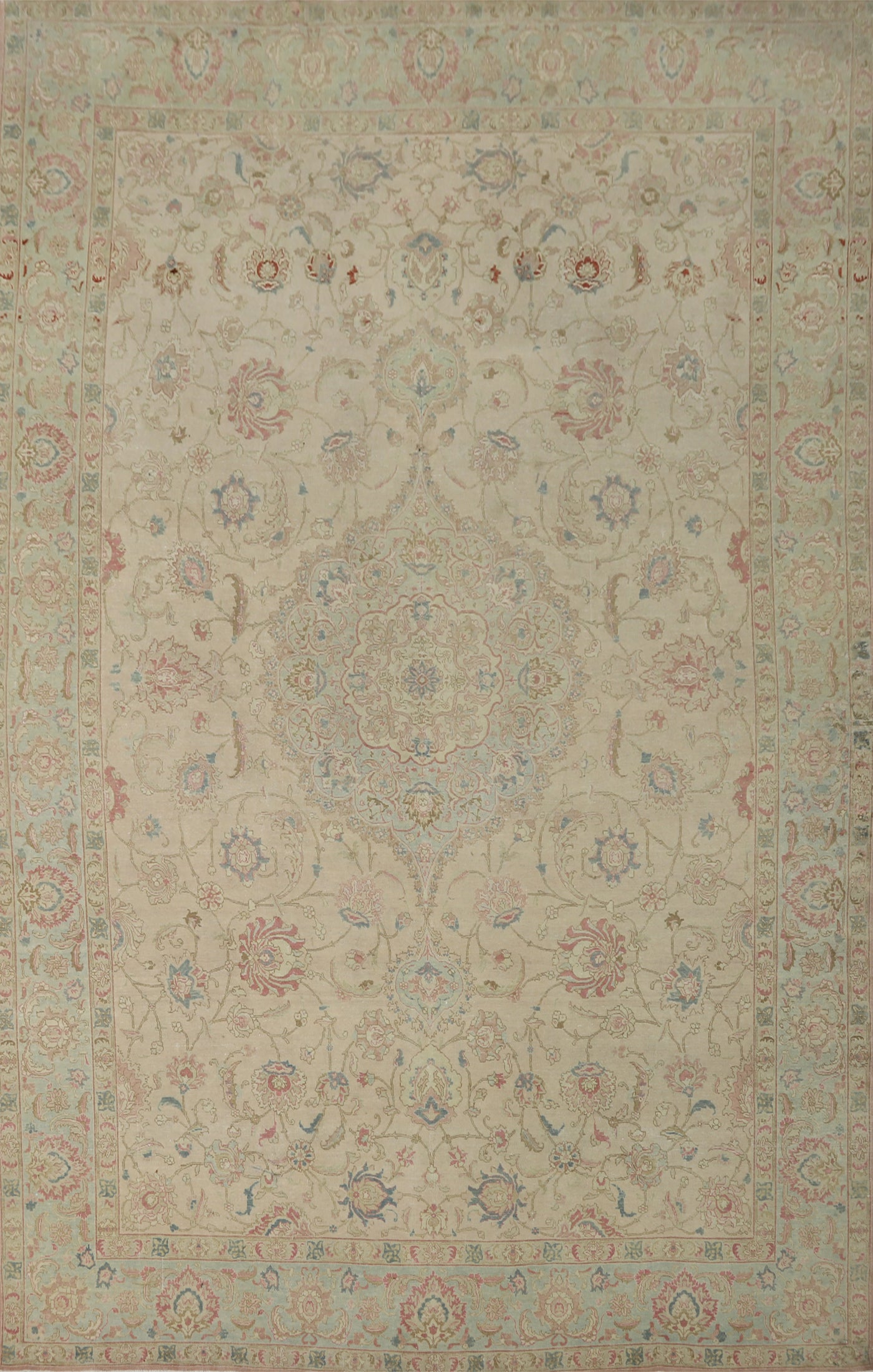 A Beautiful Genuine Persia ( Persia ) Tabriz rug is Hand Knotted by skillful weavers in Persia ( Persia ) with 100% Wool Material. This rug is in Very Good (Evenly Low Pile) condition. dimensions are 12' 10'' X 9' 4'' in foot and 391 X 284 in centimeter. the primary color is Beige & Ivories.