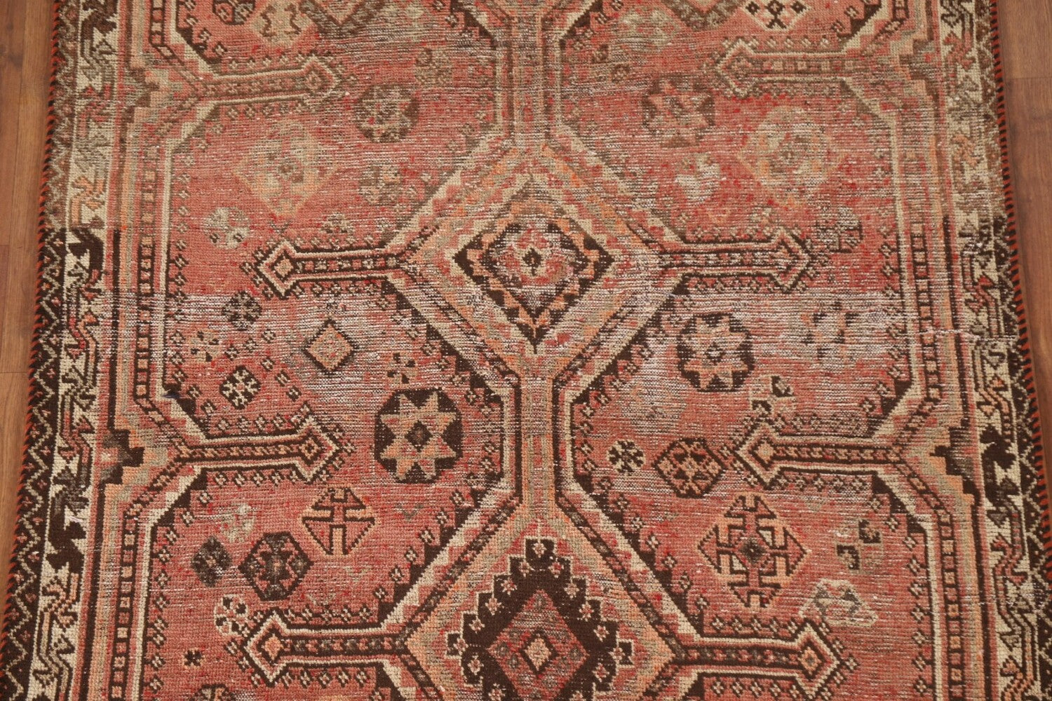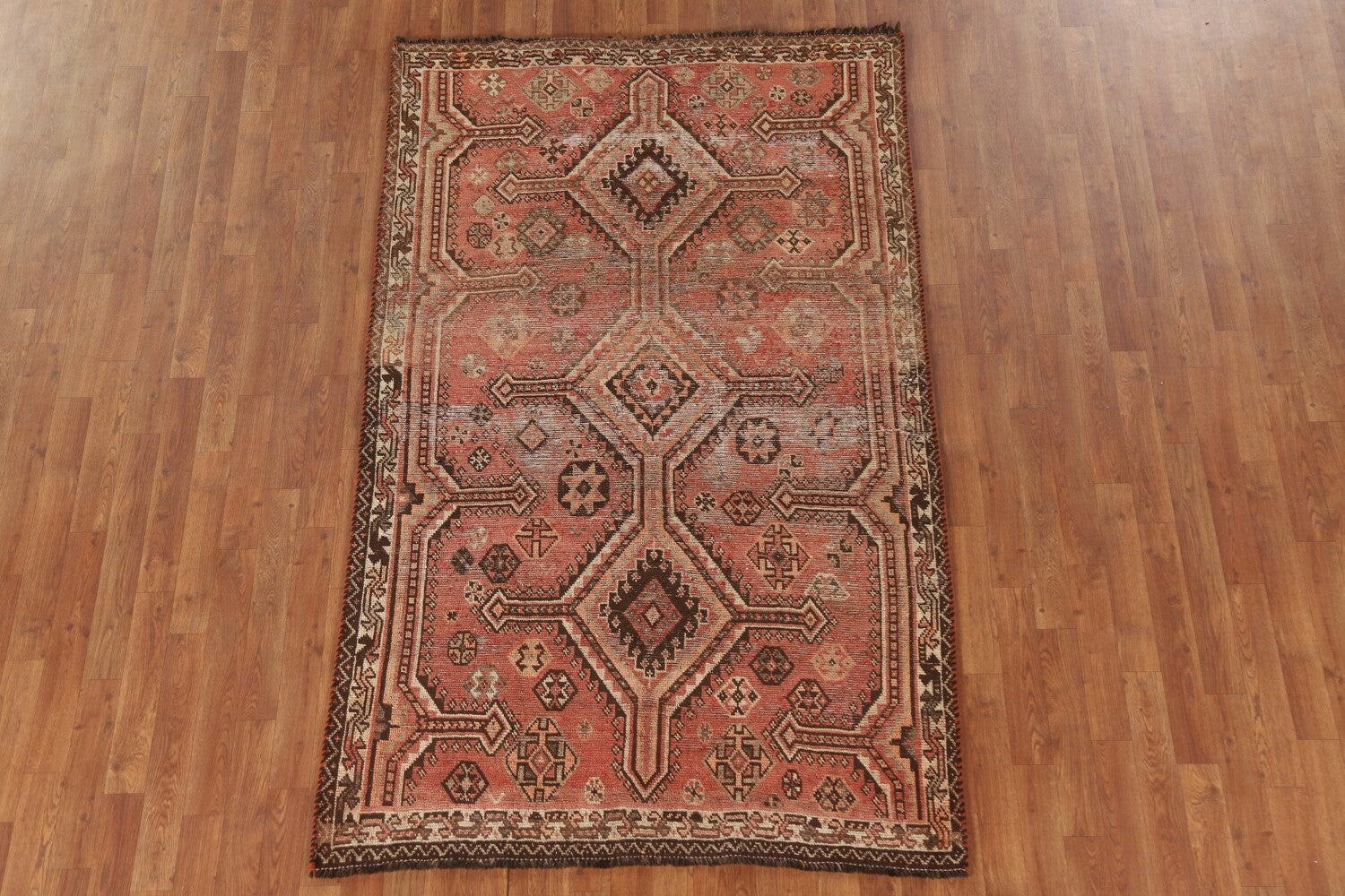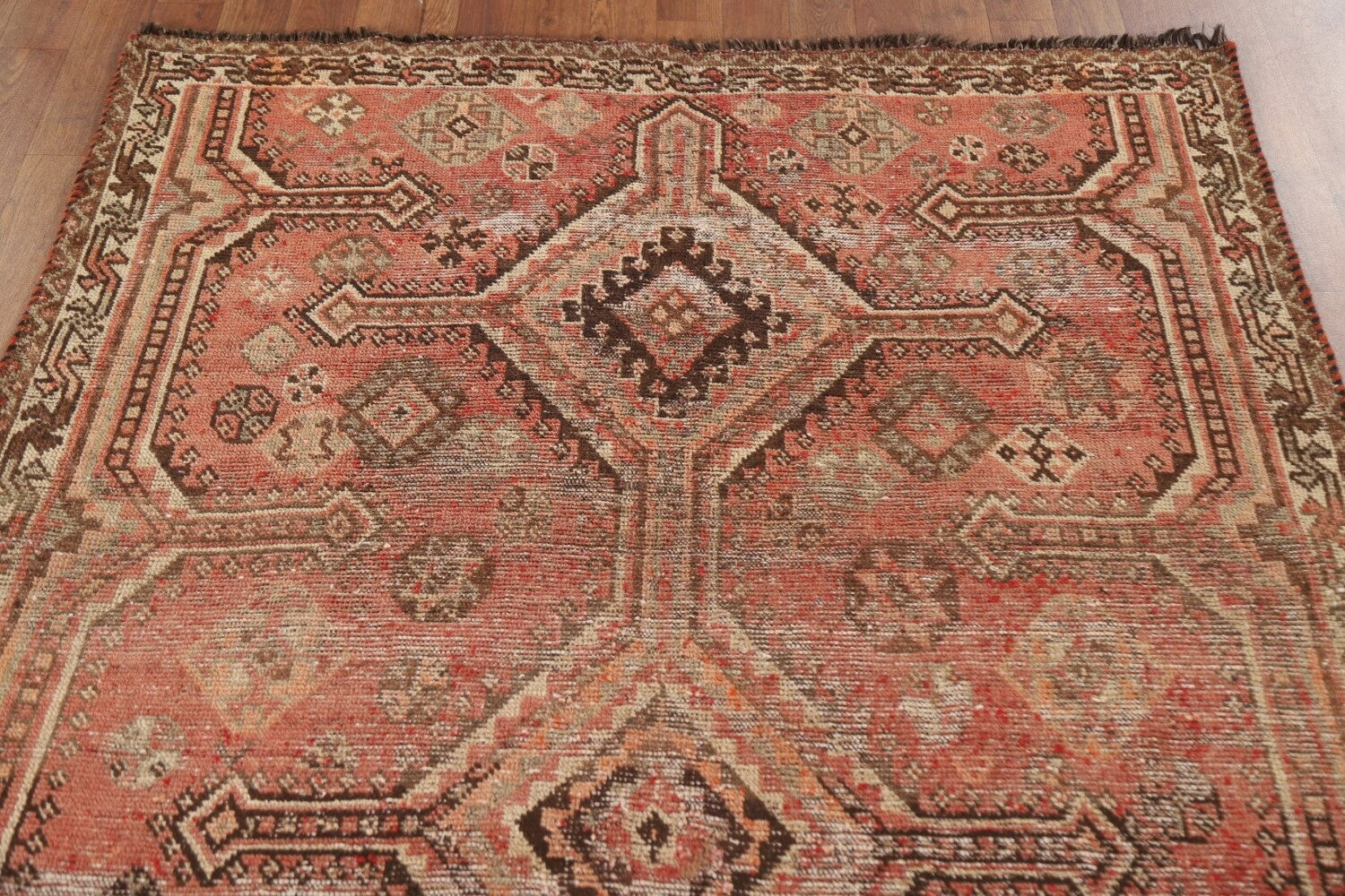 A Beautiful Genuine Persia ( Persia ) Qashqai rug is Hand Knotted by skillful weavers in Persia ( Persia ) with 100% Wool Material. This rug is in Very Good(Evenly Low Pile) condition. dimensions are 7' 1'' X 4' 5'' in foot and 216 X 135 in centimeter. the primary color is Coral.