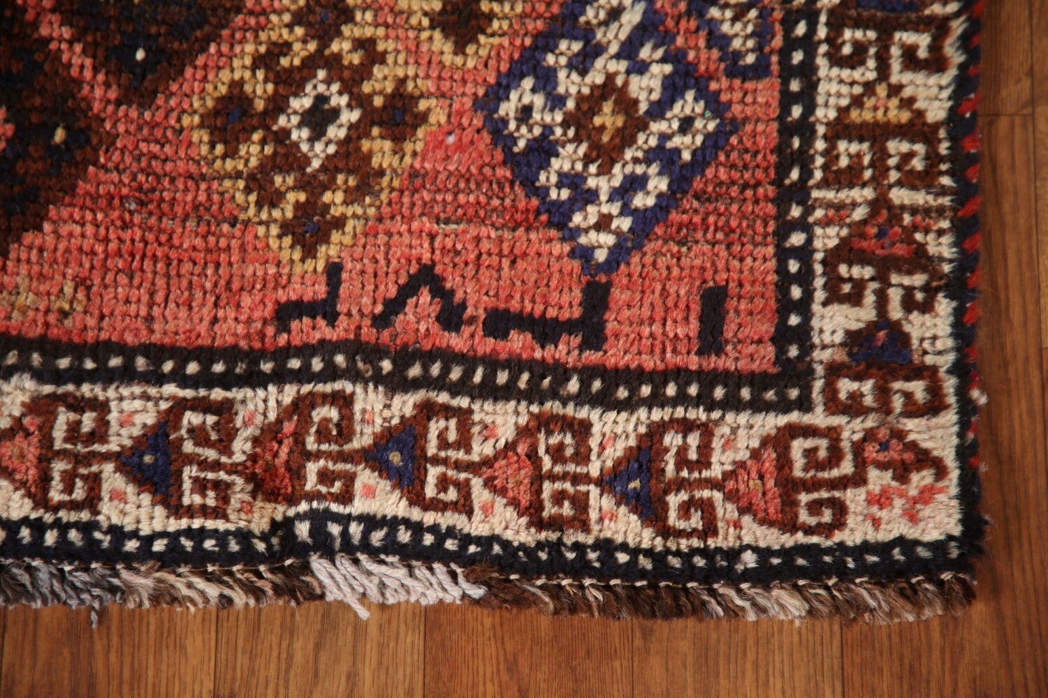 A Beautiful Genuine Persia ( Persia ) Qashqai rug is Hand Knotted by skillful weavers in Persia ( Persia ) with 100% Wool Material. This rug is in Good (Evenly Low Pile) condition. dimensions are 7' 4'' X 3' 3'' in foot and 224 X 99 in centimeter. the primary color is Coral.