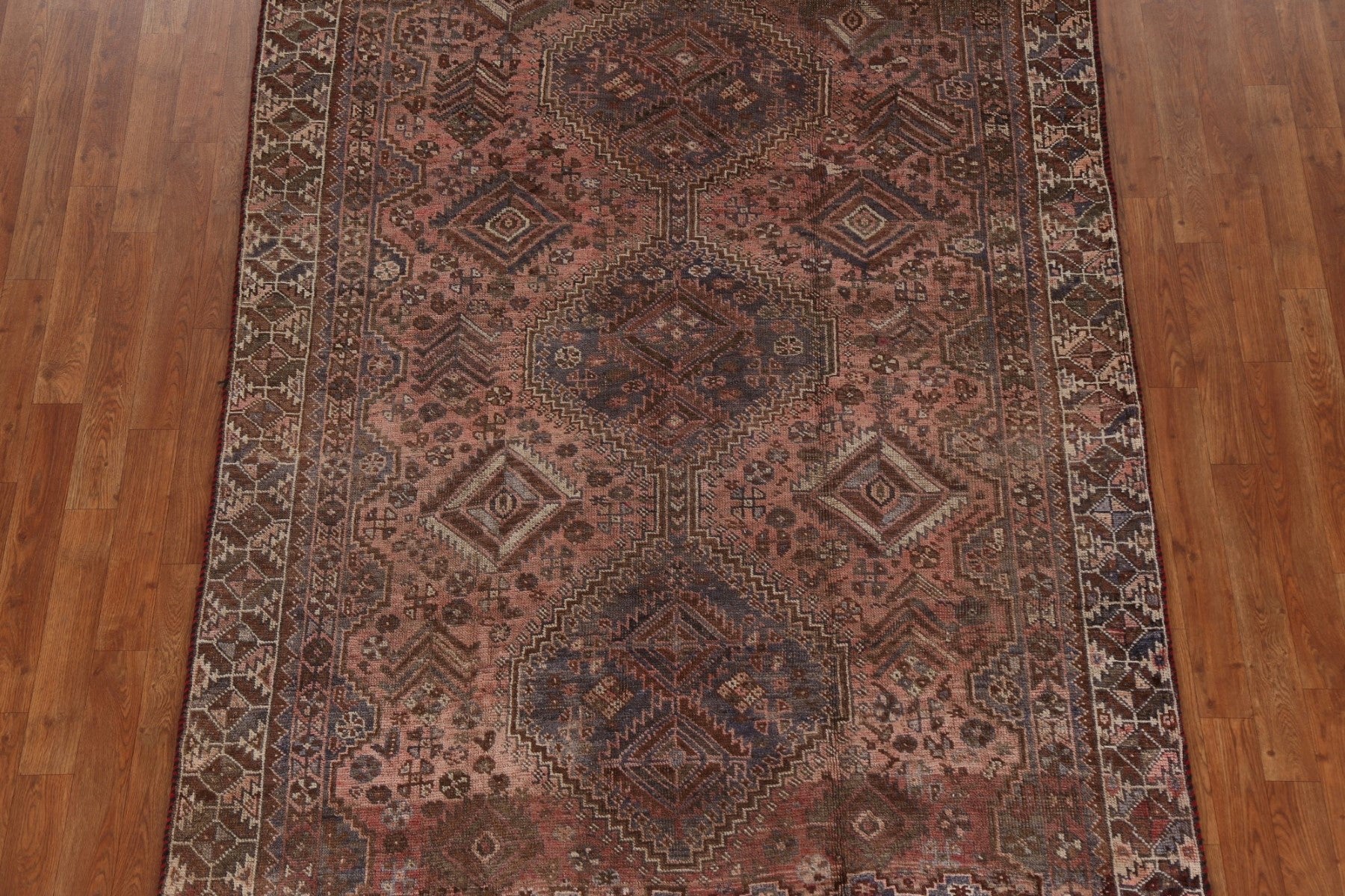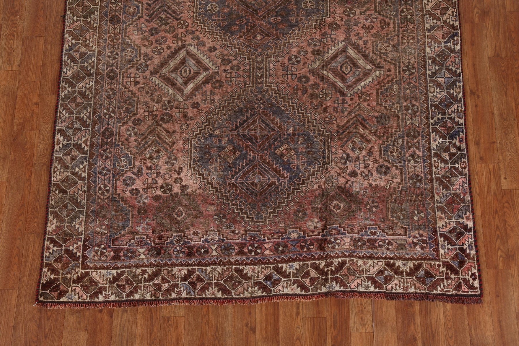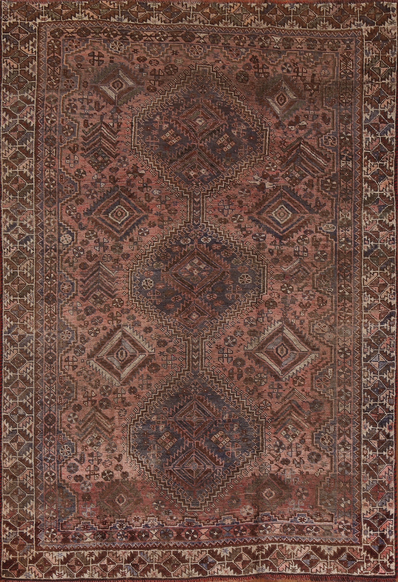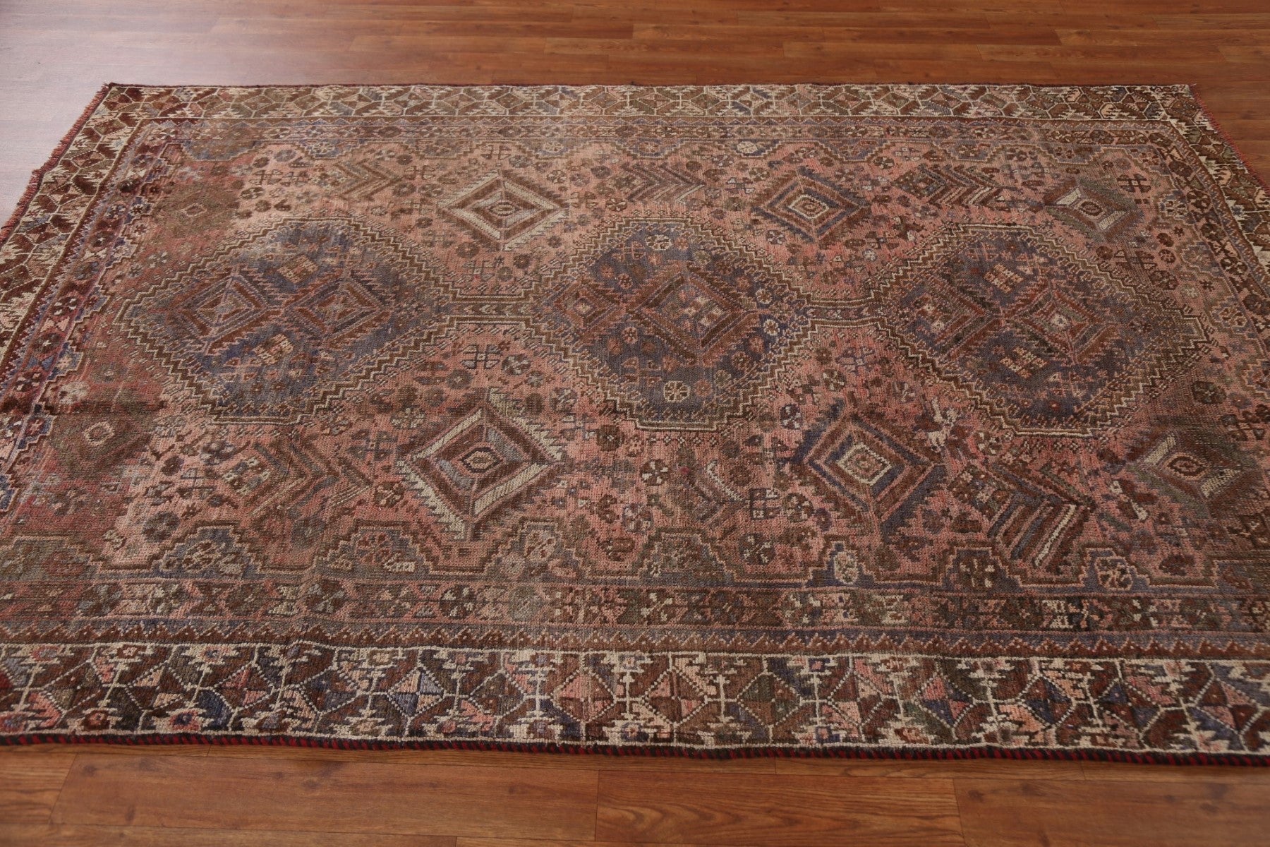 A Beautiful Genuine Persia ( Persia ) Shiraz rug is Hand Knotted by skillful weavers in Persia ( Persia ) with 100% Wool Material. This rug is in Very Good (Evenly Low Pile) condition. dimensions are 7' 8'' X 5' 3'' in foot and 234 X 160 in centimeter. the primary color is Pink.