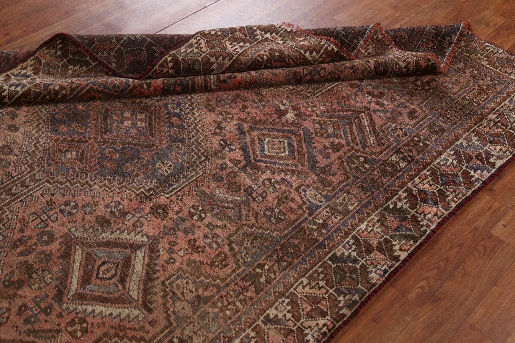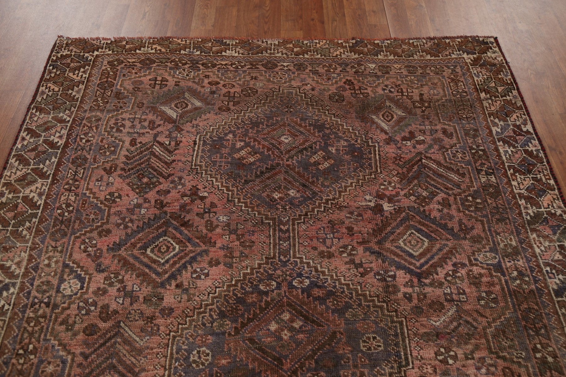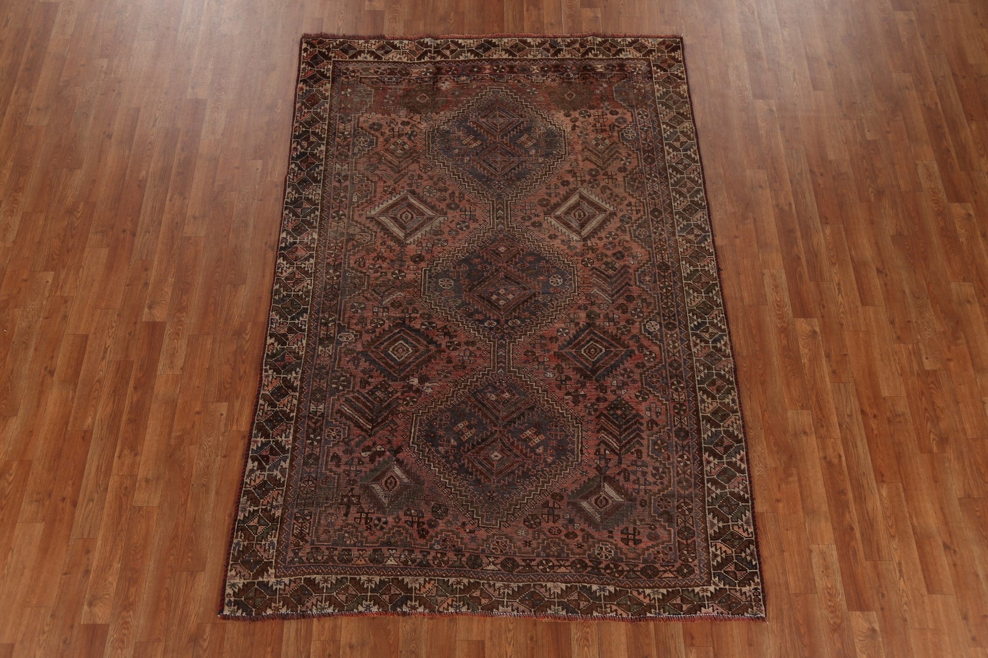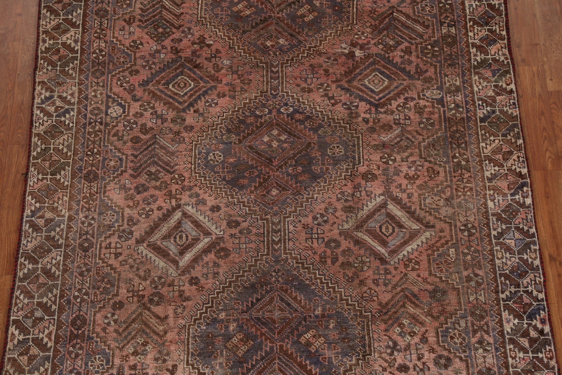 A Beautiful Genuine Persia ( Persia ) Shiraz rug is Hand Knotted by skillful weavers in Persia ( Persia ) with 100% Wool Material. This rug is in Very Good (Evenly Low Pile) condition. dimensions are 7' 8'' X 5' 3'' in foot and 234 X 160 in centimeter. the primary color is Pink.
