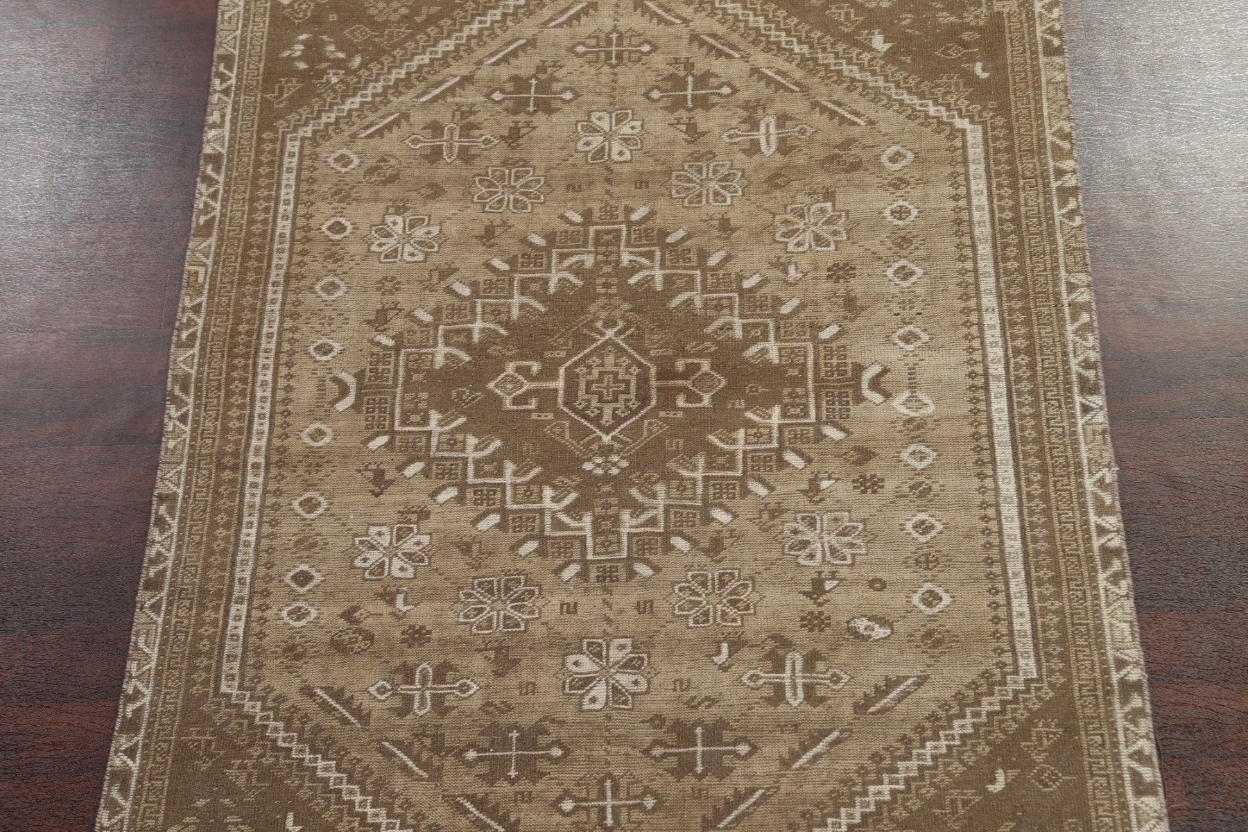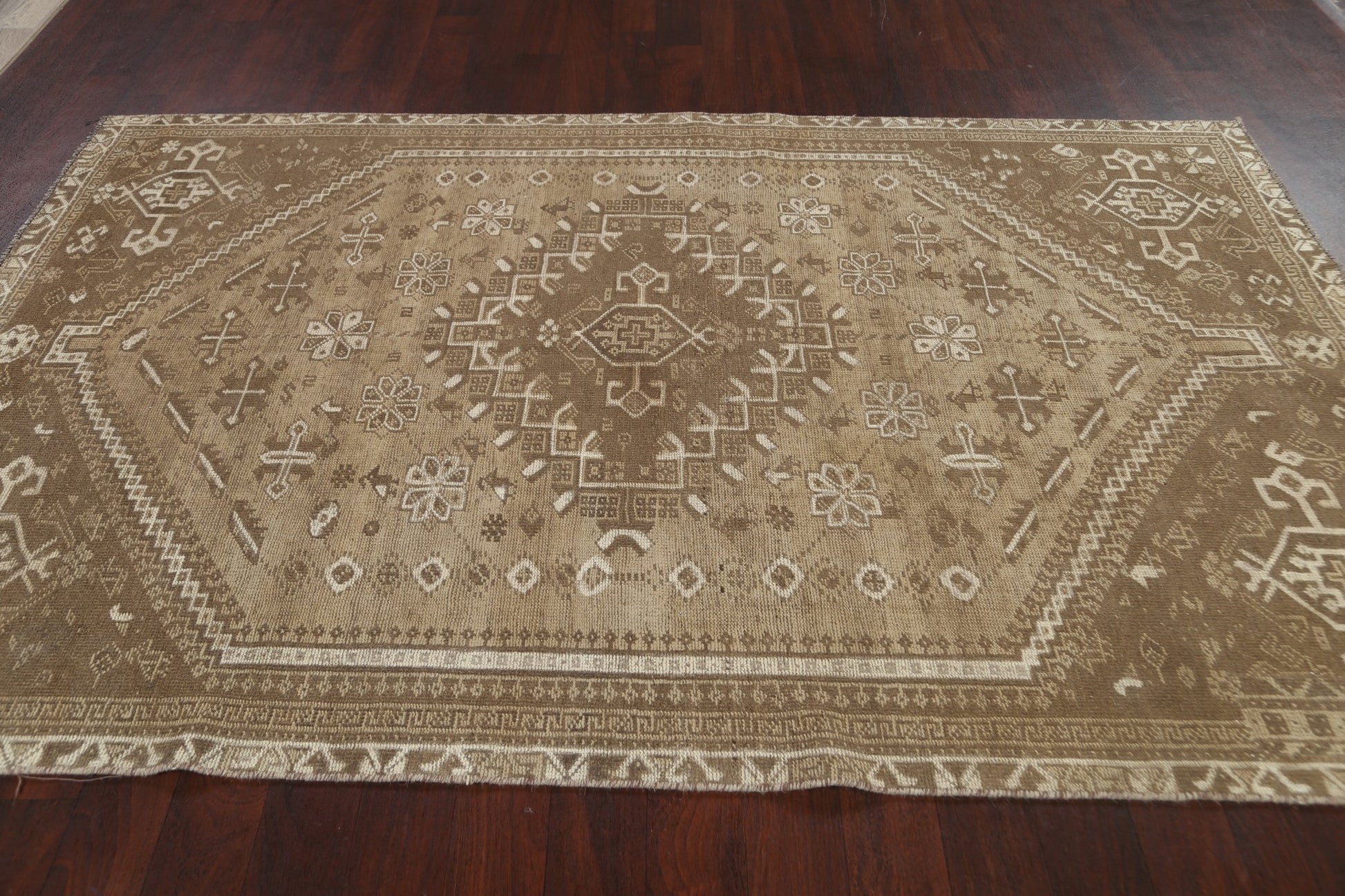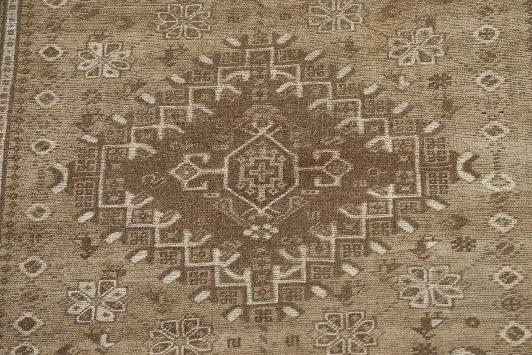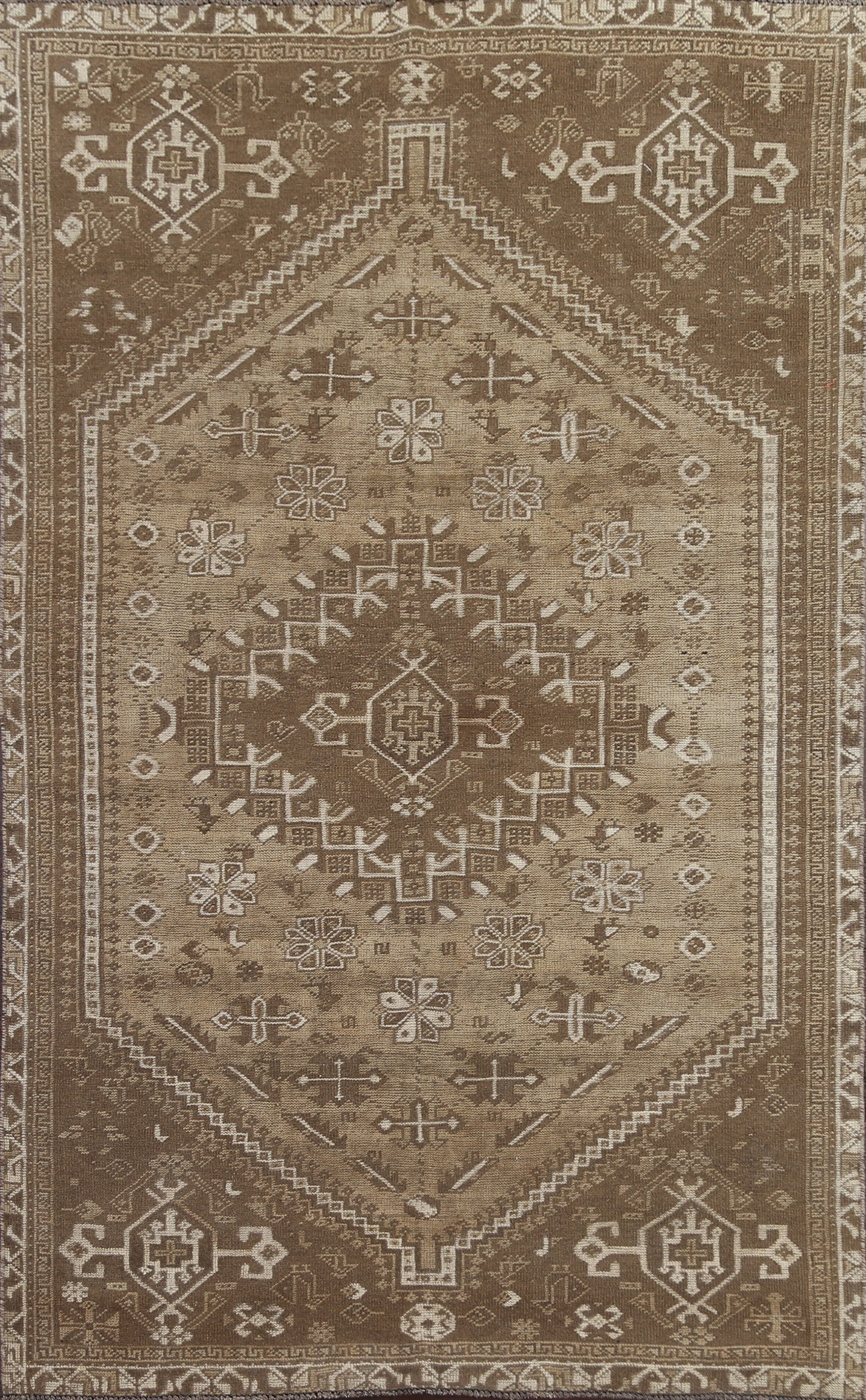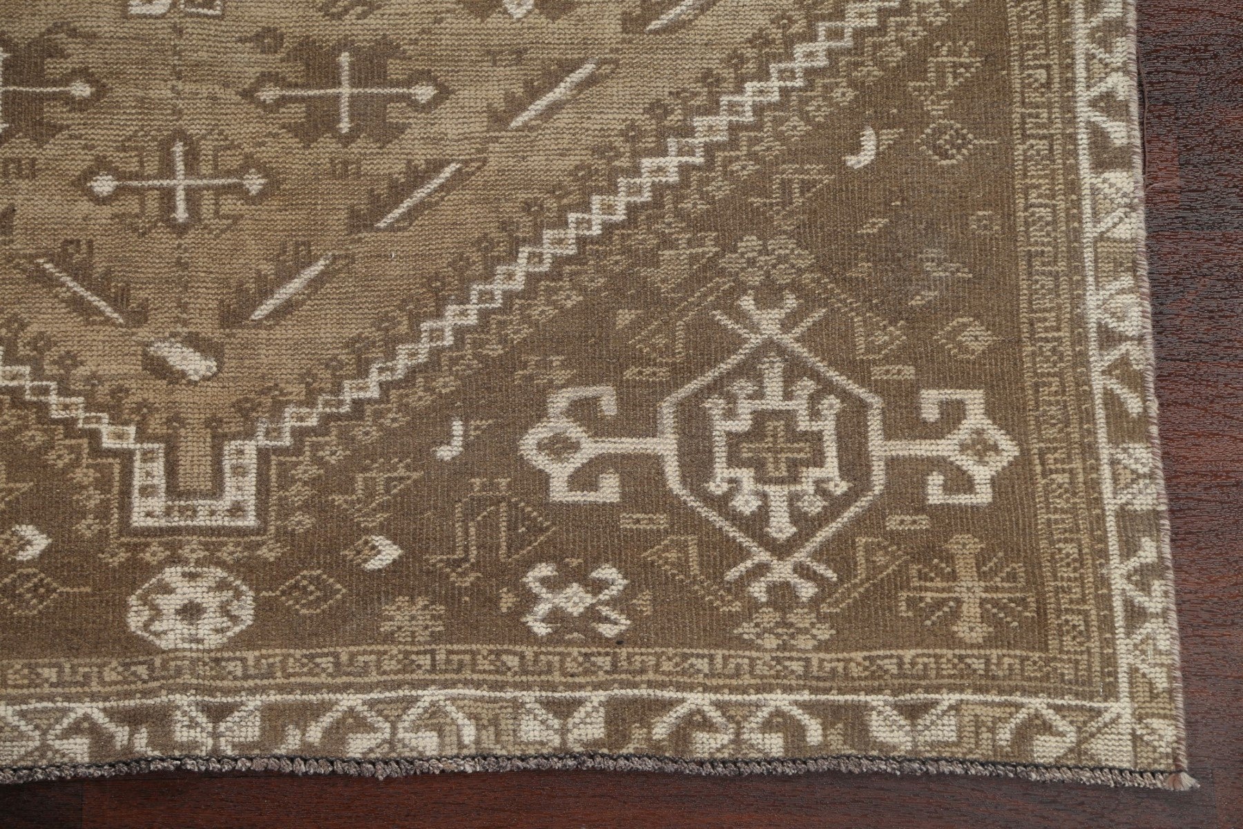 A Beautiful Genuine Persia ( Persia ) Shiraz rug is Hand Knotted by skillful weavers in Persia ( Persia ) with 100% Wool Material. This rug is in Very Good (Evenly Low Pile) condition. dimensions are 9' 11'' X 5' 8'' in foot and 302 X 173 in centimeter. the primary color is Brown.