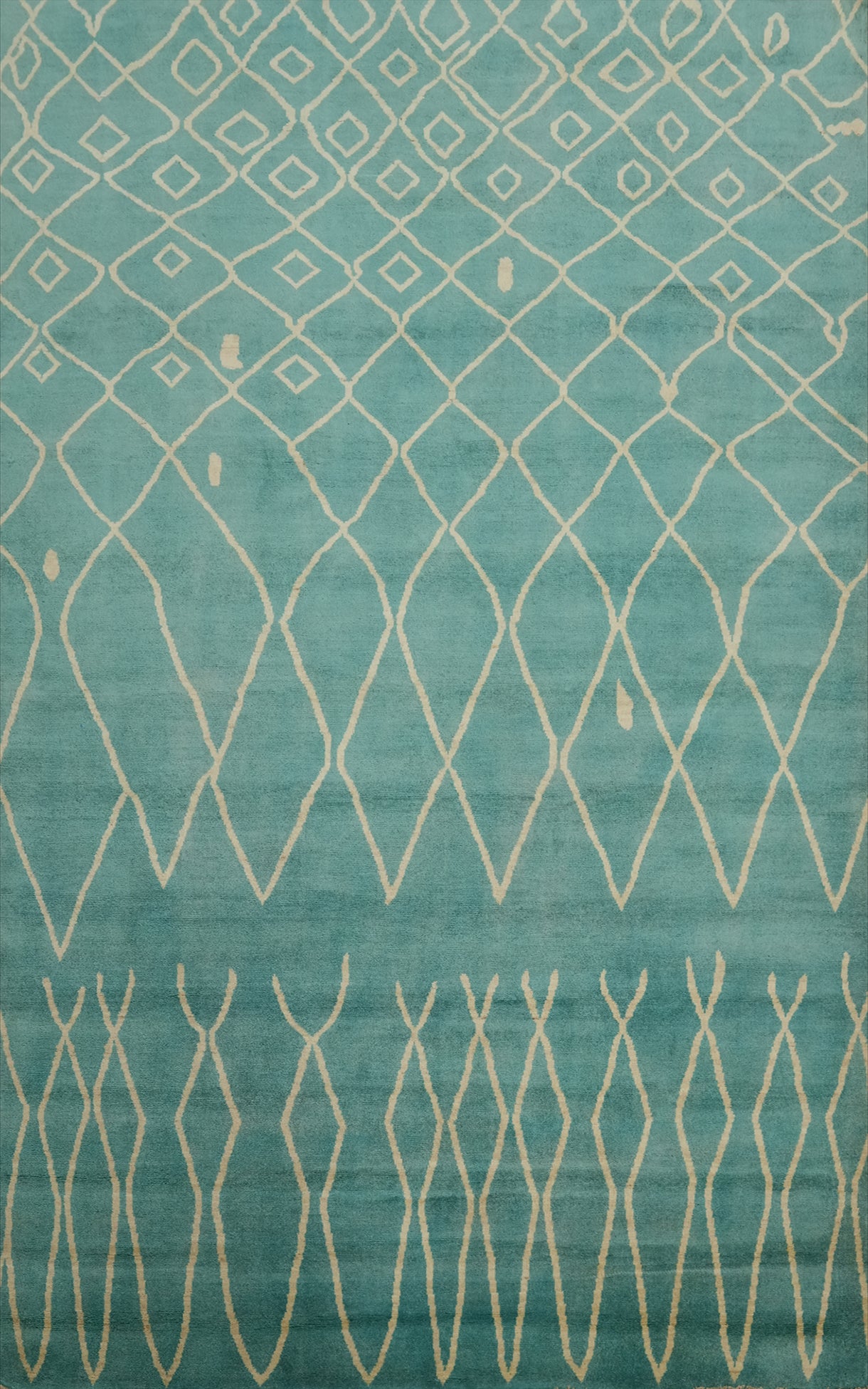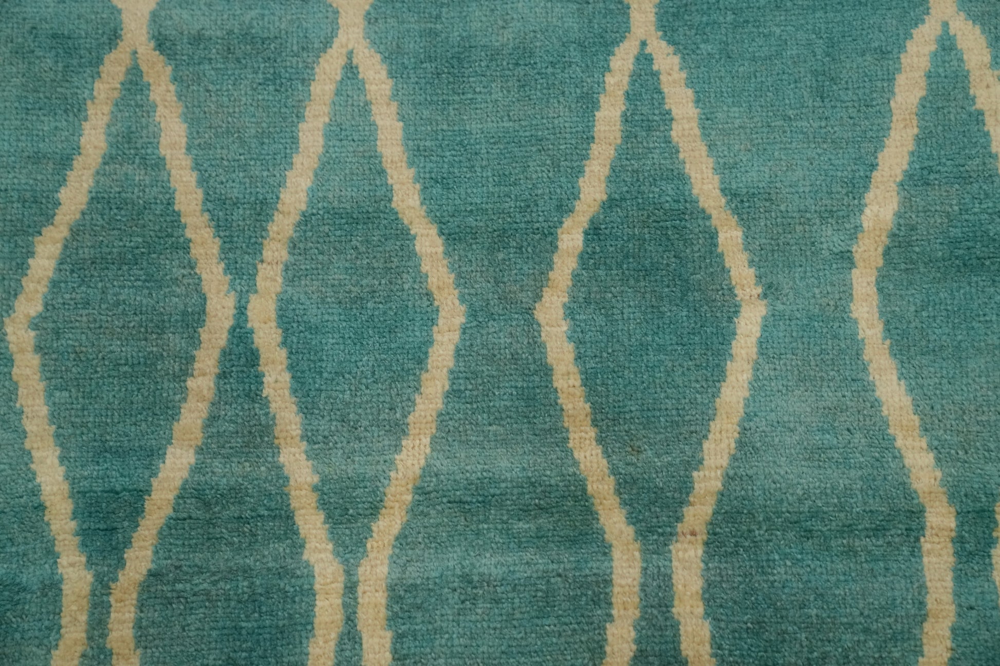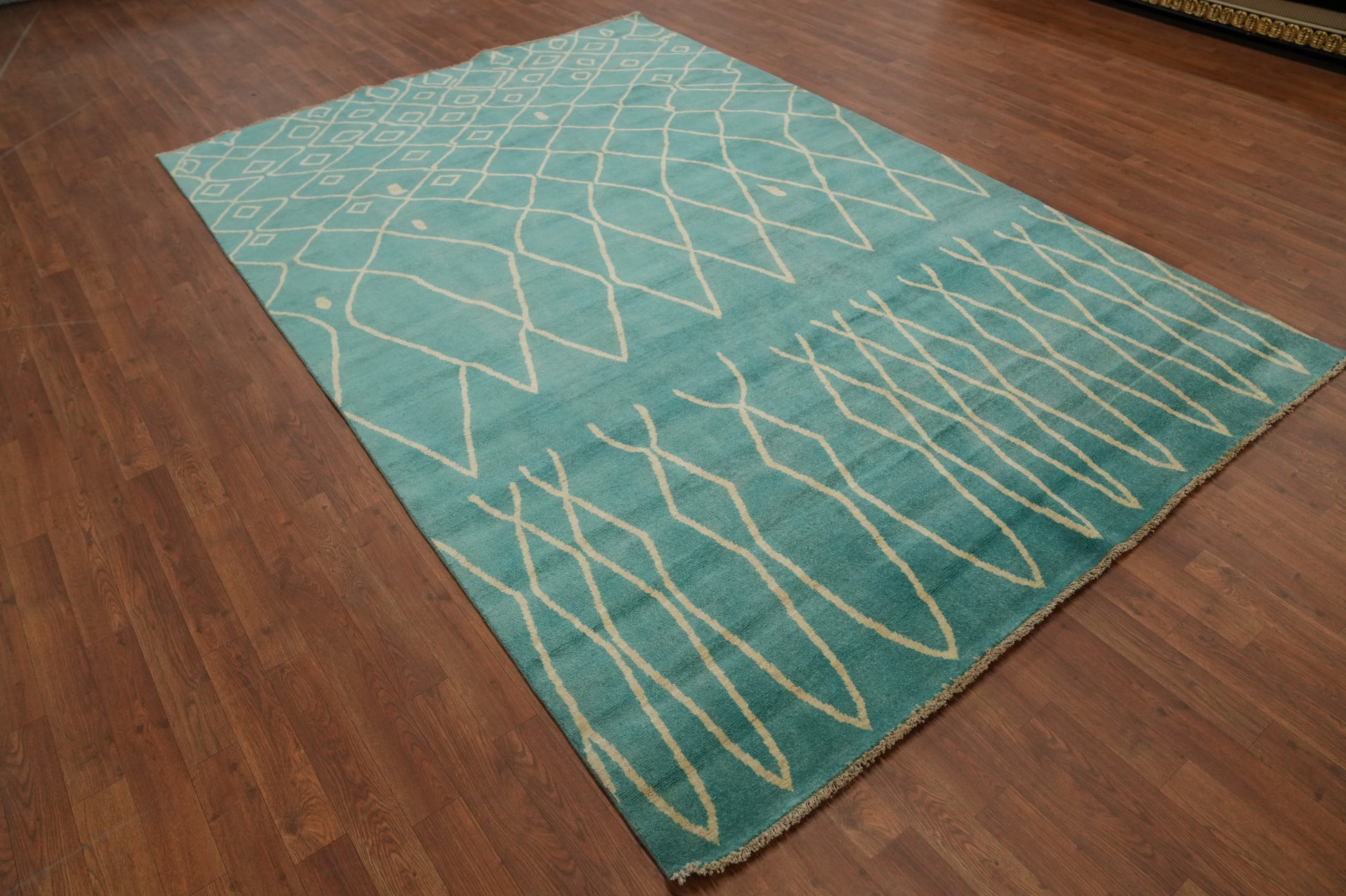 A Beautiful Genuine Pakistan Moroccan rug is Hand Knotted by skillful weavers in Pakistan with 100% Wool Material. This rug is in New, First Quality condition. dimensions are 9' 7'' X 6' 5'' in foot and 292 X 196 in centimeter. the primary color is Green.
