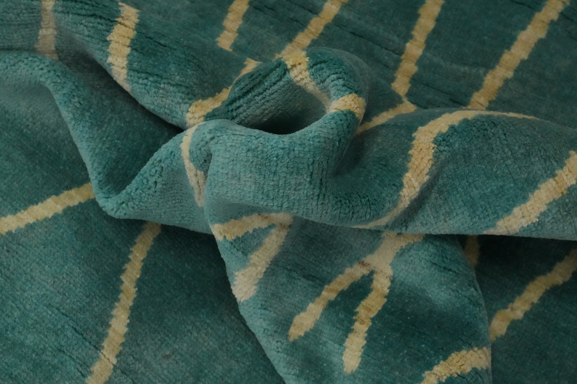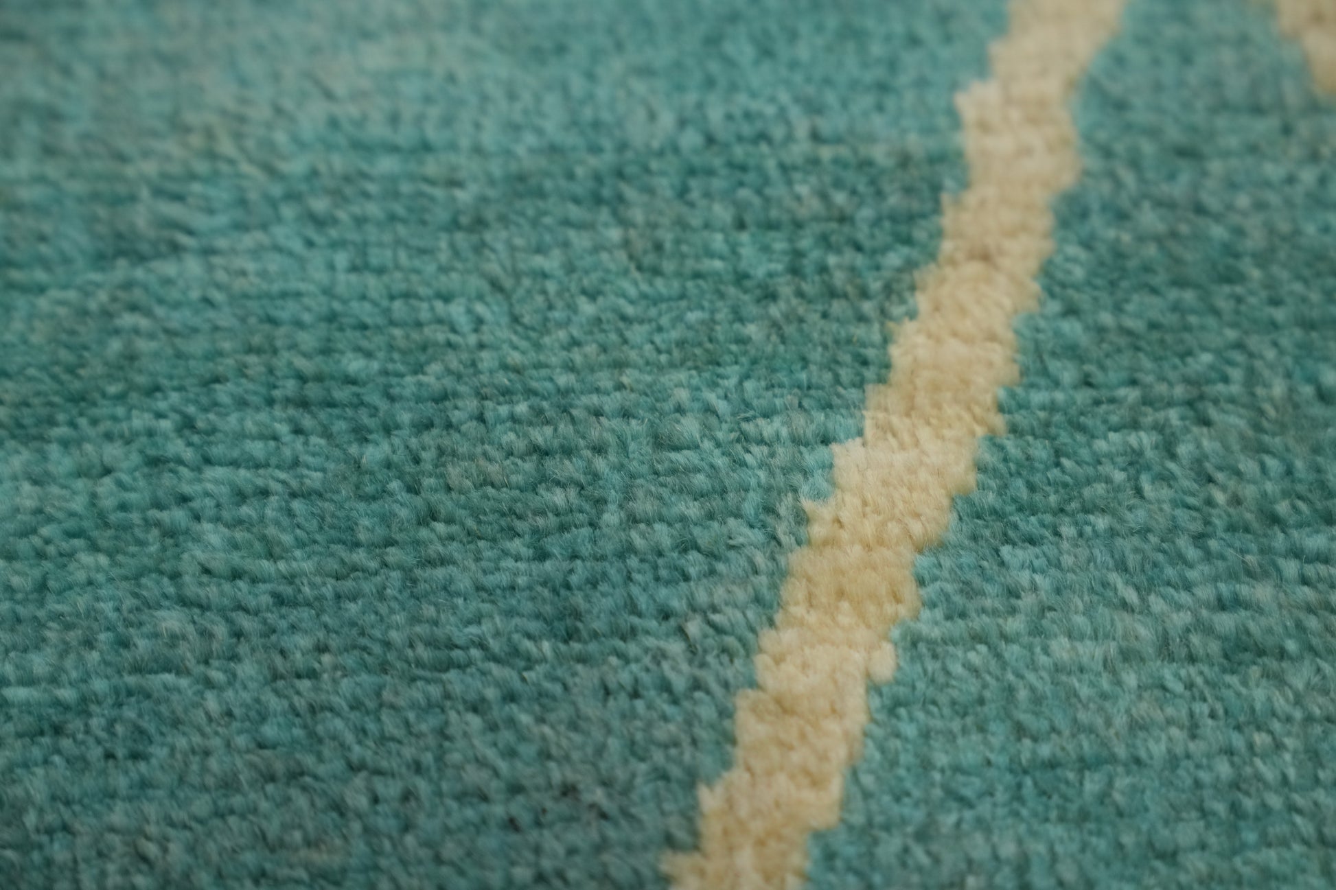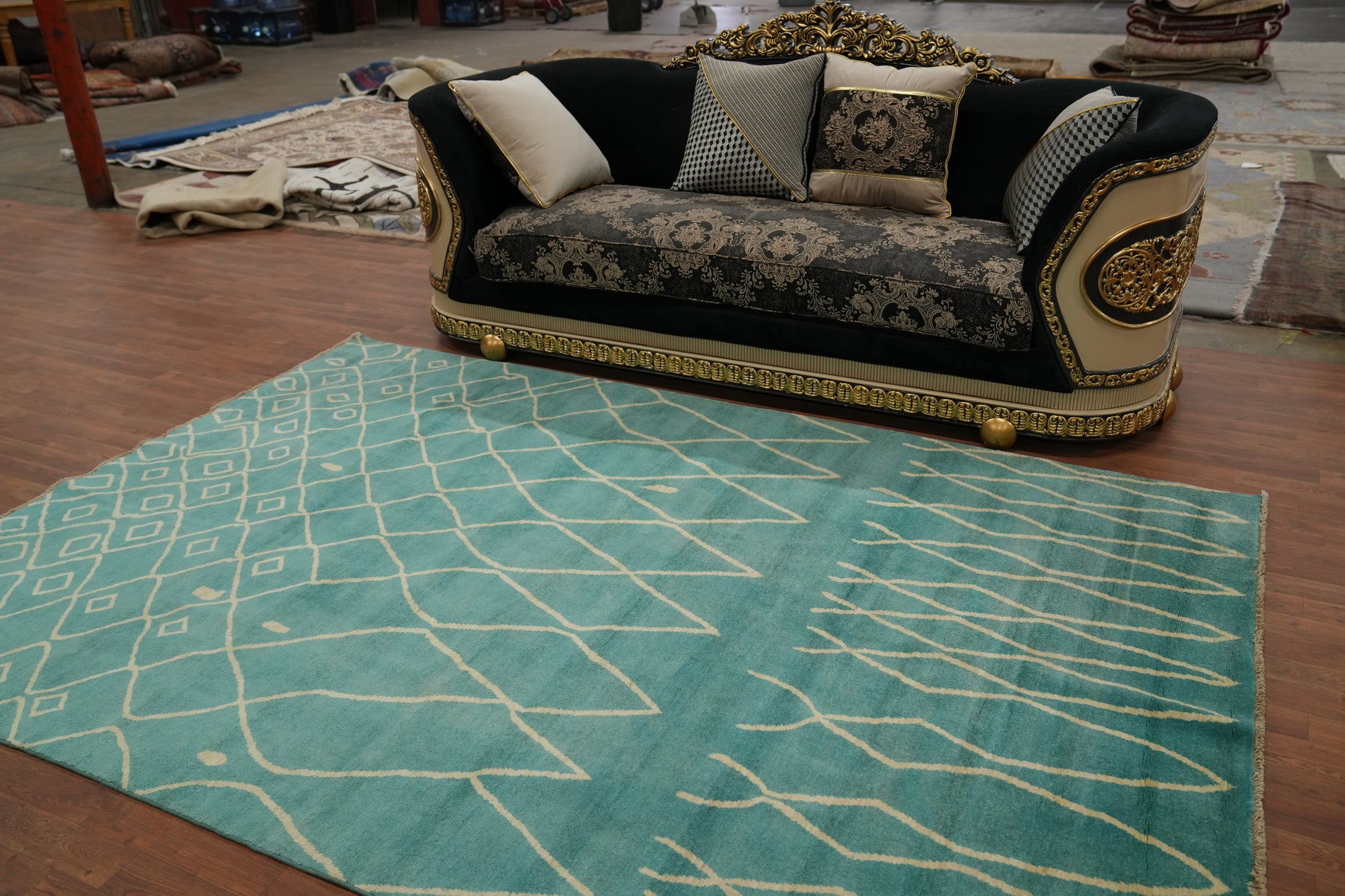 A Beautiful Genuine Pakistan Moroccan rug is Hand Knotted by skillful weavers in Pakistan with 100% Wool Material. This rug is in New, First Quality condition. dimensions are 9' 7'' X 6' 5'' in foot and 292 X 196 in centimeter. the primary color is Green.