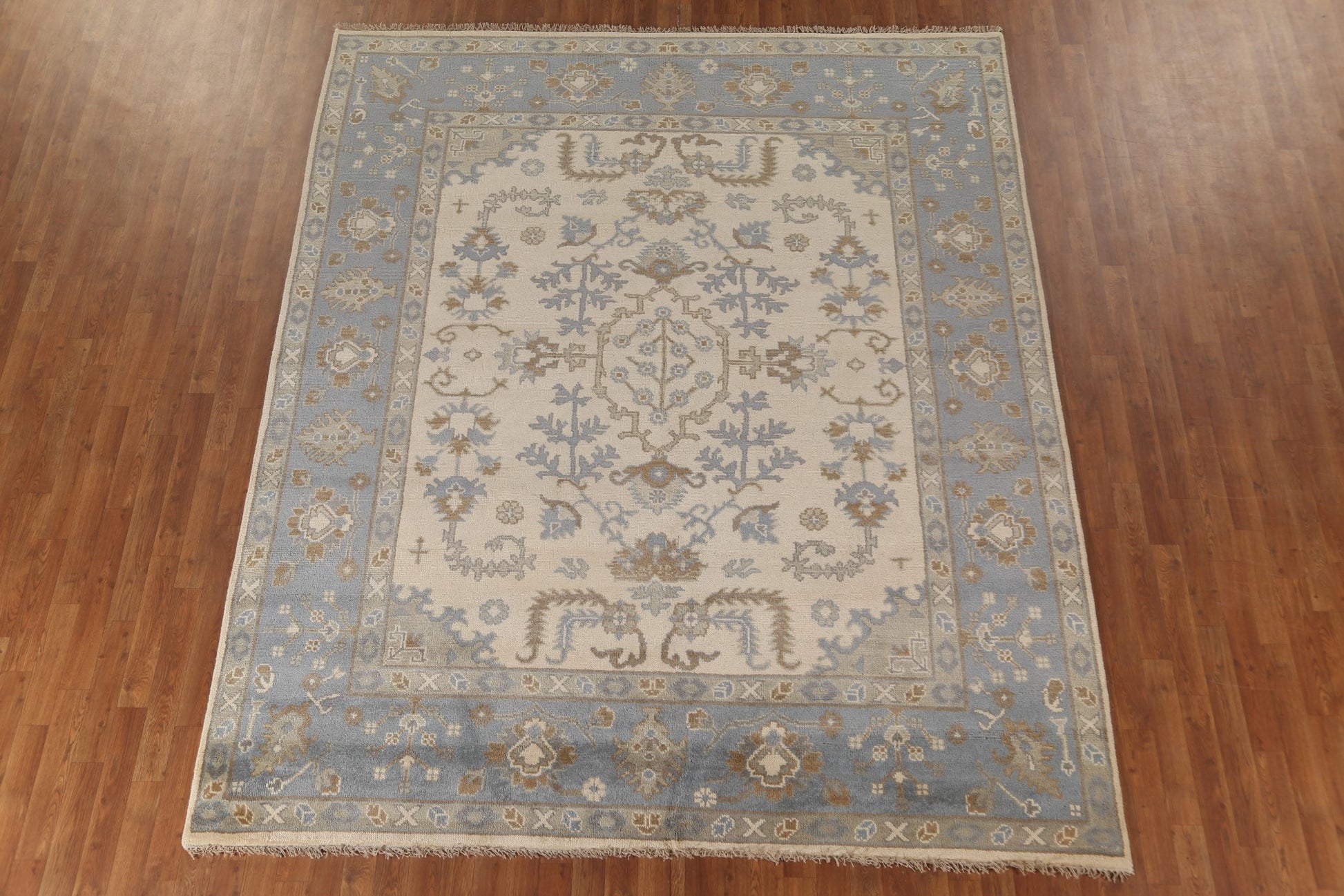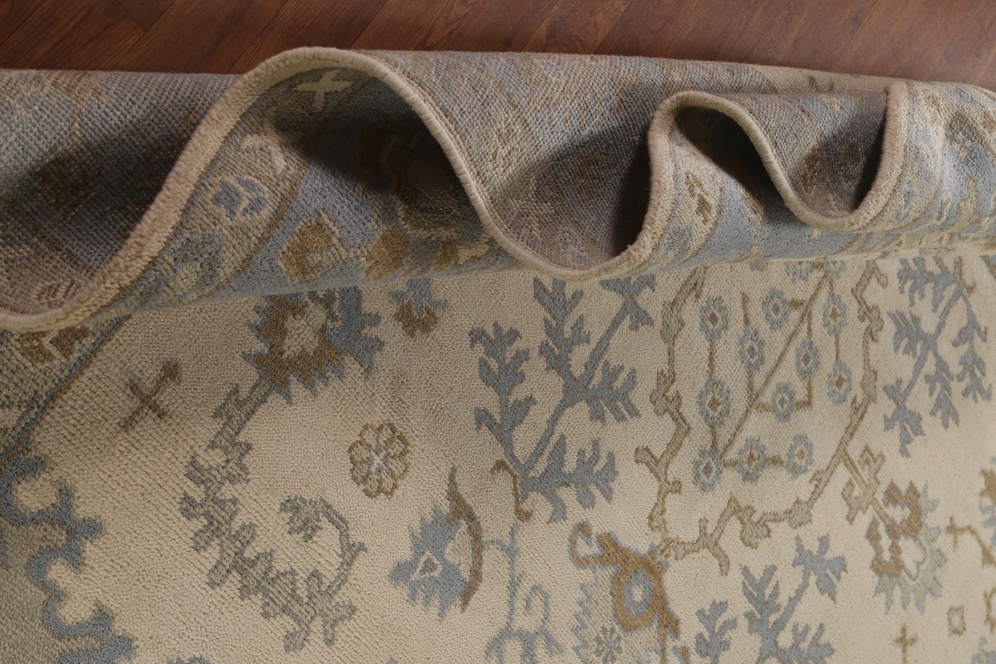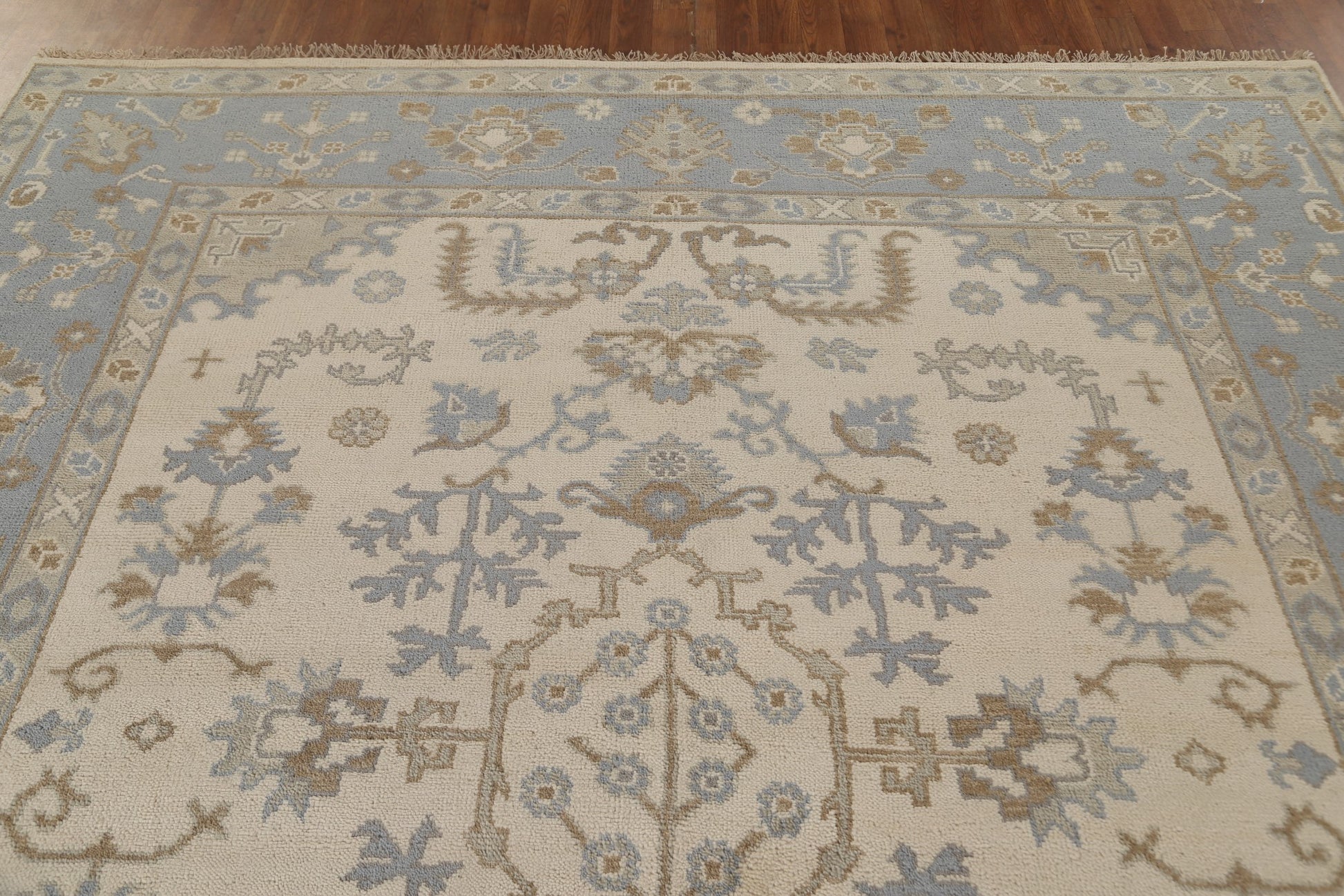 A Beautiful Genuine India Oushak rug is Hand Knotted by skillful weavers in India with 100% Wool Material. This rug is in New, First Quality condition. dimensions are 9' 7'' X 8' 0'' in foot and 292 X 244 in centimeter. the primary color is Beige & Ivories.