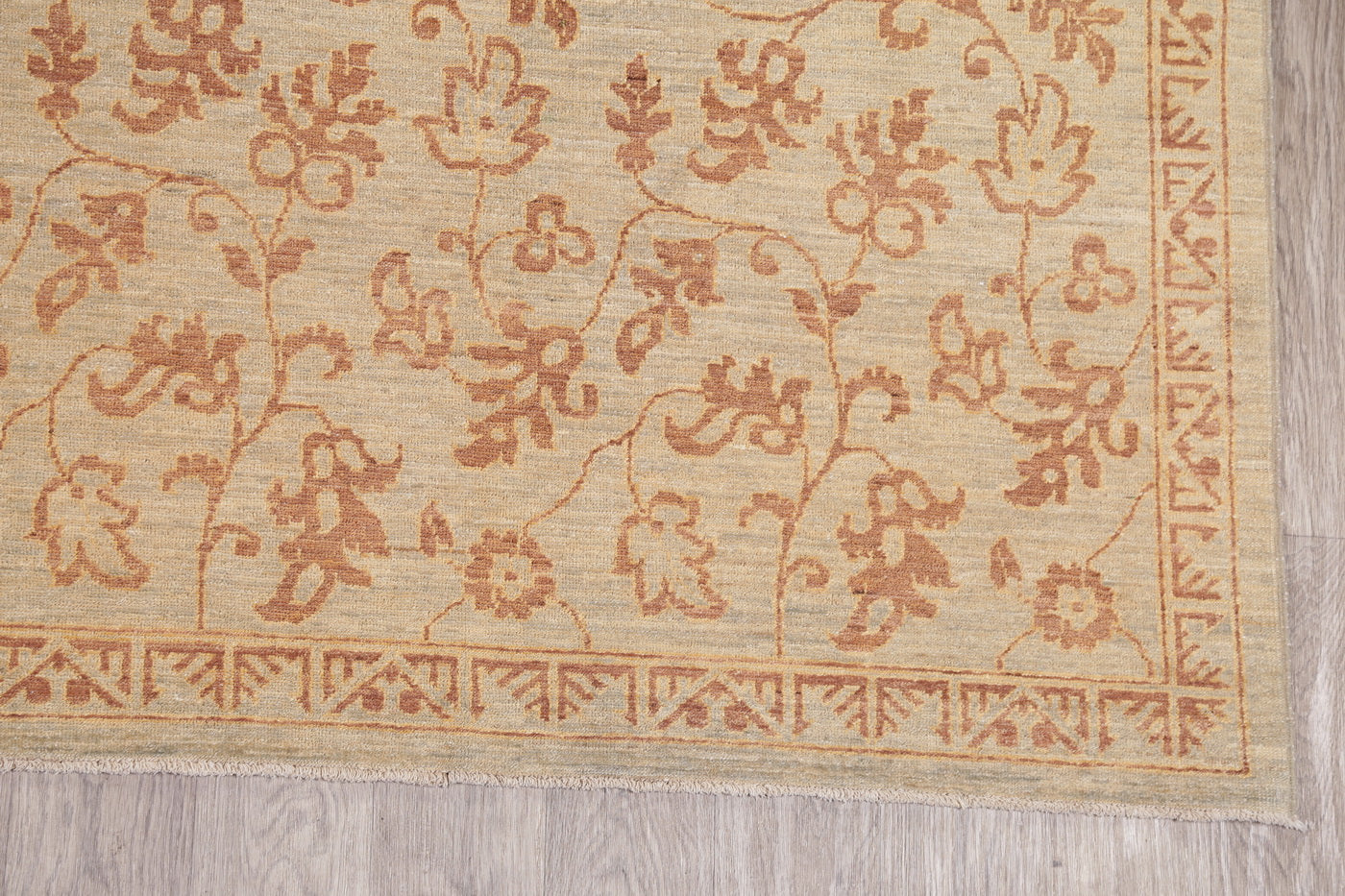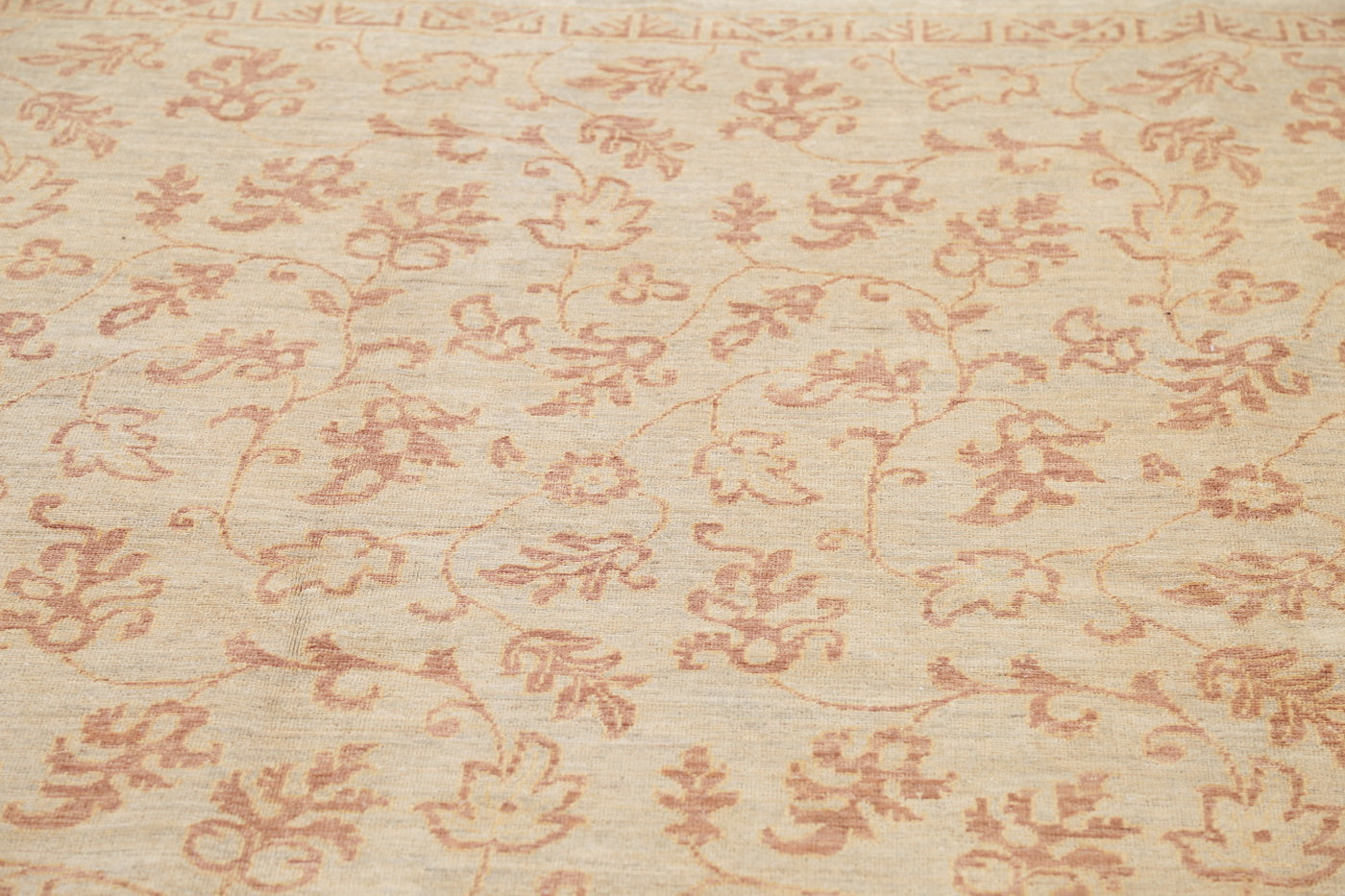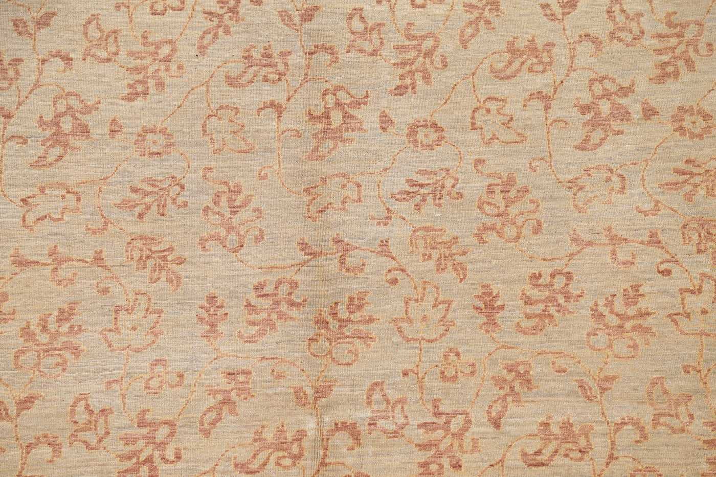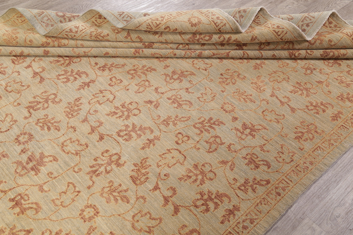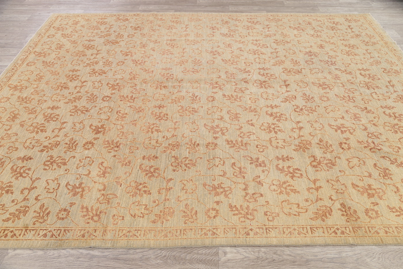 A Beautiful Genuine Pakistan Oushak rug is Hand Knotted by skillful weavers in Pakistan with 100% Wool Material. This rug is in New, First Quality condition. dimensions are 11' 2'' X 8' 7'' in foot and 340 X 262 in centimeter. the primary color is Beige & Ivories.