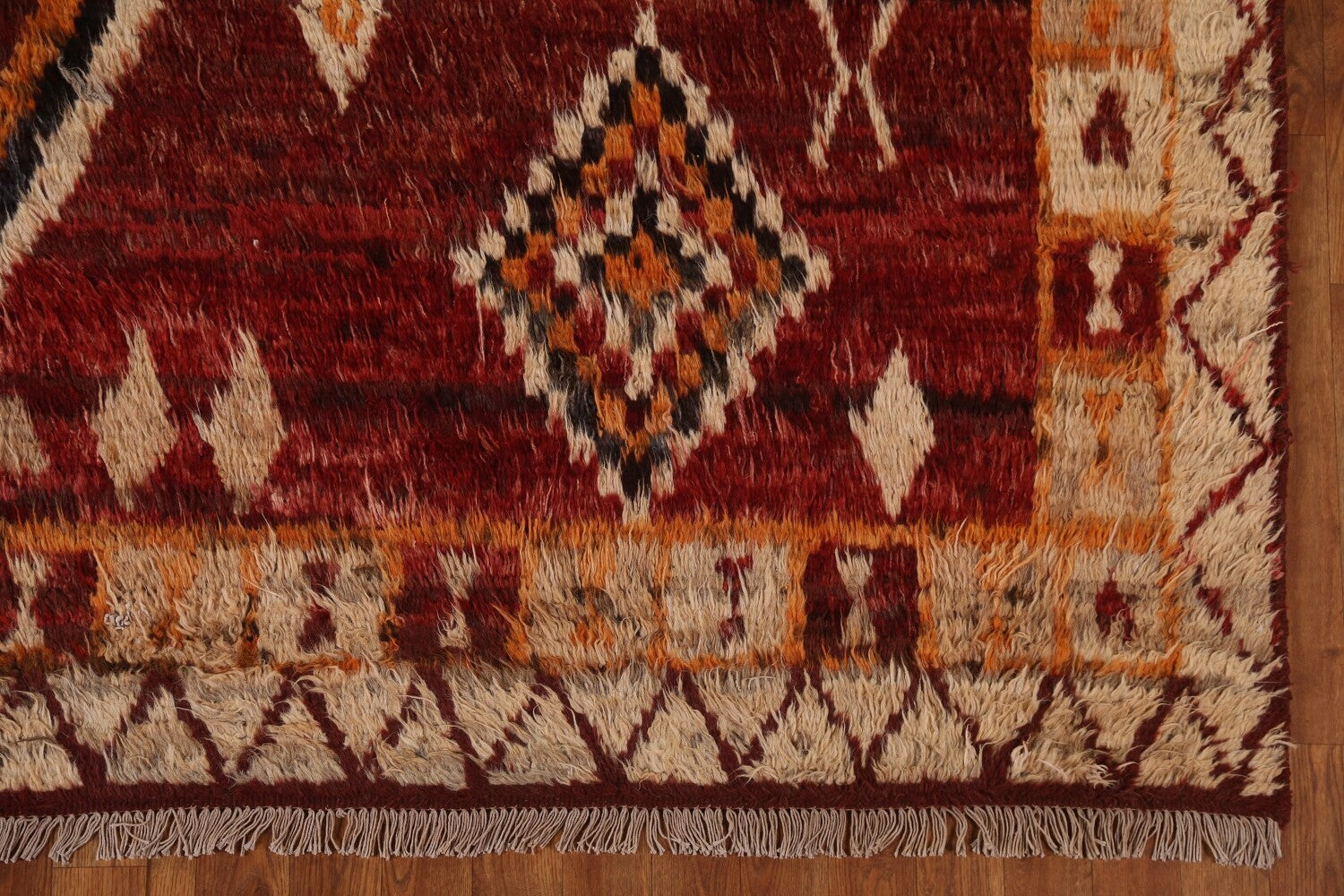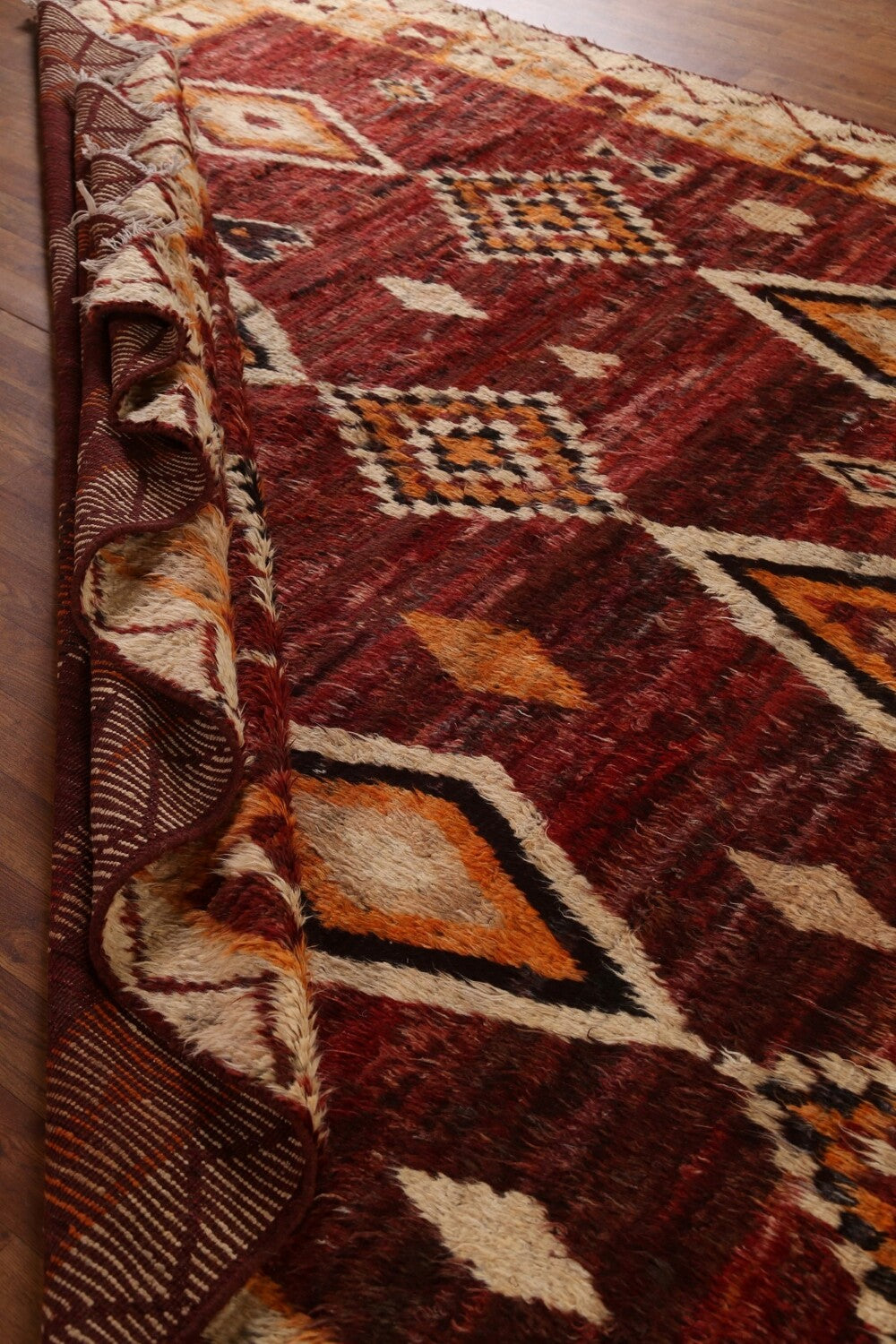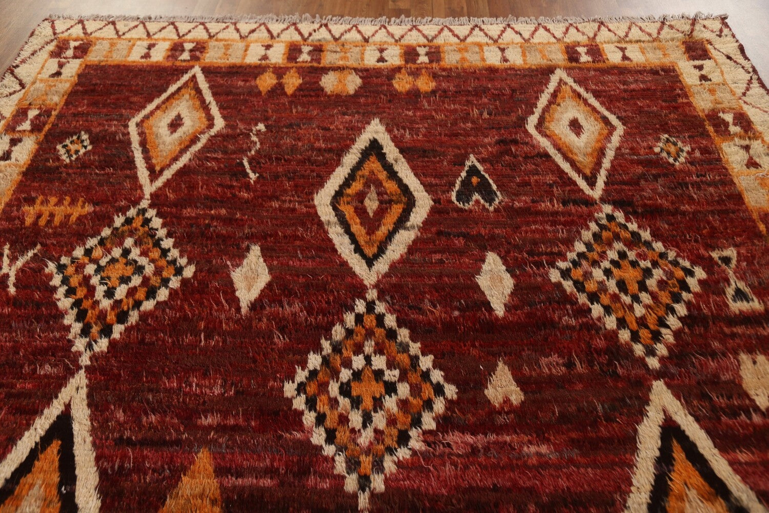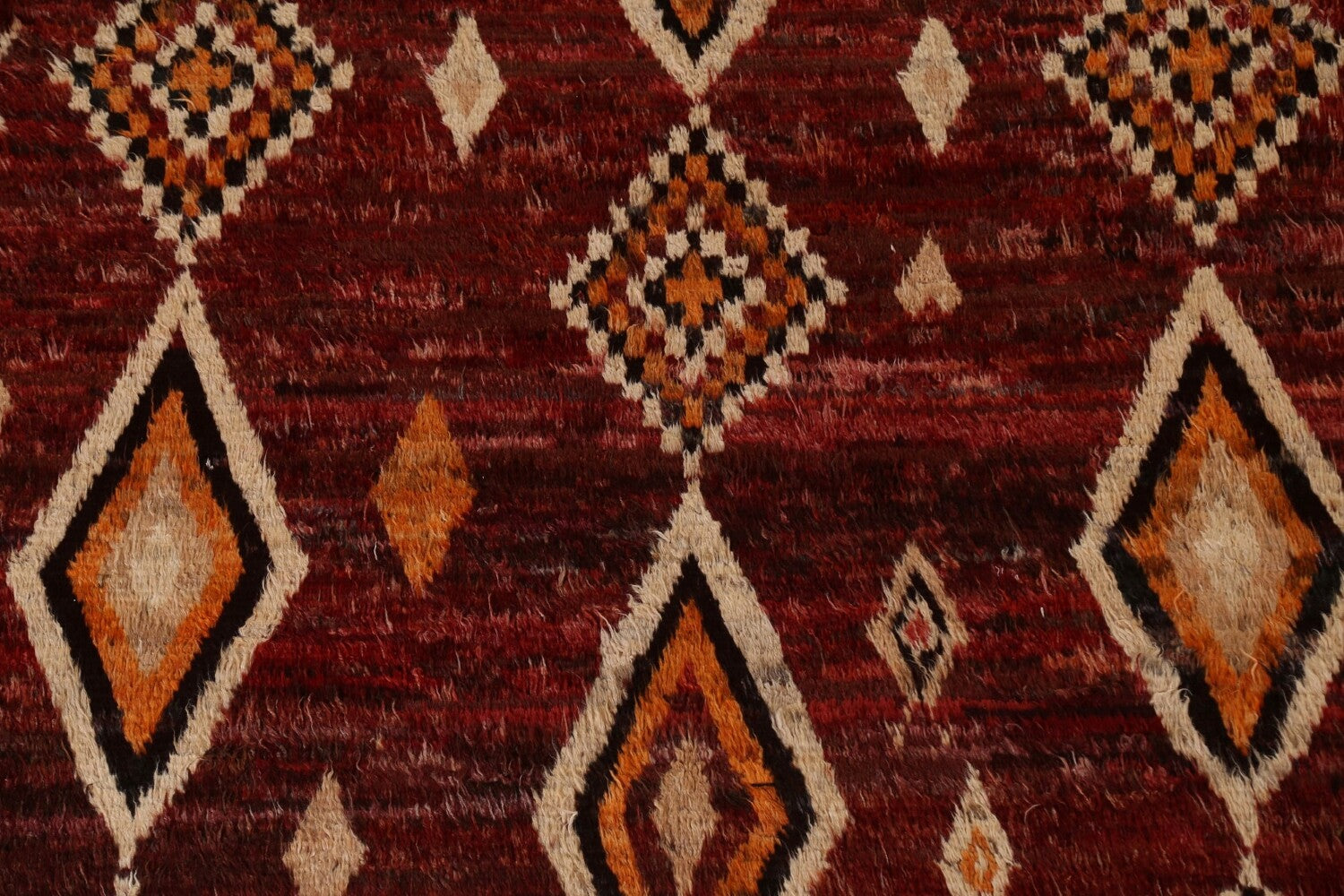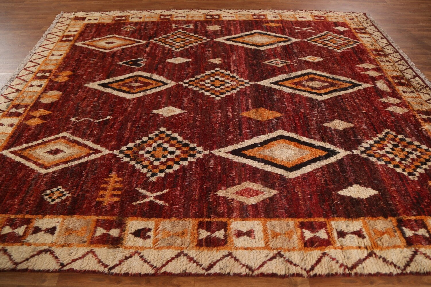 A Beautiful Genuine Pakistan Moroccan rug is Hand Knotted by skillful weavers in Pakistan with 100% Wool Material. This rug is in condition. dimensions are 9' 10'' X 8' 3'' in foot and 300 X 251 in centimeter. the primary color is Red.