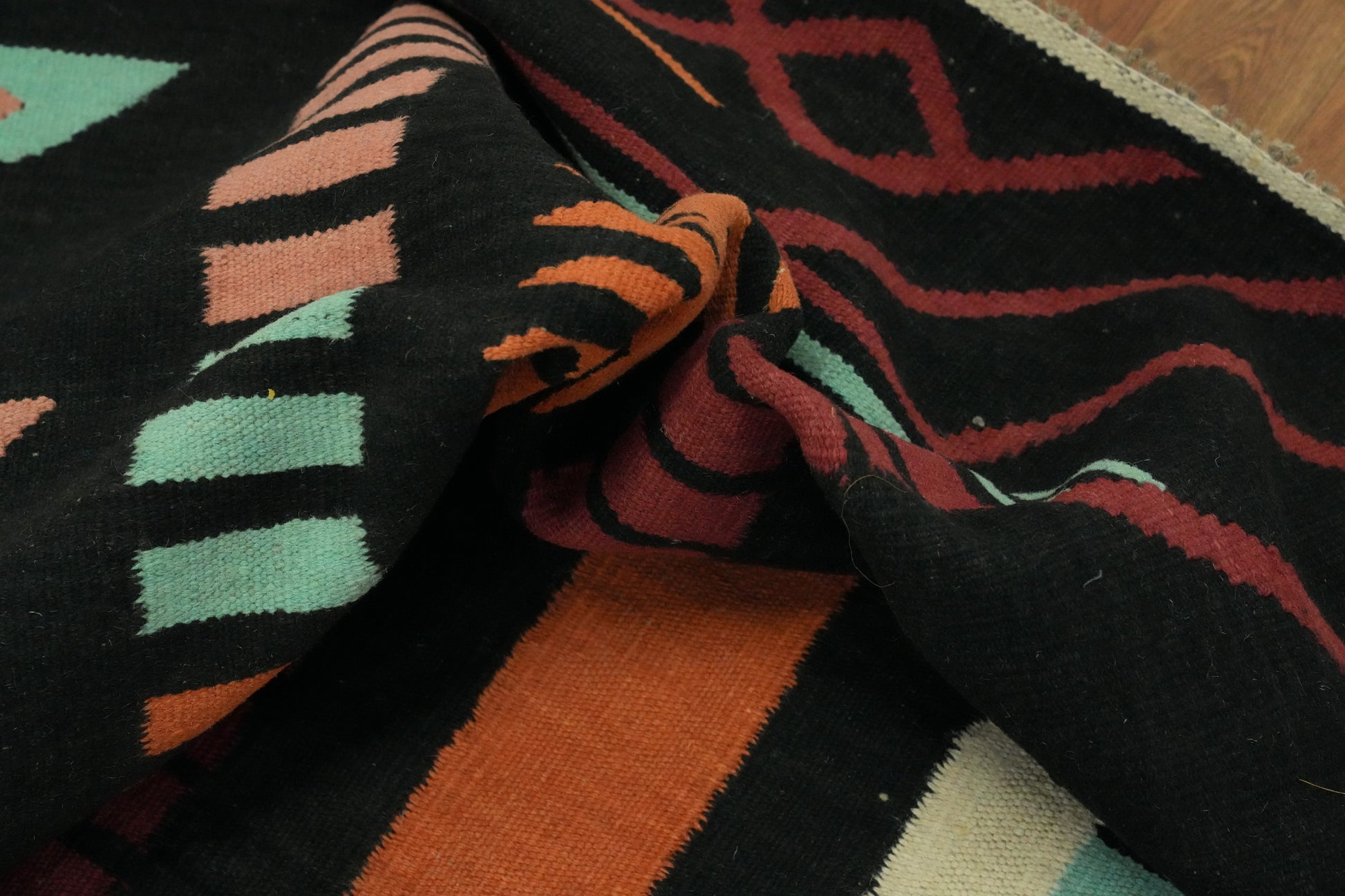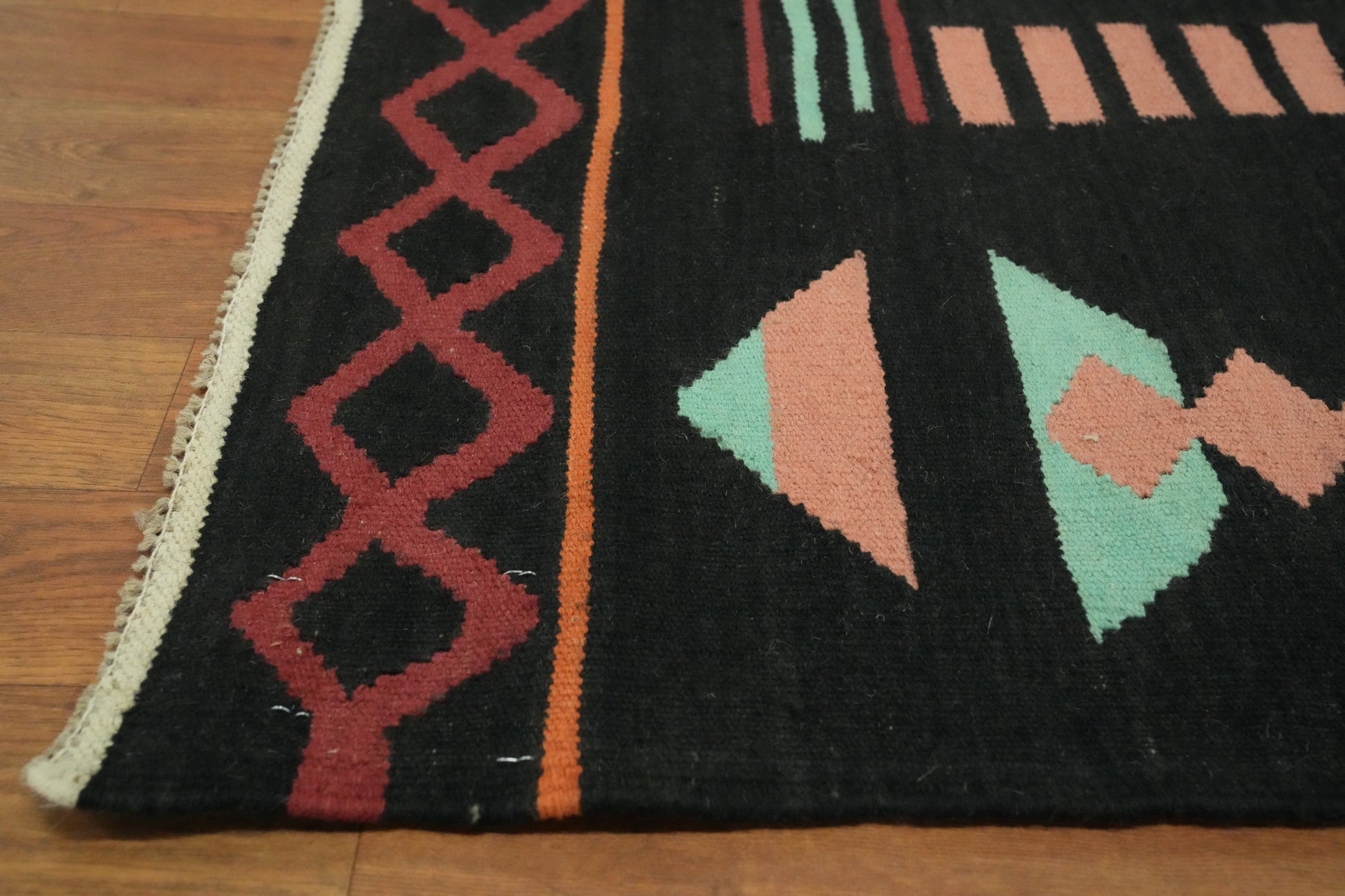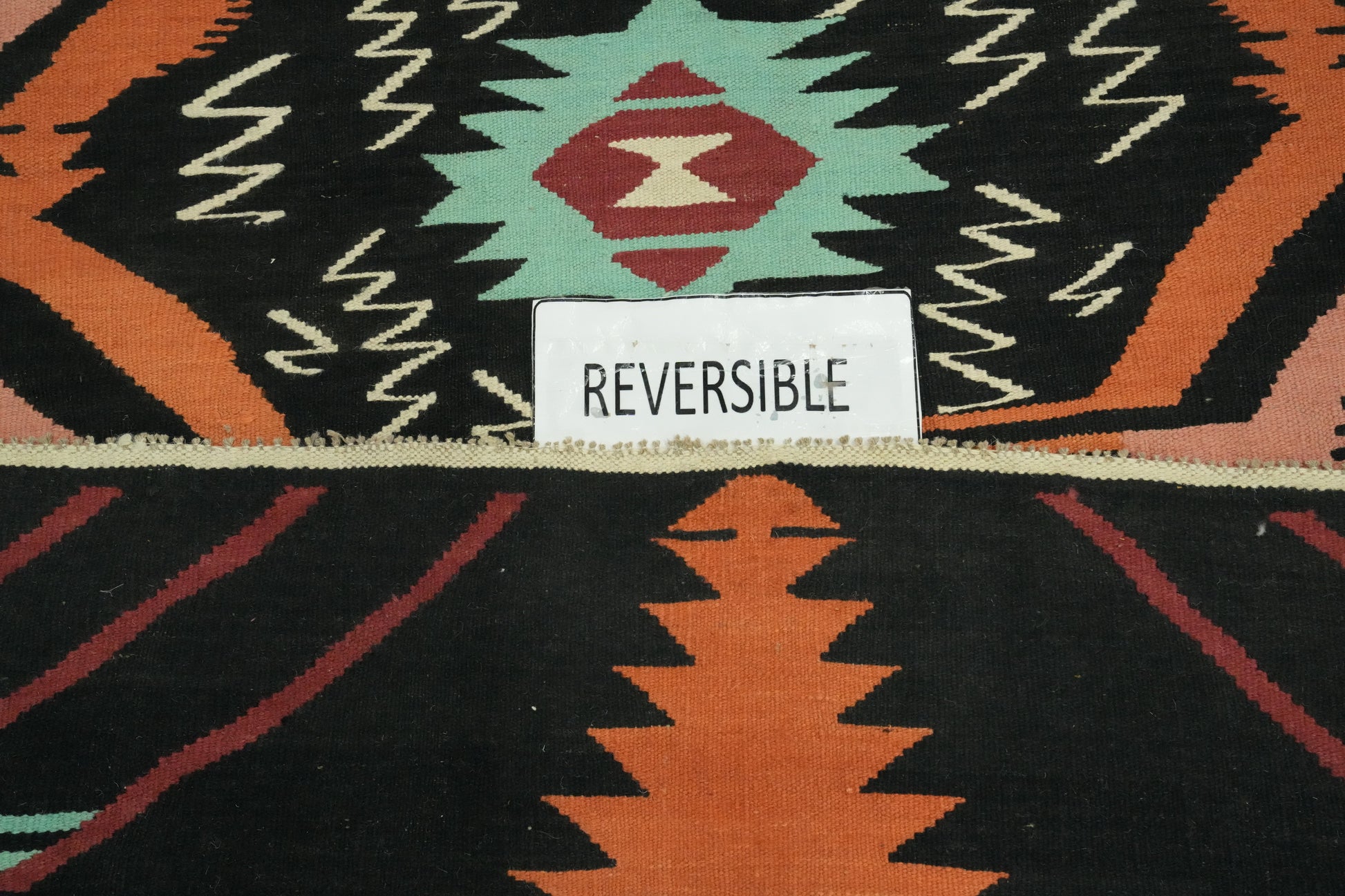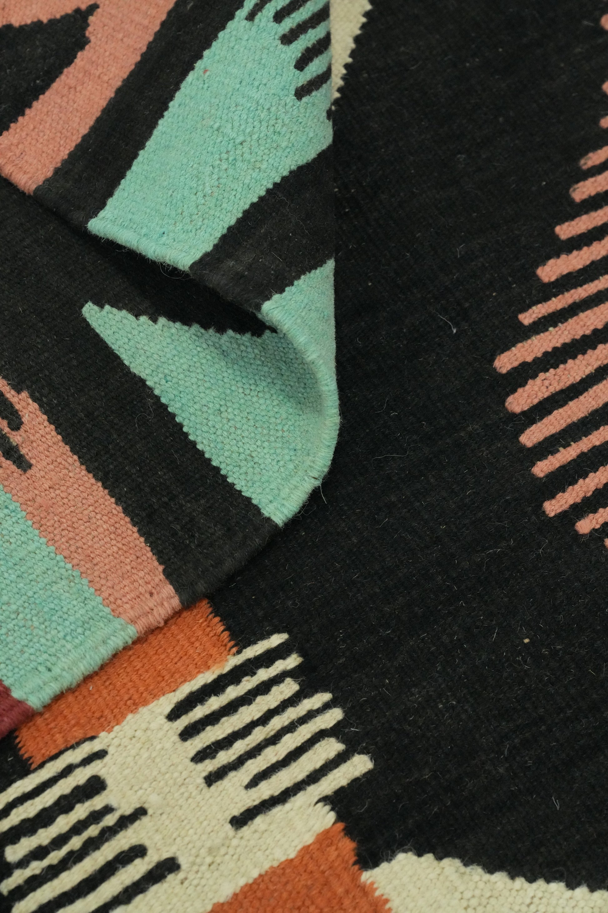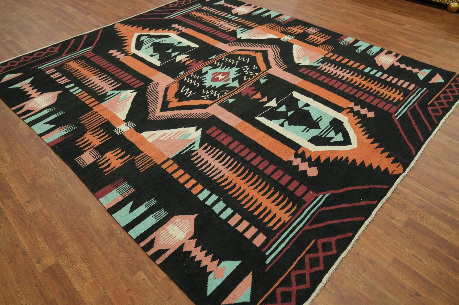 A Beautiful Genuine Pakistan Kilim rug is Hand Woven by skillful weavers in Pakistan with 100% Wool Material. This rug is in New, First Quality condition. dimensions are 9' 10'' X 8' 5'' in foot and 300 X 257 in centimeter. the primary color is Black.
