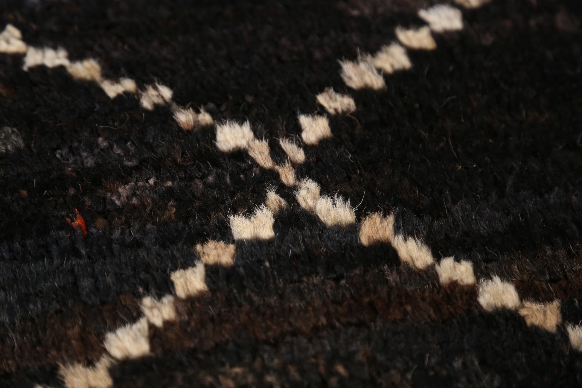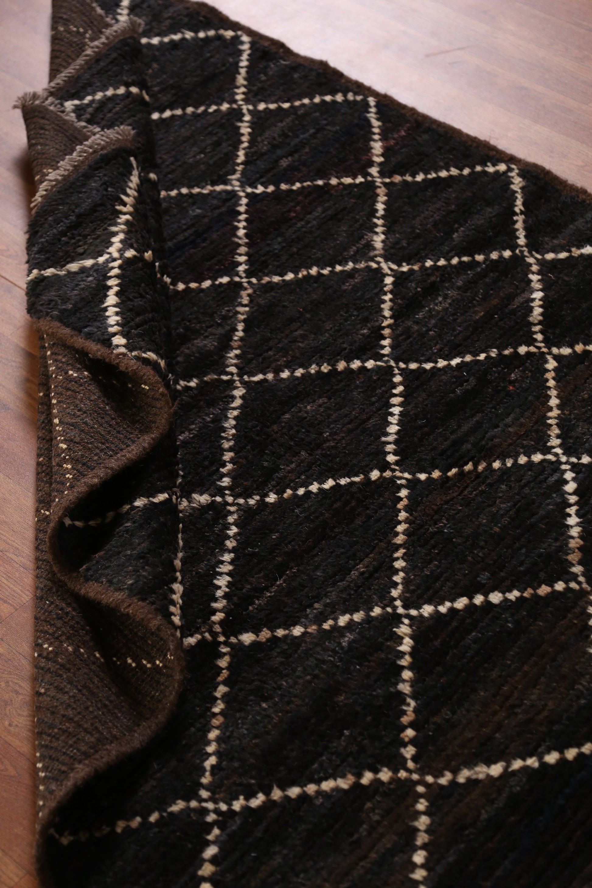 A Beautiful Genuine Pakistan Moroccan rug is Hand Knotted by skillful weavers in Pakistan with 100% Wool Material. This rug is in New, First Quality condition. dimensions are 6' 1'' X 4' 1'' in foot and 185 X 124 in centimeter. the primary color is Black.