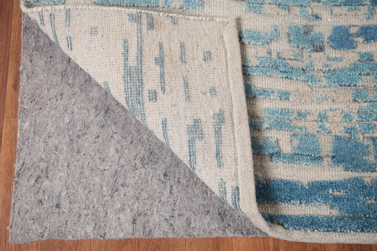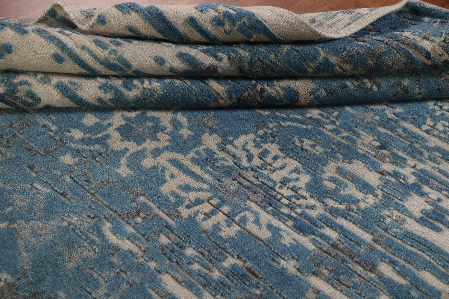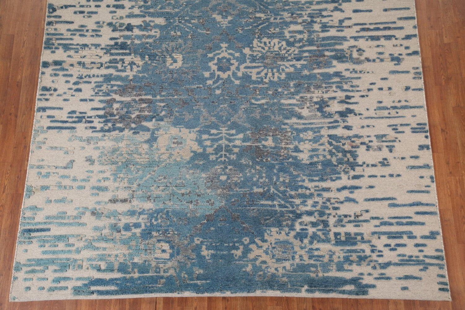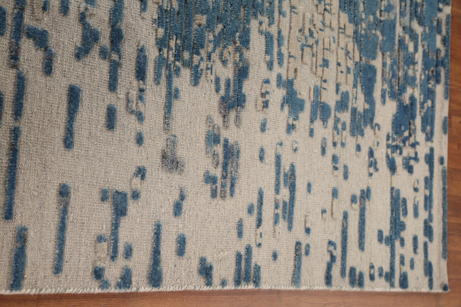 A Beautiful Genuine India Abstract rug is Hand Knotted by skillful weavers in India with 100% Wool Material. This rug is in New, First Quality condition. dimensions are 10' 0'' X 8' 1'' in foot and 305 X 246 in centimeter. the primary color is Navy Blue & Blues.